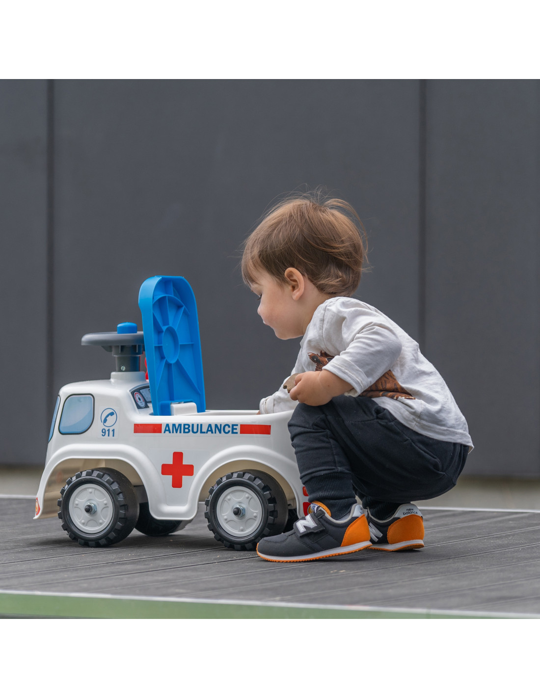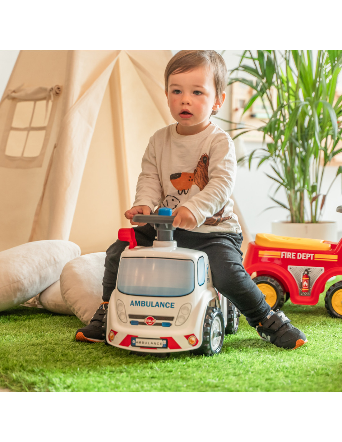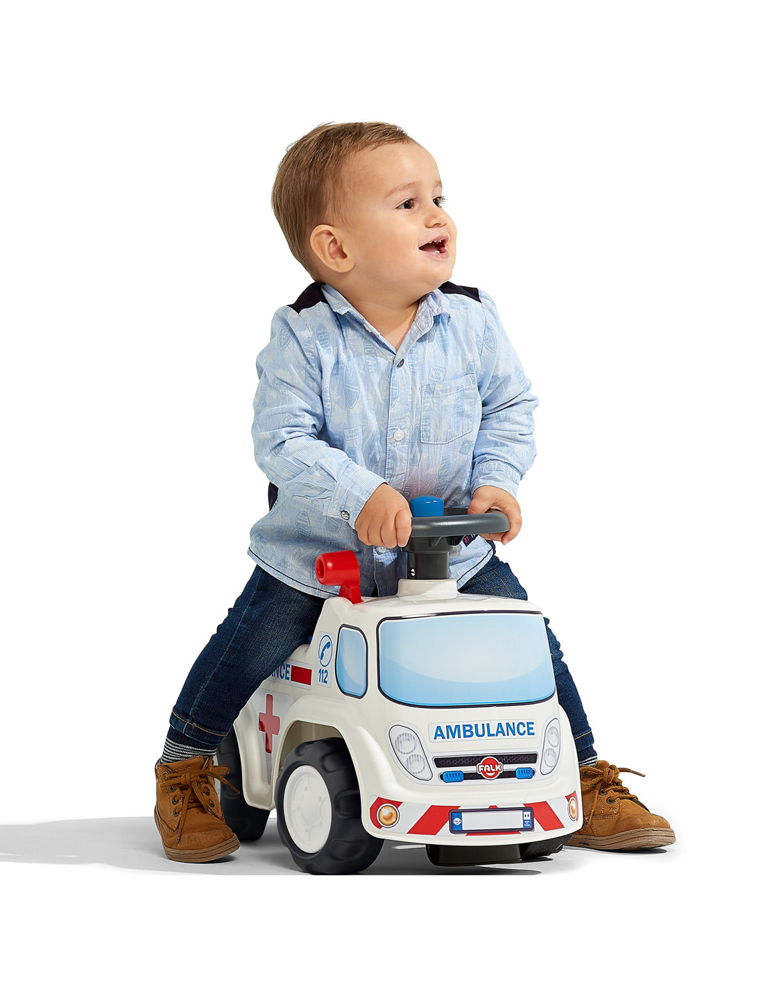 Jeździk Ambulans od marki FALK to wspaniały pojazd dla najmłodszych ratowników, wyprodukowany w 100% we Francji. Wyposażony w wygodną kierownicę z klaksonem, pozwala dziecku łatwo manewrować i ostrzegać o swoim przybyciu podczas domowych akcji ratunkowych. Pod podnoszonym siedziskiem znajduje się praktyczny schowek, w którym mały doktor może ukryć wszystkie niezbędne akcesoria medyczne. Dodatkową atrakcją pojazdu jest dołączona do zestawu personalizowana tablica rejestracyjna, na której można wpisać imię małego bohatera.