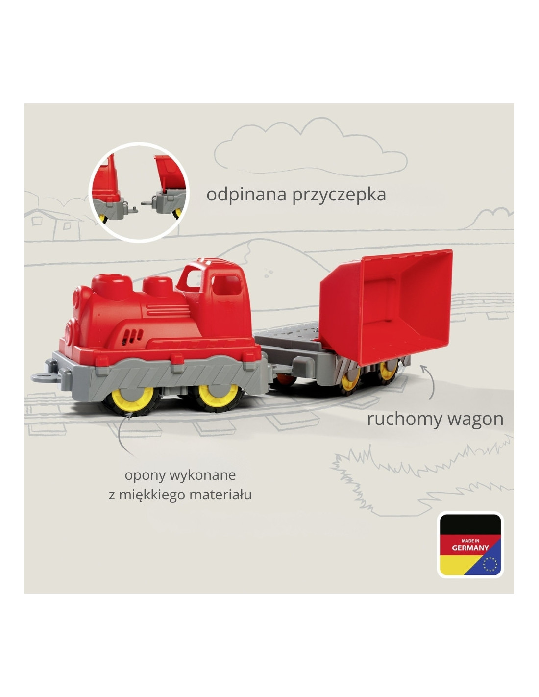 - 2-częściowy zestaw – Lokomotywa z odłączanym wagonem-wywrotką pozwala na różnorodne scenariusze zabawy. Transportuj, łącz i rozdzielaj – jak na prawdziwym placu budowy!