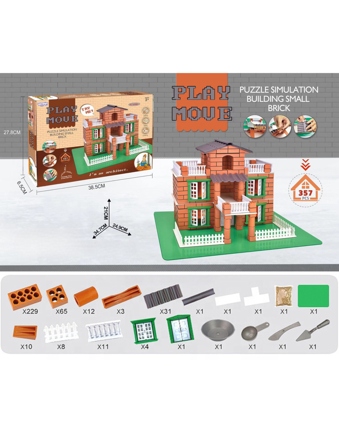 Zestaw do budowania z cegieł - willa marki Woopie To kreatywny zestaw do budowania domu z małych cegiełek, który pozwala dziecku wcielić się w rolę małego architekta i murarza, tworząc realistyczne konstrukcje krok po kroku z użyciem bezpiecznej „zaprawy” i akcesoriów jak w prawdziwej budowie.