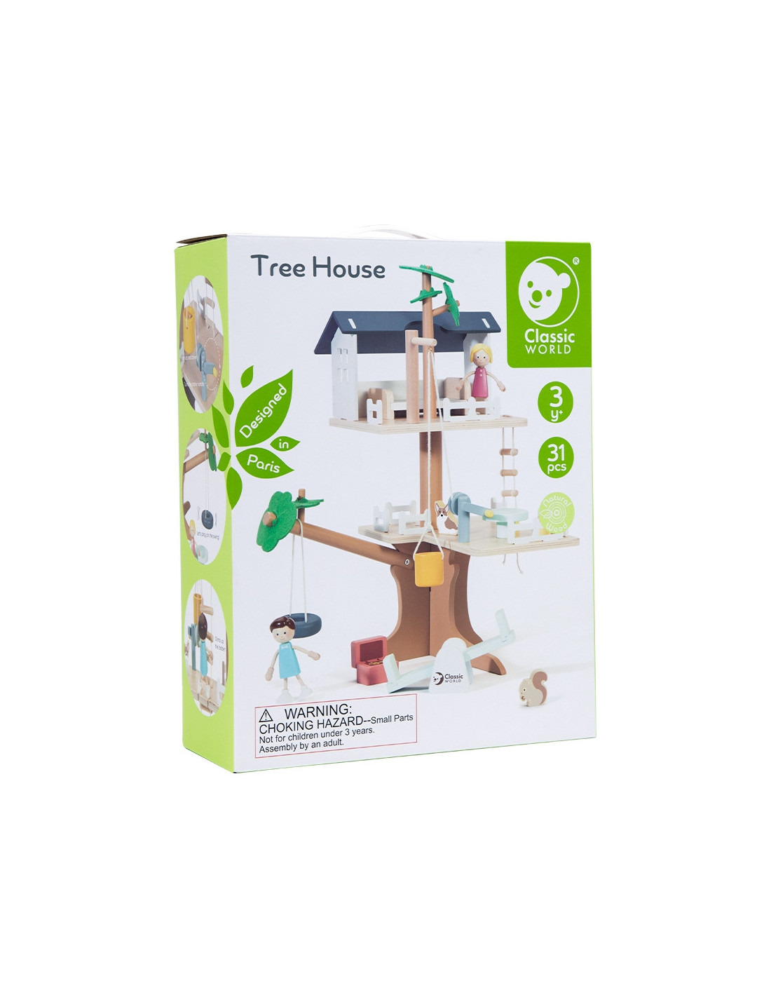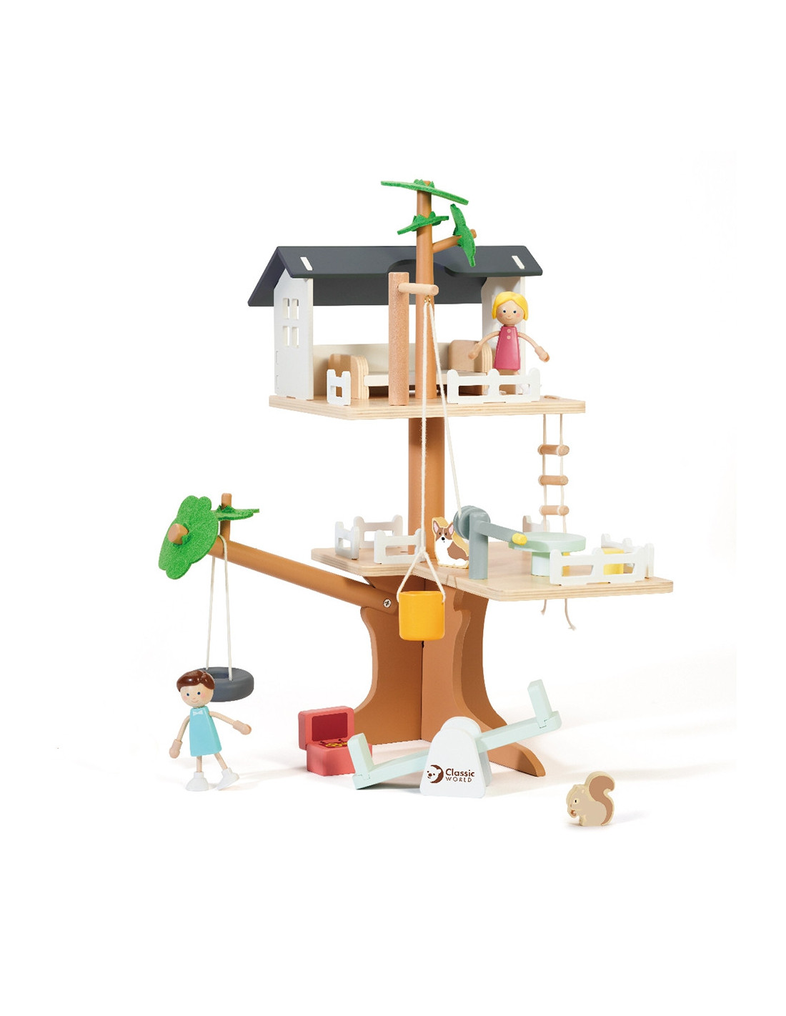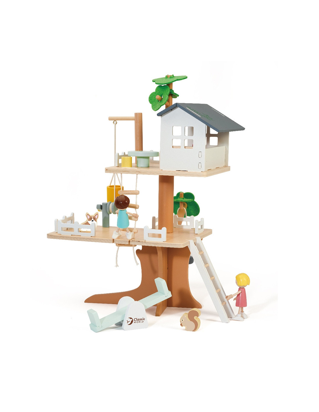 Domek na Drzewie od marki CLASSIC WORLD zapewni Twojemu dziecku niekończącą się zabawę! Wyjątkowy domek dla lalek pobudź wyobraźnie Twojego dziecka. Domek jest w pełni funkcjonalny. Lalka chłopiec może wyciągać wiadro za pomocą bloczka, dziewczynka może bawić się ze szczeniakiem. Wiewiórka zjeść szyszkę. Laleczki mogą bujać się na huśtawkach, a także wspinać się po drabinie do domku na drzewie. W zestawie 2 figurki dzieci, 2 zwierzęta i wspaniałe akcesoria, w tym huśtawka równoważna, huśtawka opona, wiadro, skrzynia ze skarbami, łóżko, stół i krzesła. Zestaw wykonany jest z naturalnego drewna. Wyjątkowy domek zachęci dziecko do tworzenia historii i przygód małych laleczek.