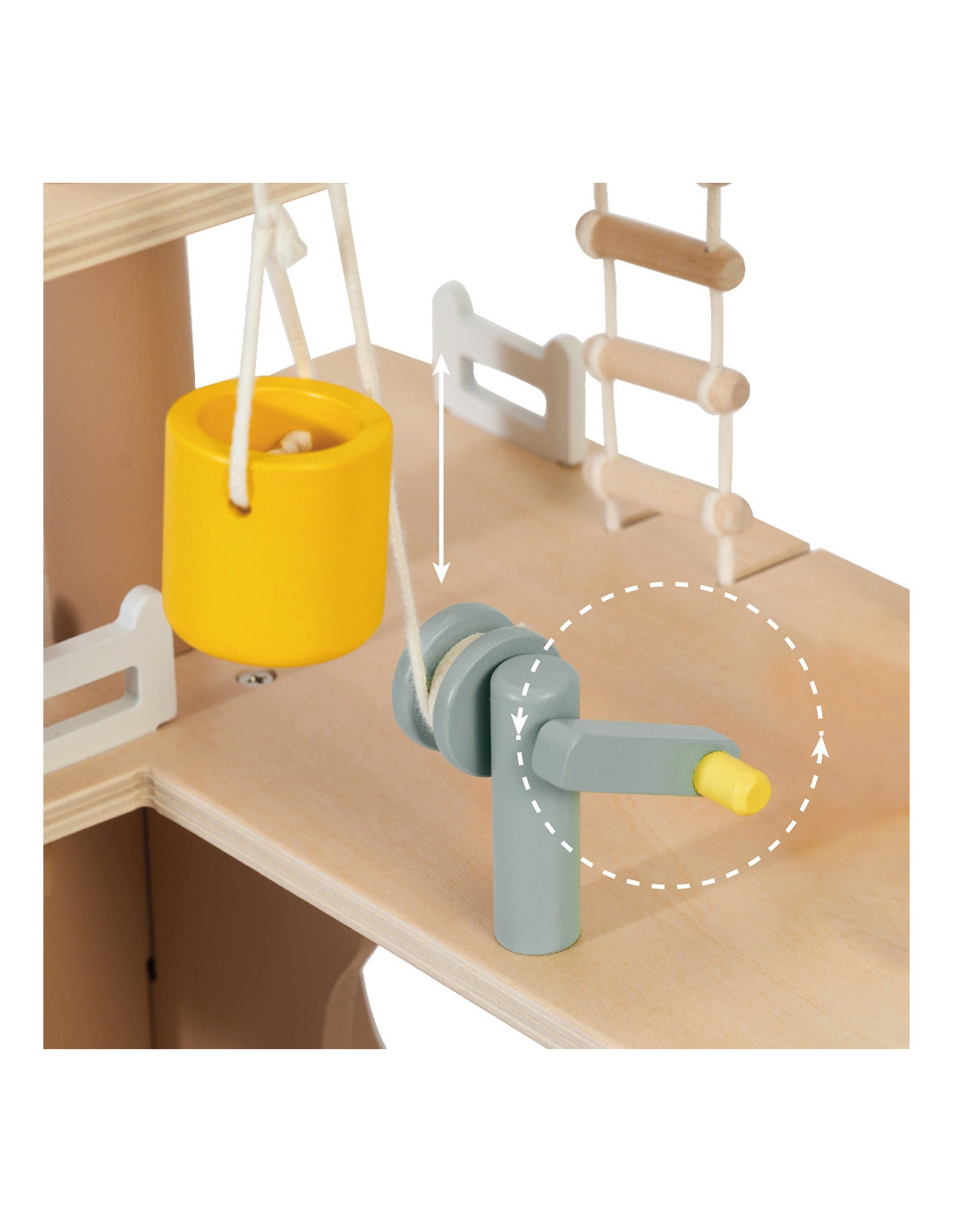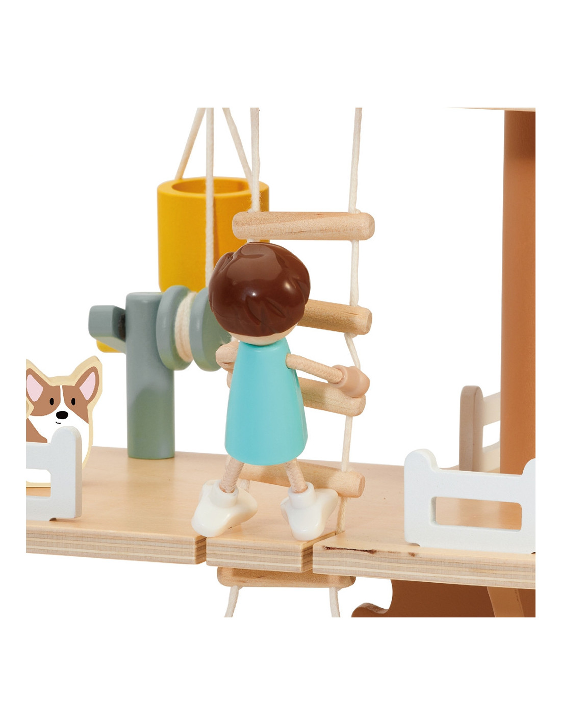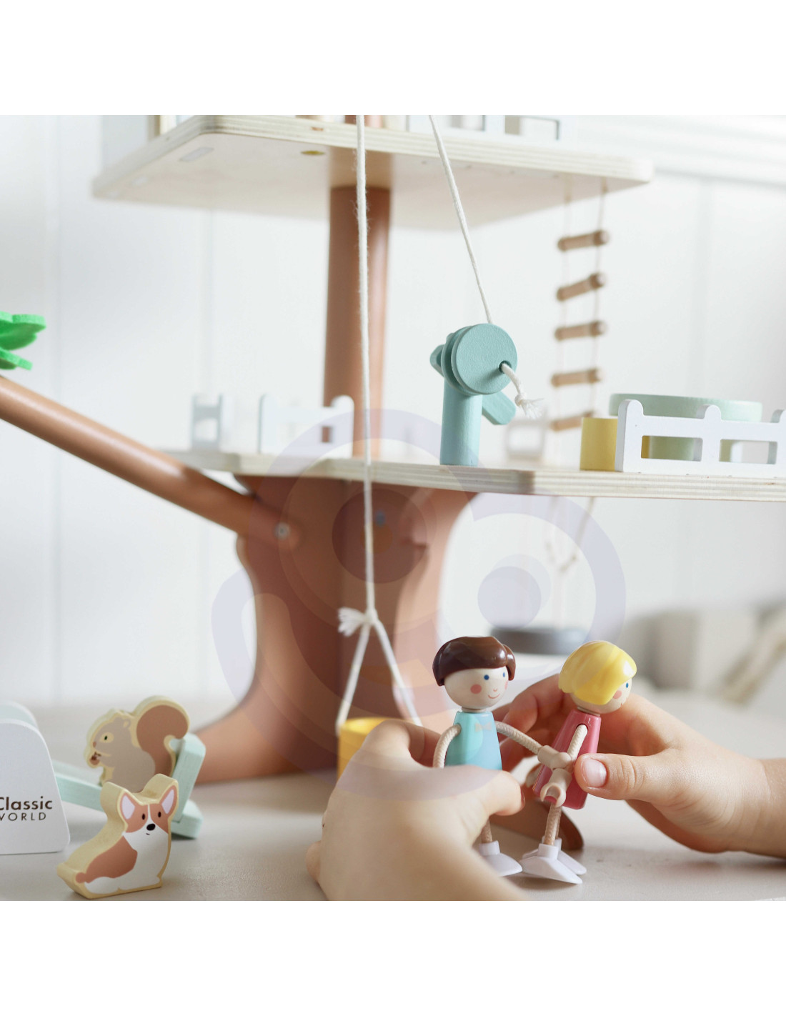 Domek na Drzewie od marki CLASSIC WORLD zapewni Twojemu dziecku niekończącą się zabawę! Wyjątkowy domek dla lalek pobudź wyobraźnie Twojego dziecka. Domek jest w pełni funkcjonalny. Lalka chłopiec może wyciągać wiadro za pomocą bloczka, dziewczynka może bawić się ze szczeniakiem. Wiewiórka zjeść szyszkę. Laleczki mogą bujać się na huśtawkach, a także wspinać się po drabinie do domku na drzewie. W zestawie 2 figurki dzieci, 2 zwierzęta i wspaniałe akcesoria, w tym huśtawka równoważna, huśtawka opona, wiadro, skrzynia ze skarbami, łóżko, stół i krzesła. Zestaw wykonany jest z naturalnego drewna. Wyjątkowy domek zachęci dziecko do tworzenia historii i przygód małych laleczek.
