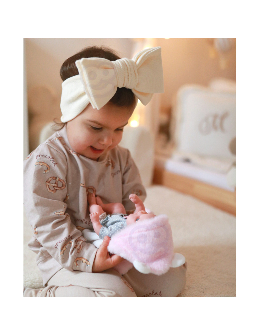 Ta urocza laleczka ma buzię, która zawsze jest gotowa na uśmiech i spojrzenie pełne ciepła. Jej realistyczne rączki, stópki i buzia i reszta ciała wykonane są z miękkiej gumy, ubrana w uroczy rampers hand made, idealna do przytulania. Bobas wyposażony jest w różowy kocyk, który zamienia się w namiot, nosidełko lub po prostu idealne okrycie na zimne dni. Dodatkowo, kocyk z uszkami sprawia, że lalka staje się jeszcze bardziej urocza i niepowtarzalna.