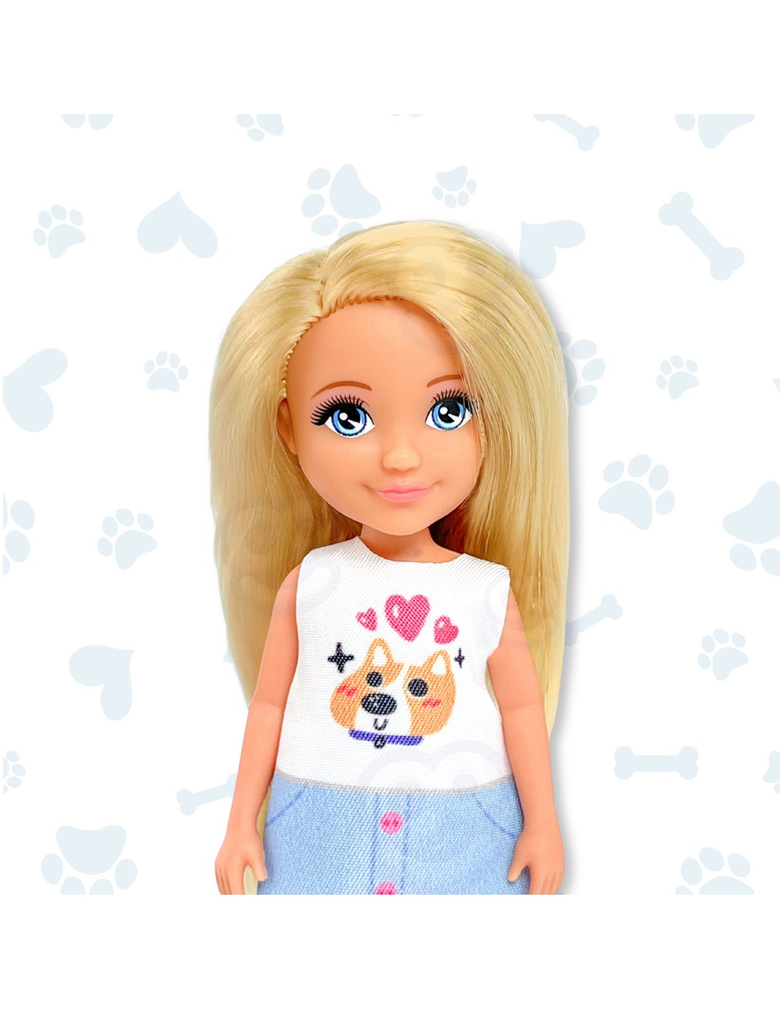 - - Śliczna laleczka z blond włosami, niebieskimi oczy, ubrana w białą bluzeczkę z uroczym nadrukiem pieska i błękitną spódniczkę.