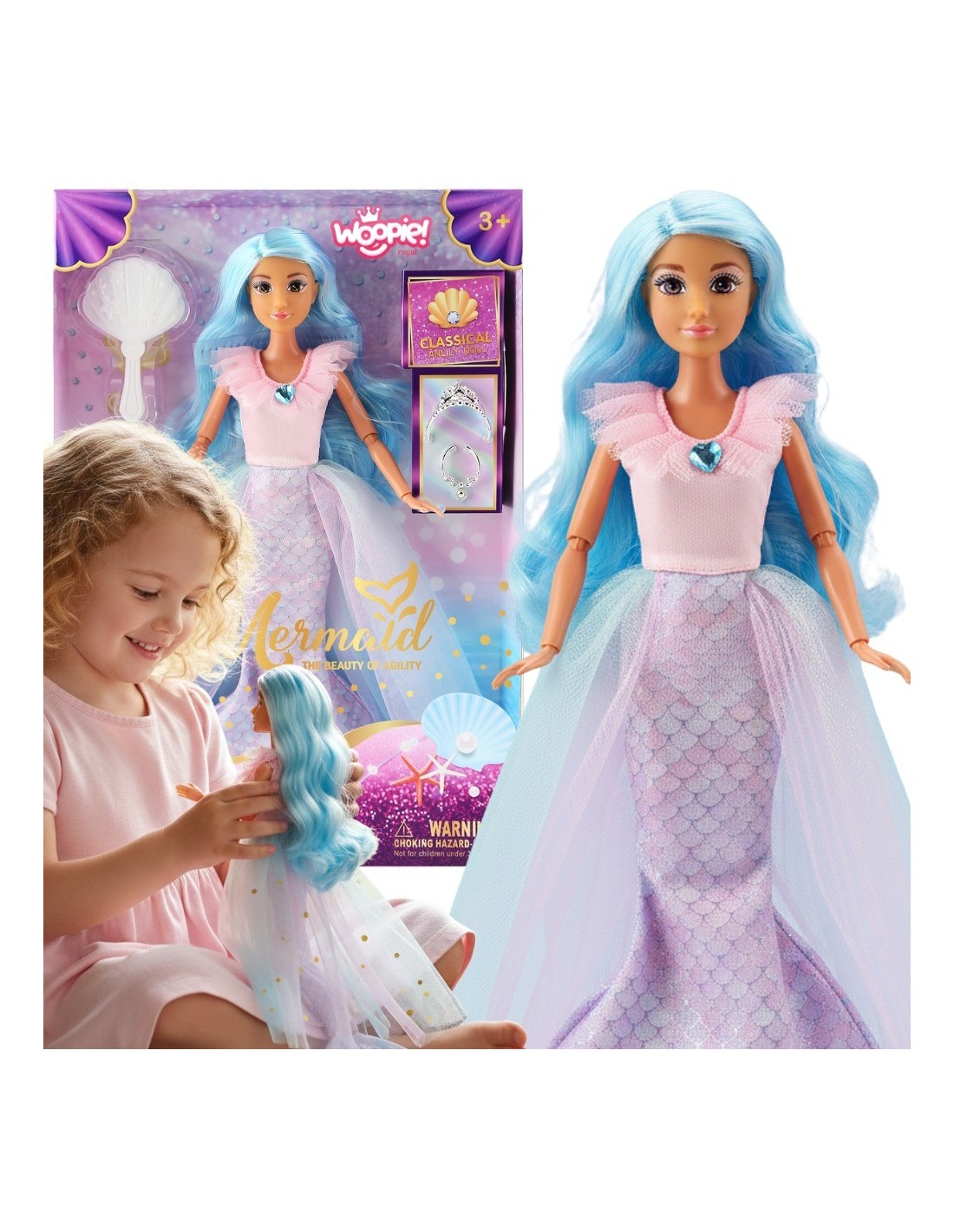 Przenieś swoje dziecko w magiczny, podwodny świat dzięki lalce Syrence Lili od marki Woopie Royal. Lalka zachwyca długimi, błękitnymi włosami i pastelowym, dwuczęściowym strojem z ogonem syreny oraz tiulową narzutką. Do zestawu dołączone są eleganckie akcesoria, które urozmaicają zabawę i pozwalają na kreatywne stylizacje. Lili zapewnia wiele godzin fantastycznej zabawy, pobudzając wyobraźnię i inspirując do odgrywania podwodnych historii. To idealny prezent dla każdej małej miłośniczki magii!