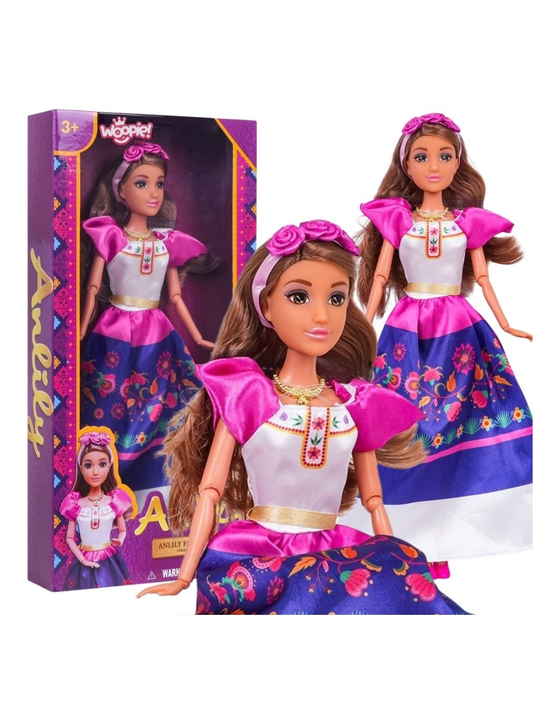 Poznaj uroczą lalkę Lily w tradycyjnym stroju meksykańskim, która zabierze Twoje dziecko w świat kreatywnej zabawy i wyobraźni! Lalka ma piękne, długie, brązowe włosy ozdobione opaską z różowymi różami. Jej strój zachwyca soczystymi kolorami i bogactwem wzorów, nawiązując do stylistyki ludowej. Idealna dla każdej małej księżniczki, która uwielbia bawić się w odgrywanie ról i przebieranie!Lalka posiada ruchome ręce i nogi, co urozmaica zabawę. Wysokiej jakości wykonanie i dbałość o szczegóły sprawiają, że będzie wspaniałym dodatkiem do kolekcji i doskonałym pomysłem na prezent!