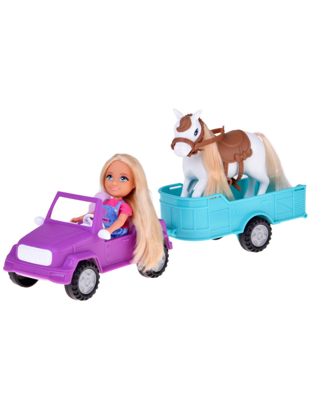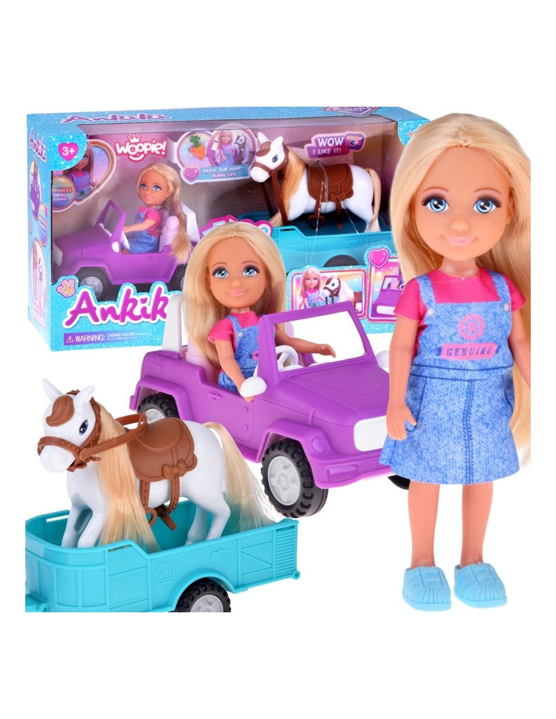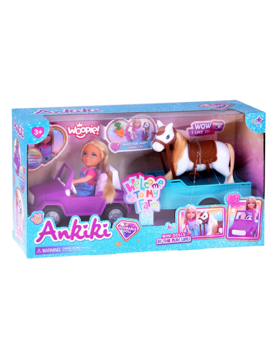 Wyrusz na wiejskie przygody z zestawem Kiki Lalka z Koniem, Samochodem i Przyczepą od marki Woopie! Ten obszerny zestaw do odgrywania ról z motywem ranczo/farmy zawiera mini lalkę, która potrafi usiąść za kierownicą fioletowego pojazdu terenowego. Doczep do niego turkusową przyczepę, aby przewieźć swojego konia! Lalka ma długie, blond włosy, które można czesać, a koń posiada siodło i uzdę. To idealna zabawka, która rozwija wyobraźnię i kreatywność oraz pozwala na tworzenie nieskończonej ilości scenariuszy związanych z życiem na farmie. Zestaw przeznaczony jest dla dzieci od 3 roku życia.