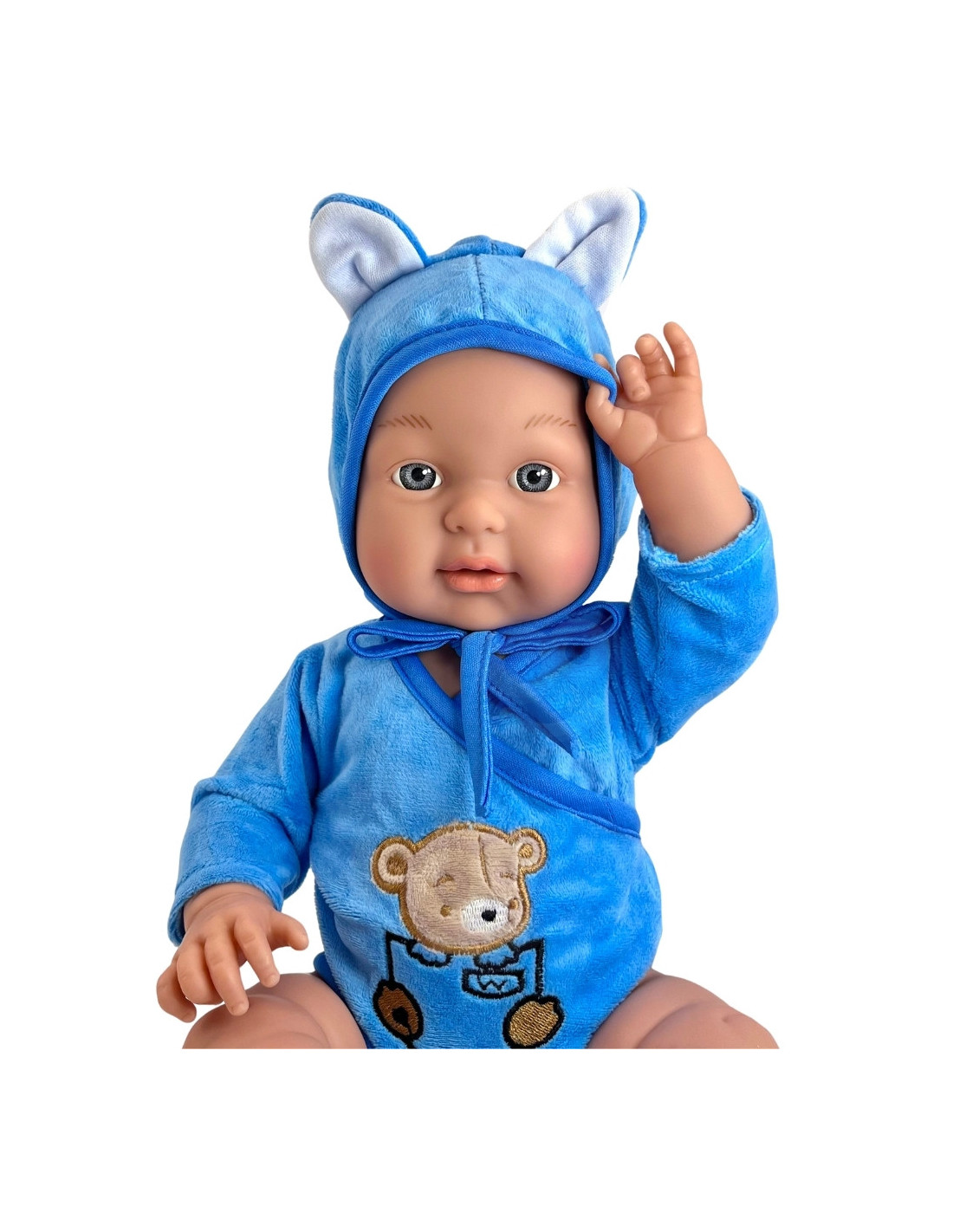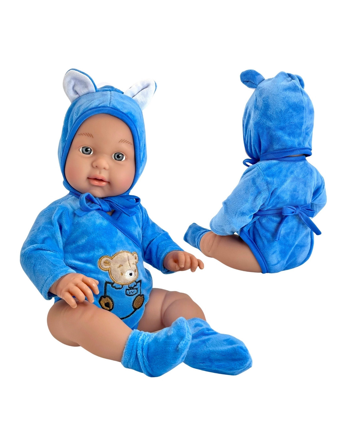 - - ubrana w uroczy niebieski strój: body z misiem i kapturem oraz buciki/skarpetki,