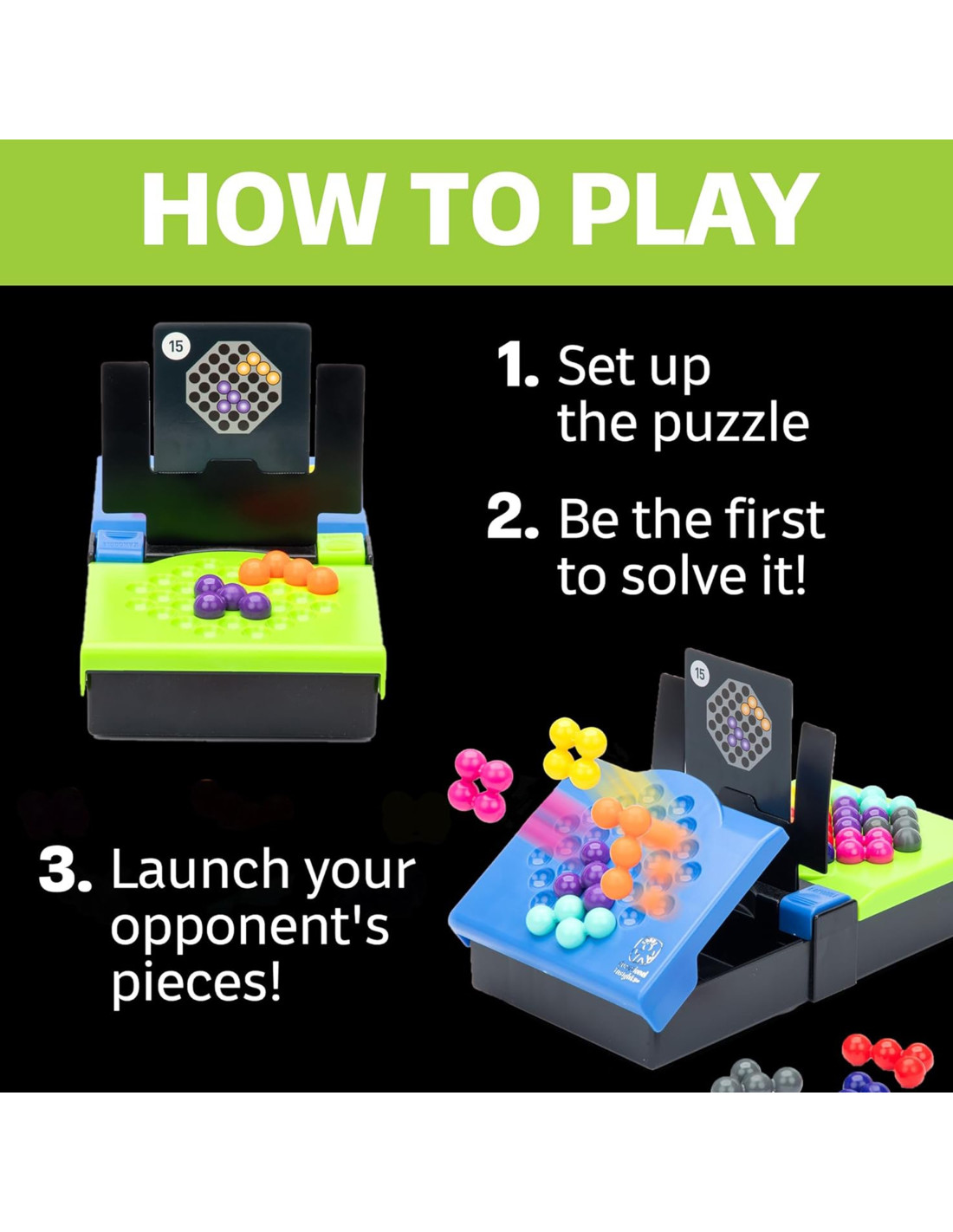 - Gracz, który pierwszy ułoży wzór, naciska przycisk z boku planszy powodując rozrzucenie kulek z planszy przeciwnika