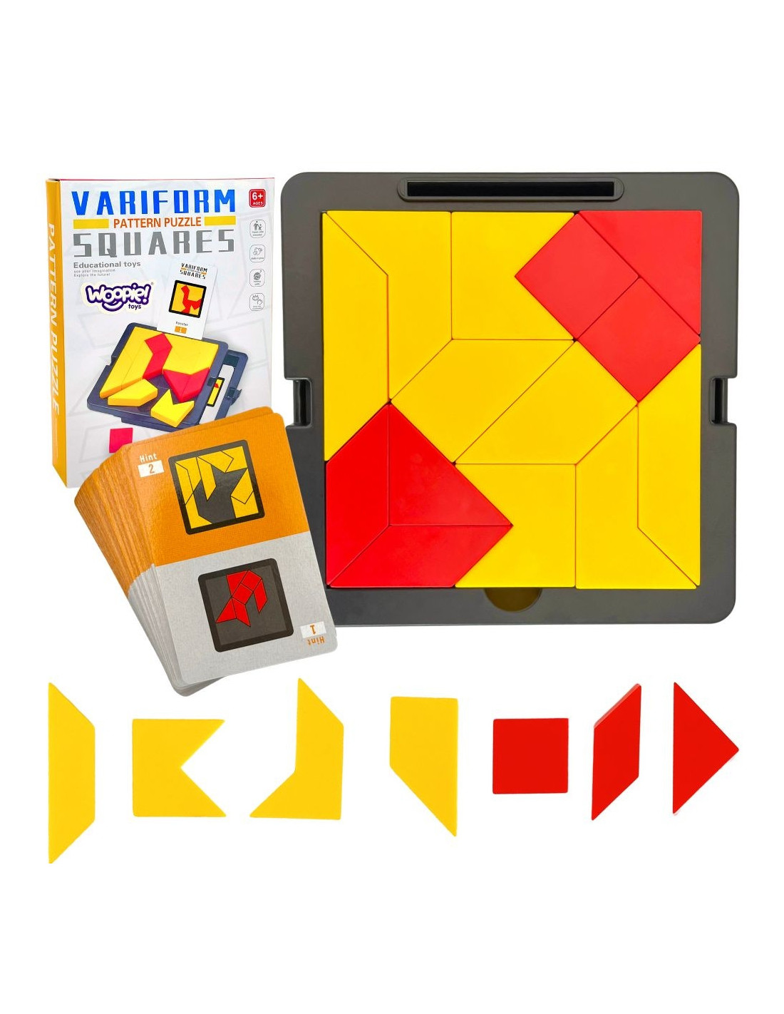 Tangram Gra Logiczna Kieszonkowa od firmy WOOPIE to gra, która pozwala rozwijać umiejętności spostrzegawcze jak i kreatywne. Celem gry jest ułożenie z dostępnych elementów określonych wzorów przedstawionych na kartach. Gracz musi dopasować klocki tak, aby odwzorować wzory, nie pozostawiając pustych miejsc ani nie nakładając elementów na siebie. Dziecko dzięki różnym drewnianym klockom może układać wiele wzorów, każdy w coraz to cięższej kategorii. Przez co może ono rozwijać wyobraźnie i ćwiczyć logiczne myślenie.Ta gra jest również ćwicząca pamięć dzięki dolnej szufladce, której można schować karty. Jest to gra dla osób w każdym wieku ! Przez jej kompaktową wielkości może posłużyć jako rozrywka podczas podróży jak i w domu. Idealna na prezent dla każdego.