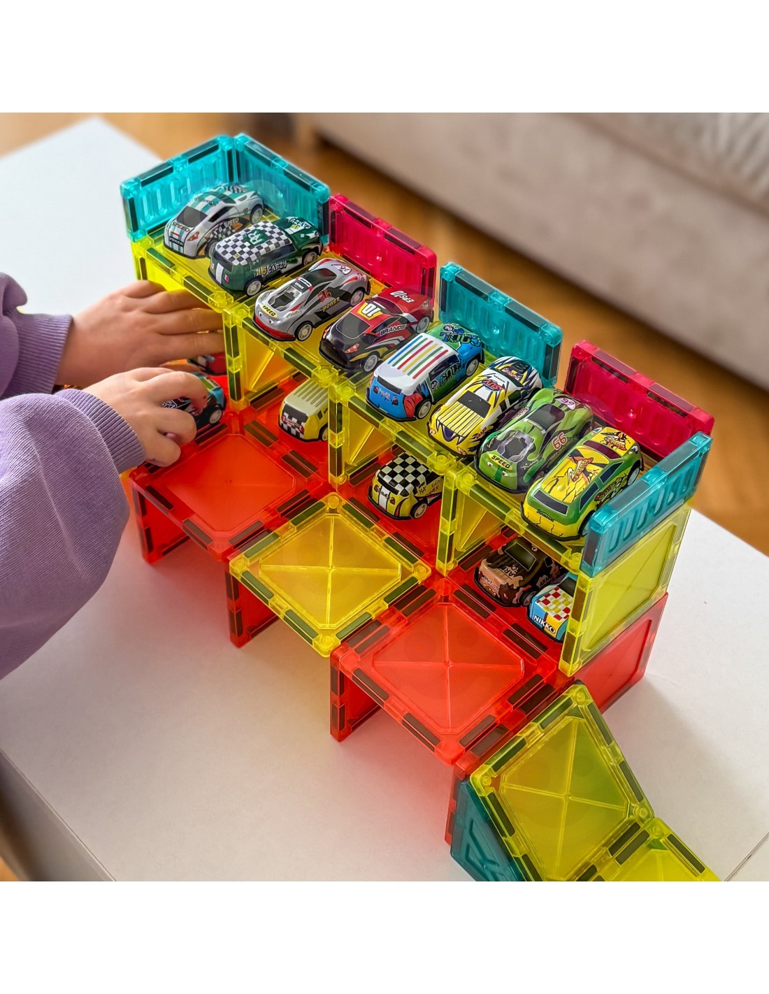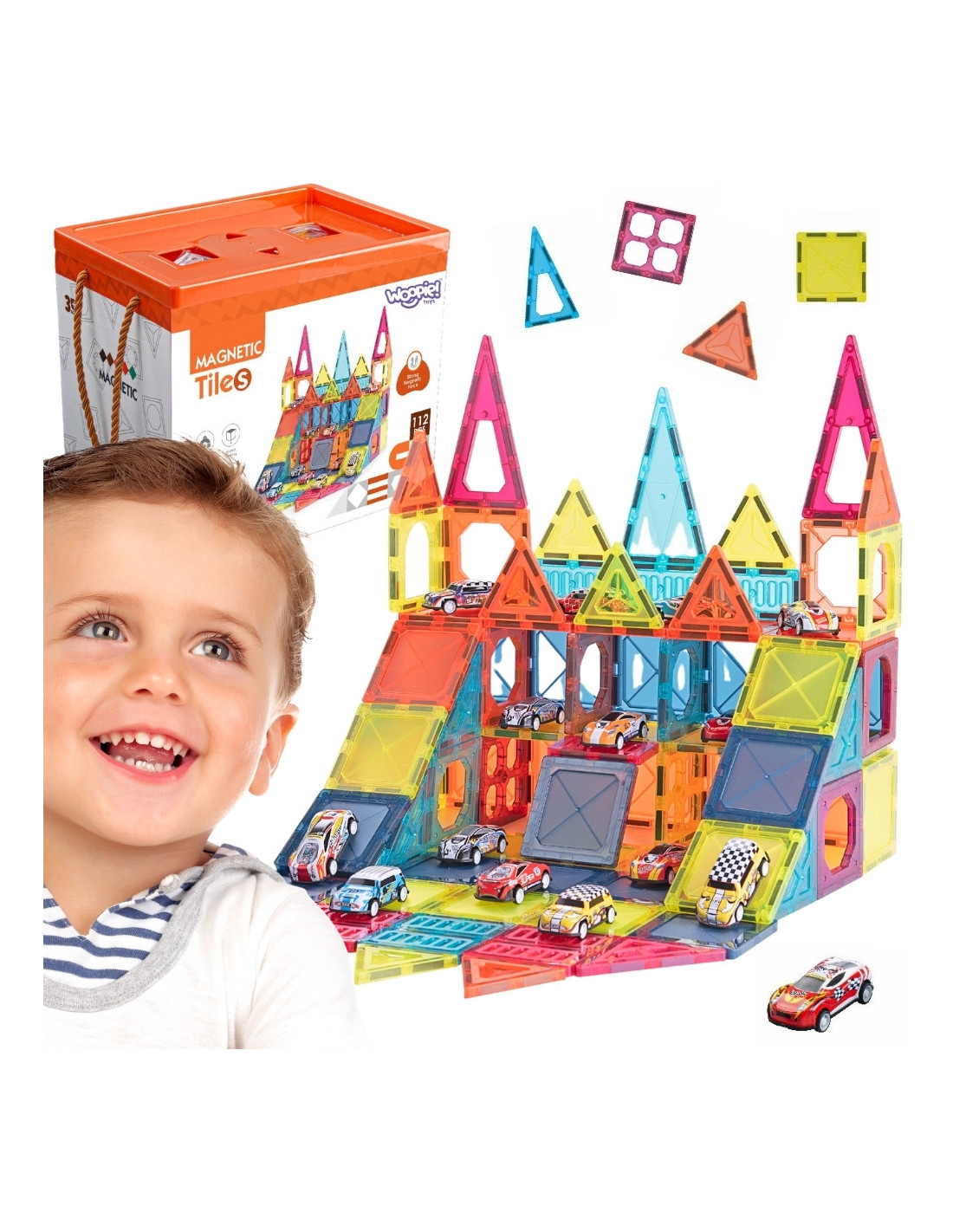 Zestaw magnetycznych klocków marki Woopie to wyjątkowa zabawka, która dzięki silnym magnesom neodymowym, kolorowym płytkom i 20 mini samochodom dzieci mogą eksperymentować z budową spektakularnych parkingów wielopoziomowych, garaży i ramp, rozwijając przy tym swoje zdolności manualne oraz wyobraźnię przestrzenną. Prosta konstrukcja i duże możliwości sprawiają, że zabawka jest wygodna i atrakcyjna