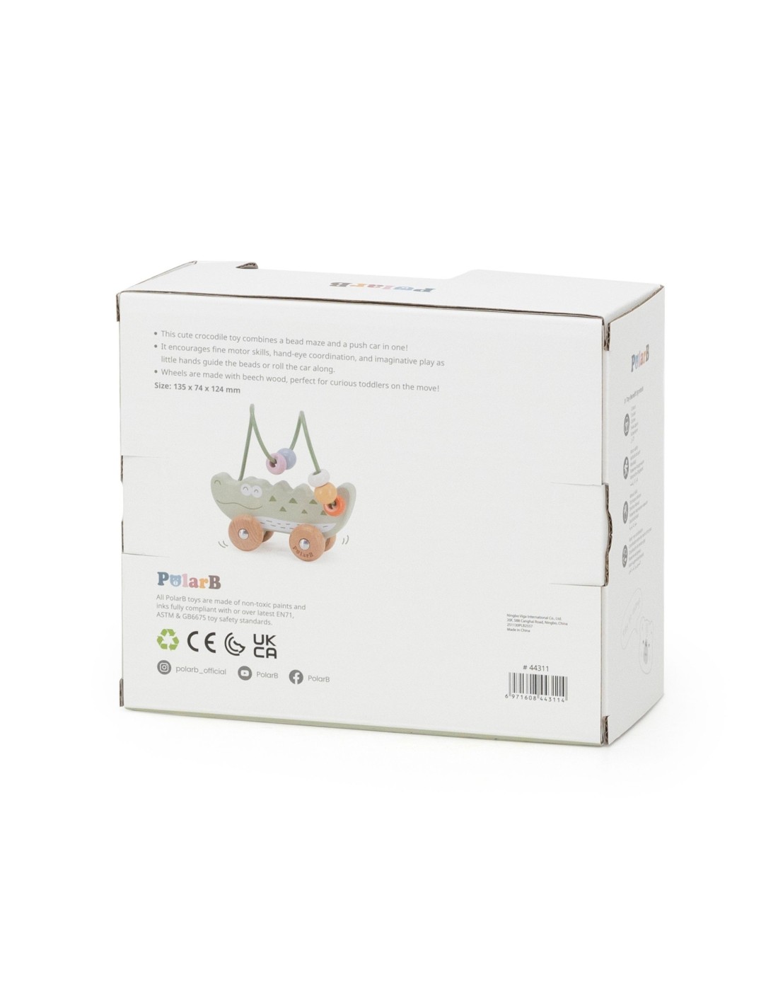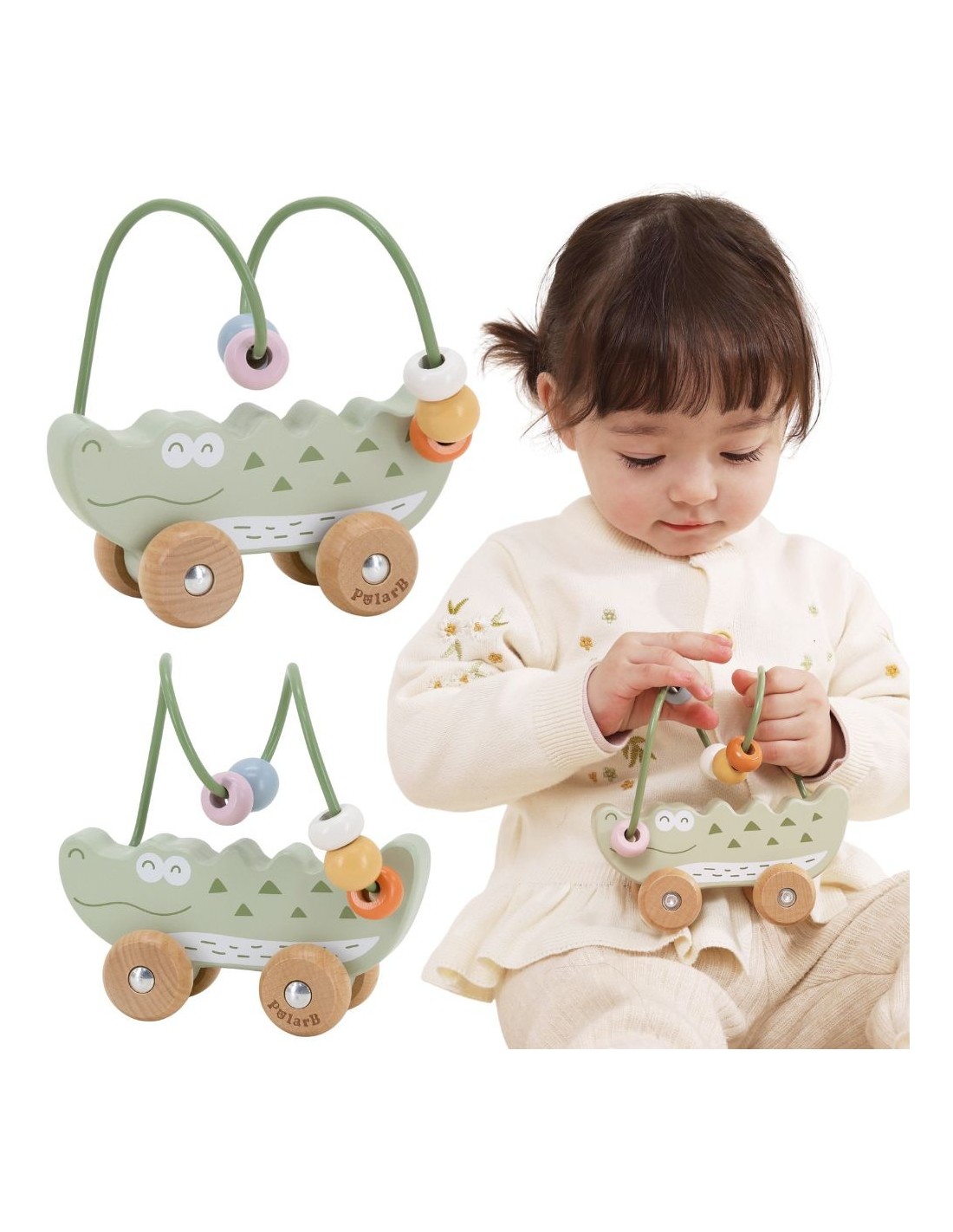 Uroczy labirynt koralikowy w kształcie Krokodyla to idealna pierwsza zabawka edukacyjna dla malucha już od 12. miesiąca życia. Łączy w sobie funkcję labiryntu z koralikami oraz jeździka do pchania, zapewniając podwójną radość z zabawy. Dziecko może przesuwać kolorowe koraliki po pałąku lub toczyć zabawkę po podłodze, rozwijając swoje umiejętności ruchowe. Naturalne drewno bukowe i zaokrąglone krawędzie gwarantują bezpieczeństwo podczas zabawy. To doskonały wybór dla rodziców szukających trwałej, estetycznej i edukacyjnej zabawki.
