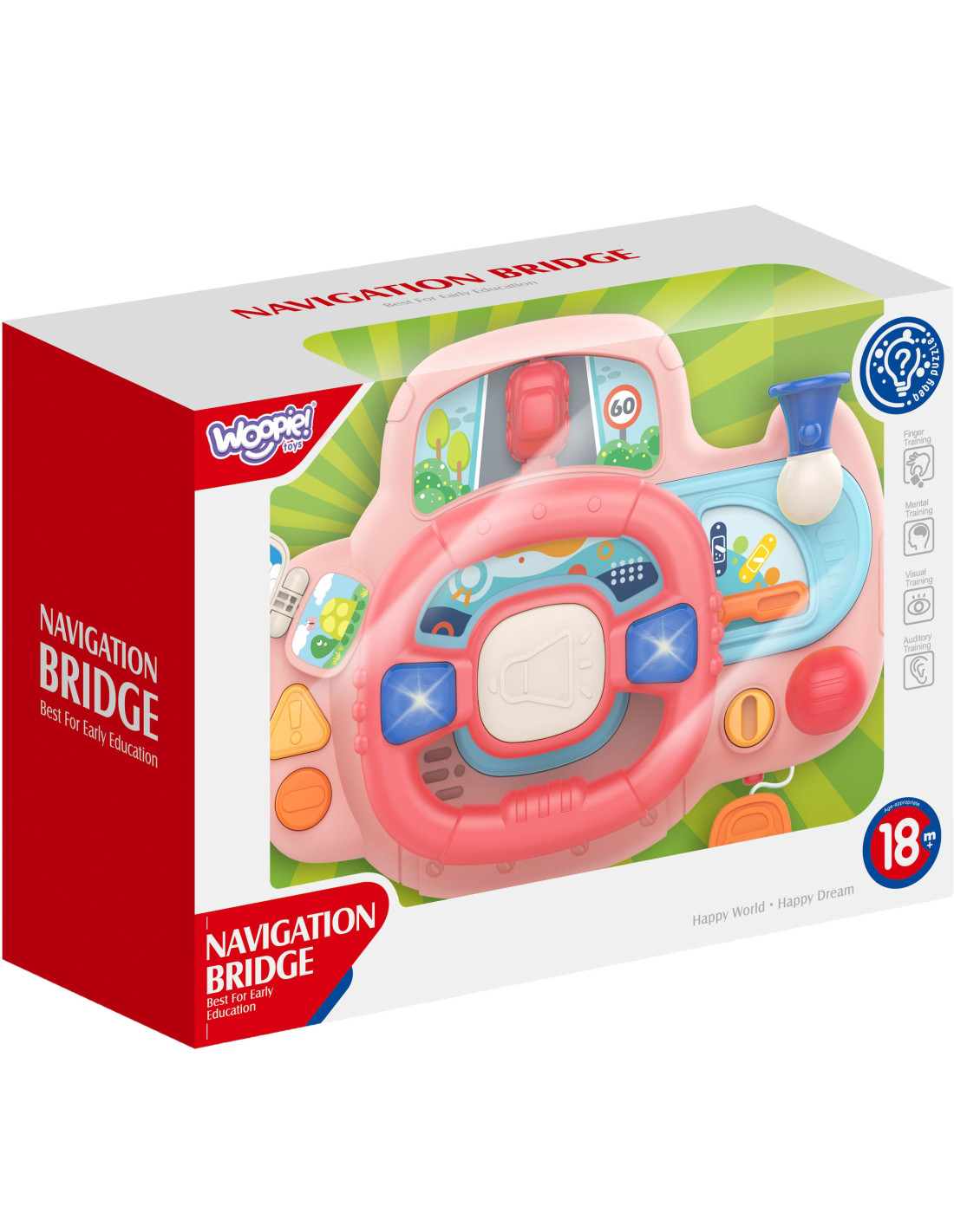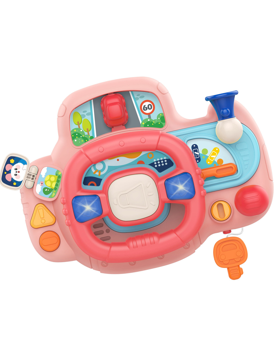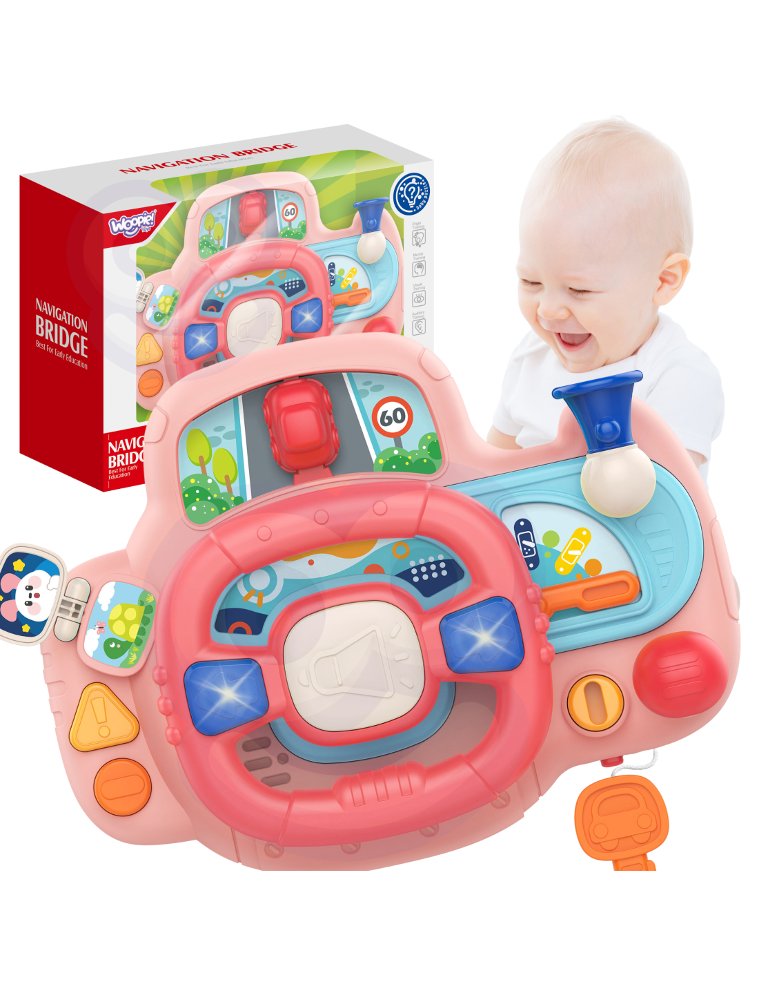 Elektroniczna kierownica, pełna aktywności i przyjemności do marki WOOPIE. Zabawka zawiera przyciski, światła i dźwięki, które symulują realistyczne wrażenia z jazdy, angażując i stymulując wyobraźnię dziecka. Obracając kierownicą samochodzik się przemieszcza, co daje dodatkową frajdę Twojemu maluszkowi. Kierownica z panelem posiada, aż 11 funkcjonalności, które składają się w wielogodzinną zabawę. Dodatkowo produkt można zamontować za pomocą pasów do łóżeczka, fotelu w samochodzie i w wielu innych miejscach.