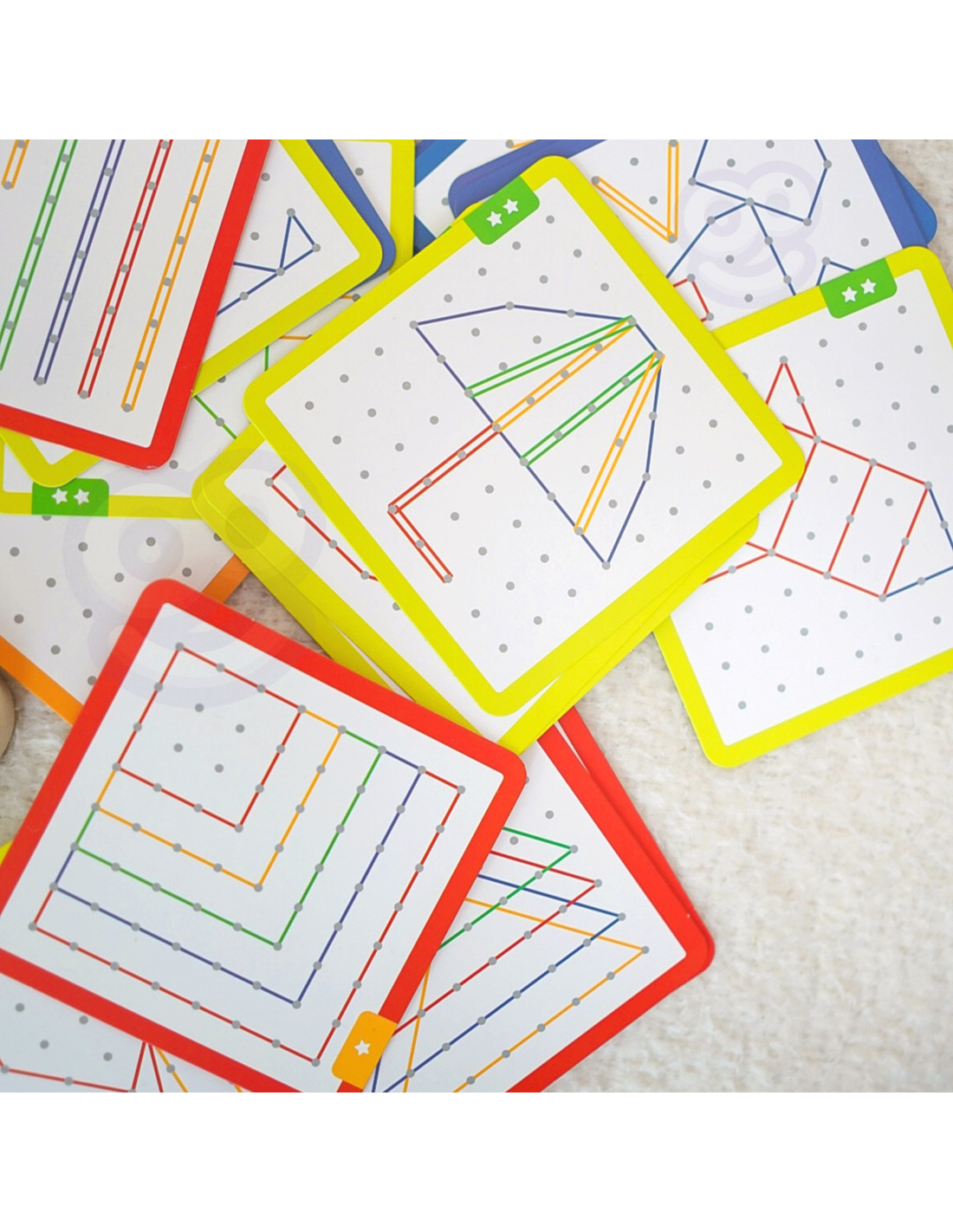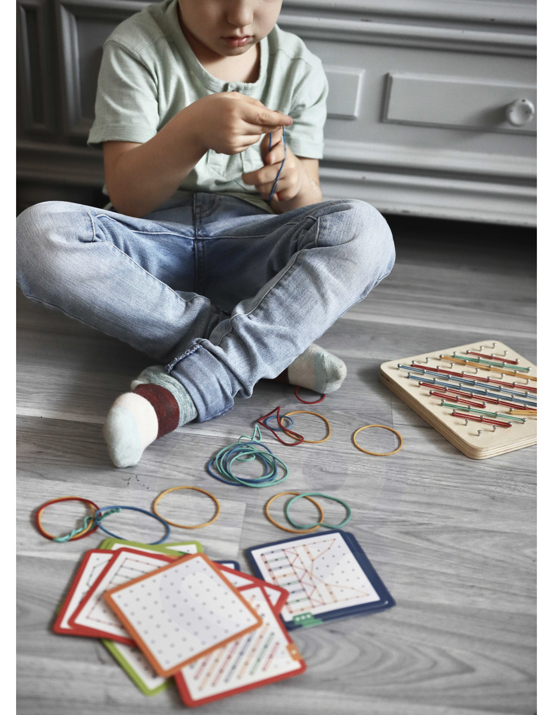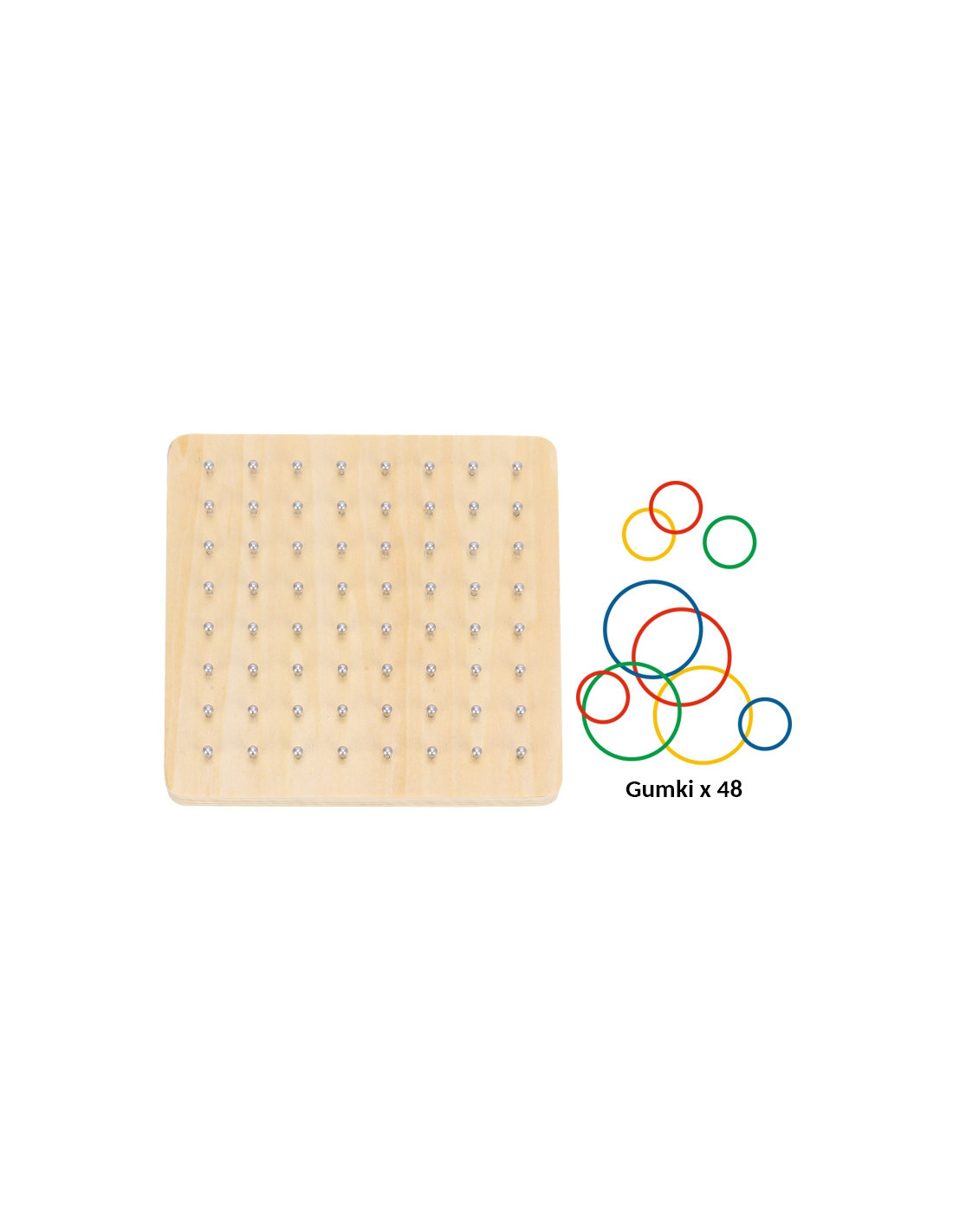 - - zestaw zawiera: 48 elastycznych gumek, 20 dwustronnych kart (40 wzorów), drewnianą planszę z kołkami