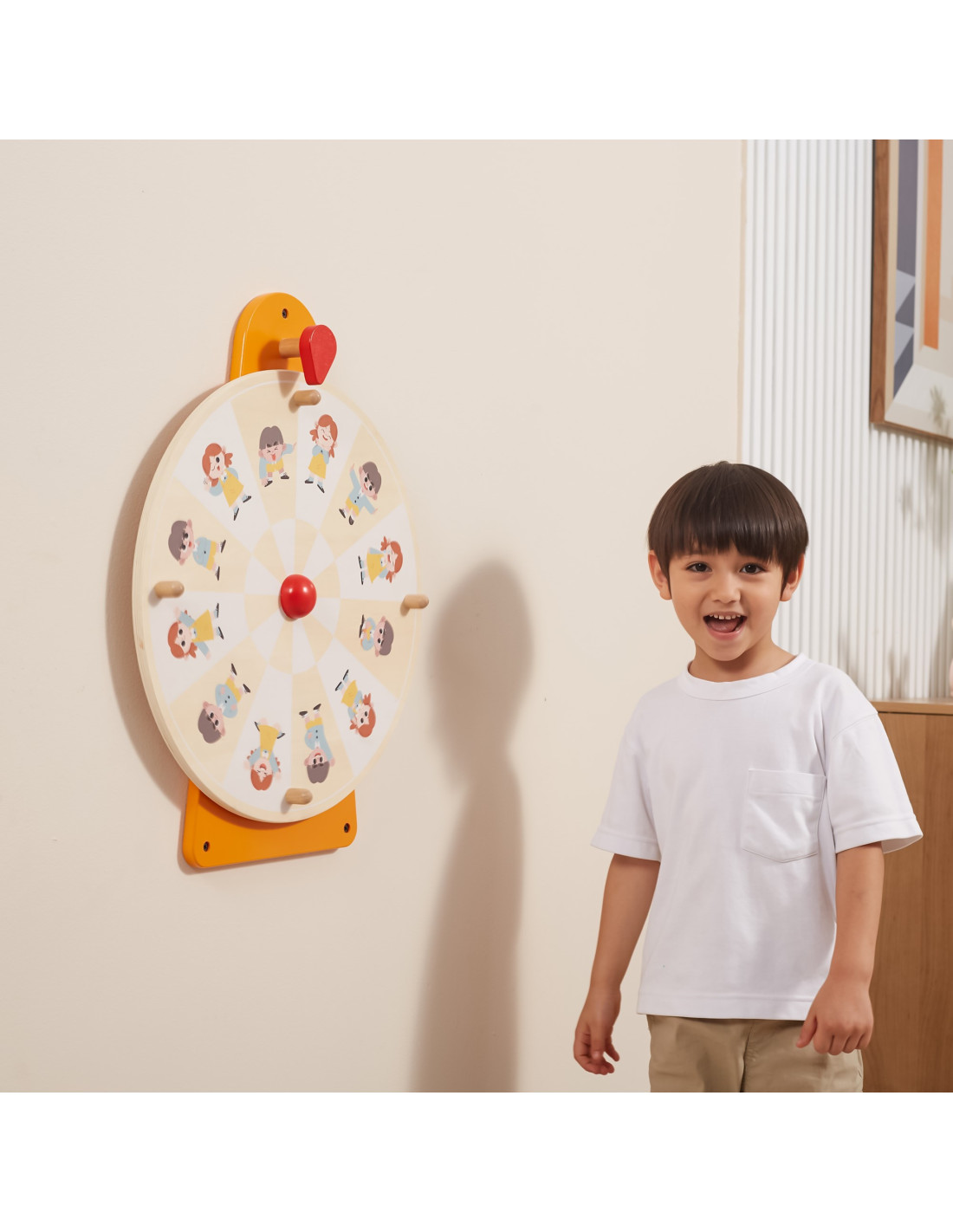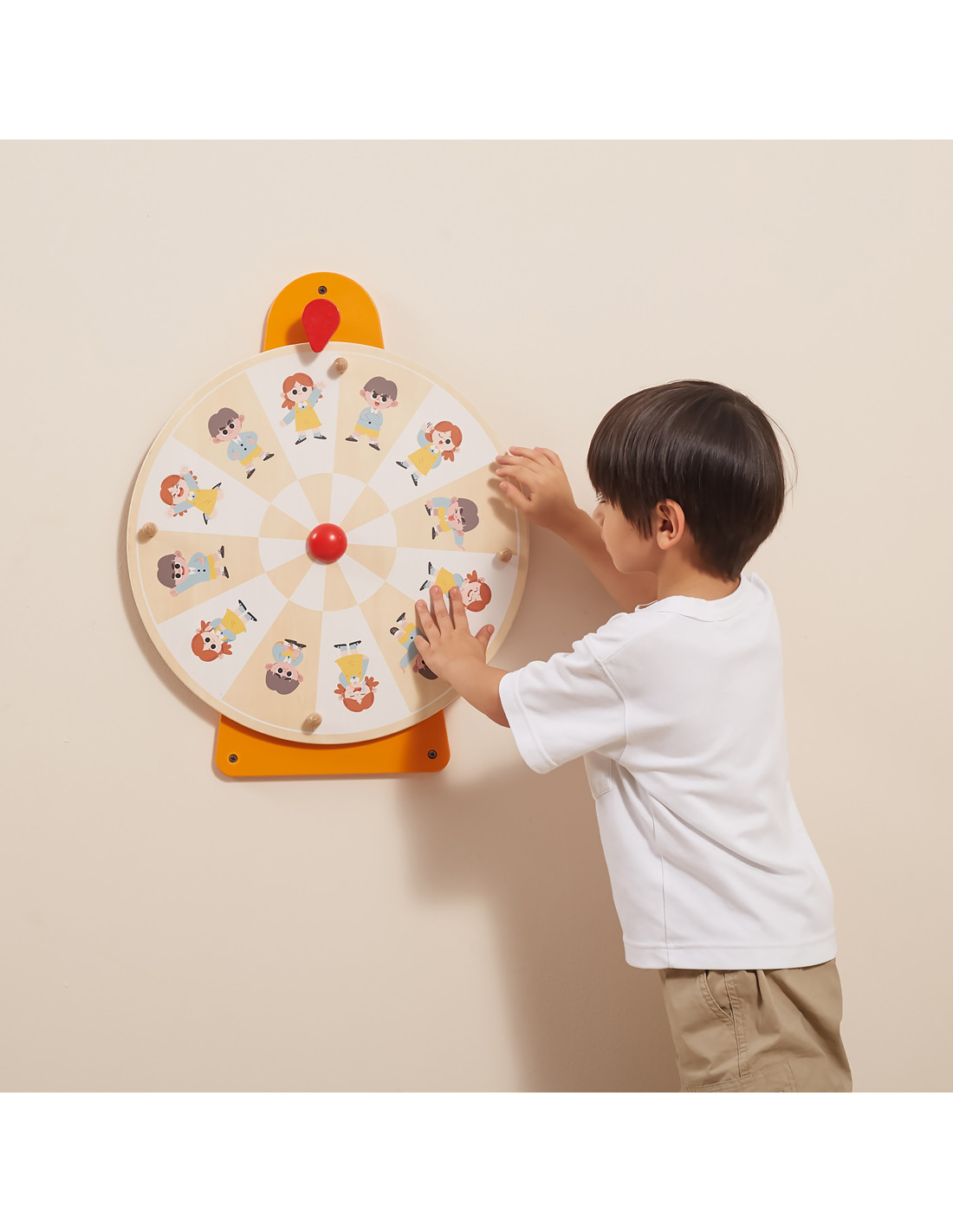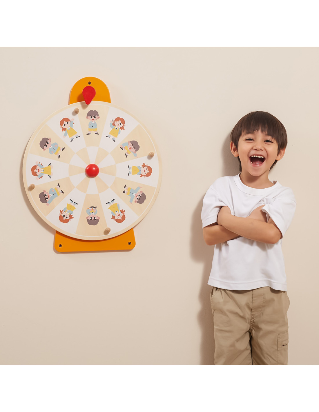 Interaktywna zabawka marki Viga wykonana z drewna. Tablica przedstawia 12 dzieci o różnych wyrazach twarzy i czynnościach. Zakręć kołem i czekaj aż się zatrzyma. Czerwona strzałka wskaże dziecko, które należy naśladować. Zabawa pomaga dzieciom odkrywać różne emocje i ruchy ciała oraz uczyć umiejętności obserwacji i szybkiego reagowania. Świetne do zajęć w szkołach i innych placówkach.