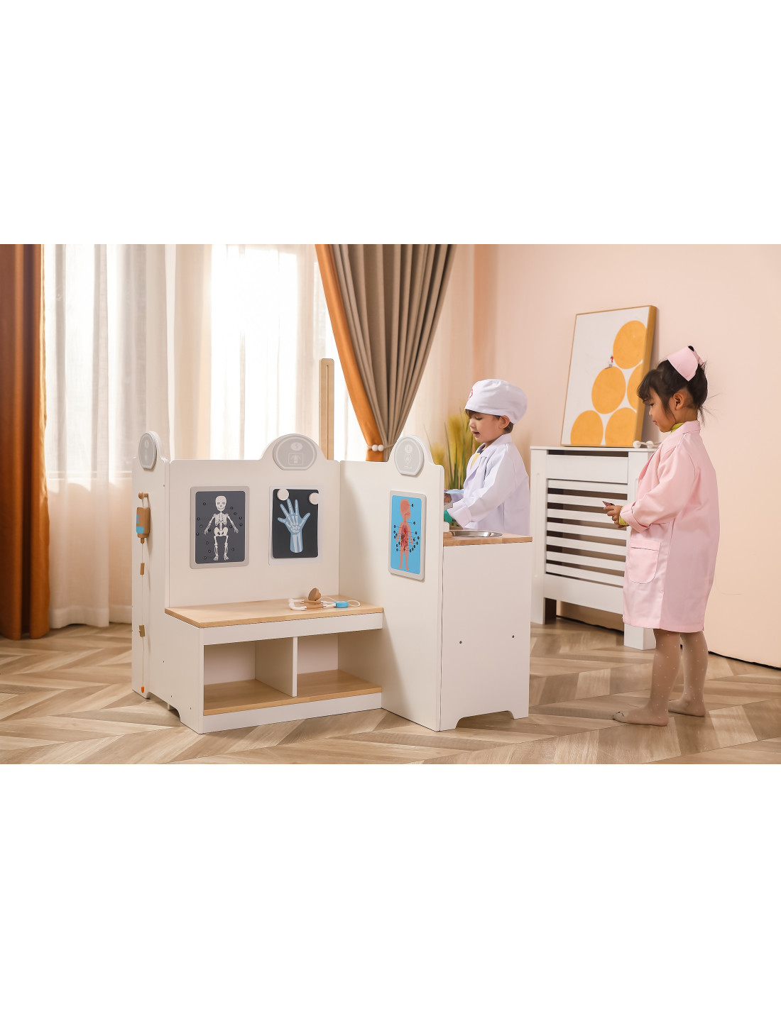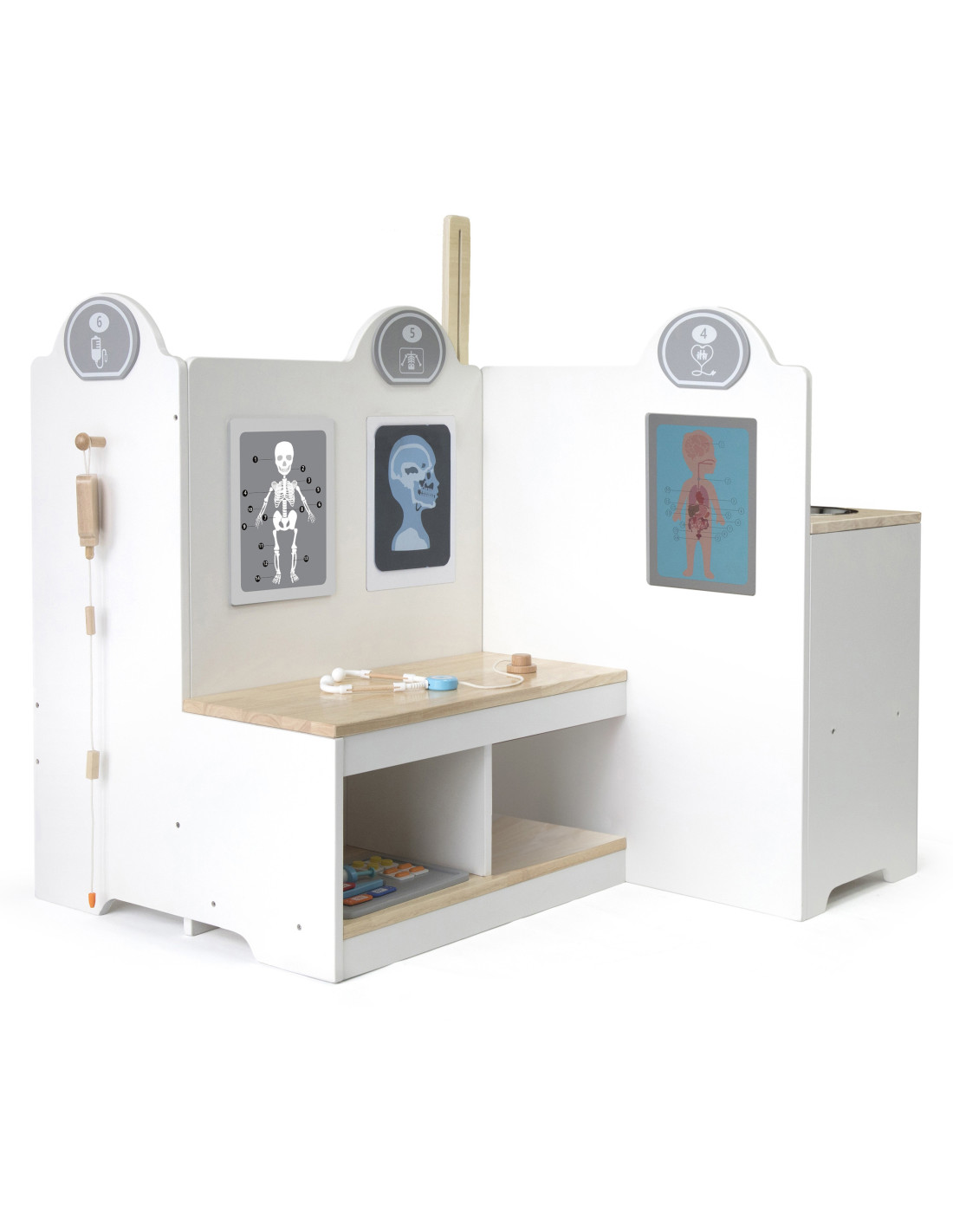 Wielofunkcyjne Centrum Medyczne od znanej i cenionej marki Viga to wspaniała zabawka, która pozwoli Twojemu dziecku poznać bliżej zawód lekarza czy pielęgniarki. Zestaw zawiera gabinet lekarski, poczekalnie, umywalkę i recepcję. Dodatkowo dołączone zostały profesjonalne sprzęty medyczne takie jak: stetoskop, ciśnieniomierz, młotek refleksyjny, termometr, sprzęt do wykonania badań rentgenowskich, strzykawki, tabletki, opakowania na pigułki. Dzięki zabawie możemy bliżej wyjaśnić dziecku na czym polega praca lekarza, możemy odgrywać rolę doktora, pielęgniarki czy pacjenta. Idealny sposób, aby przybliżyć dzieciom przebieg wizyty u lekarza, zwłaszcza tym, które boją się wizyt w gabinecie lekarskim. Świetny produkt dla maluchów, które chcą w przyszłości zostać lekarzami. Zabawka idealna do odgrywania ról, pomaga rozwinąć u dzieci wyobraźnię oraz umiejętności społeczne. Przeznaczona dla dzieci powyżej 3 roku życia.