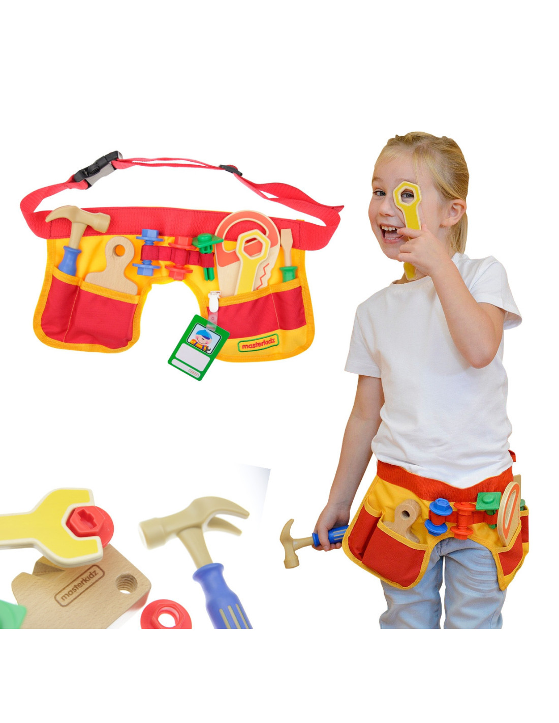 Materiałowy pas, oraz zestaw 12 narzędzi stolarskich od marki MASTERKIDZ. Komplet pozwala na wykonanie wszelkich prac stolarskich, a także zawiera identyfikator pracownika, na którym dziecko może zapisać swoje imię, oraz przykleić zdjęcie. Maluch poczuje się jak prawdziwy fachowiec, który potrafi naprawić każdą usterkę!
