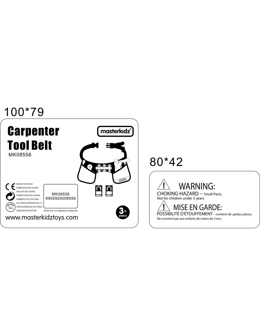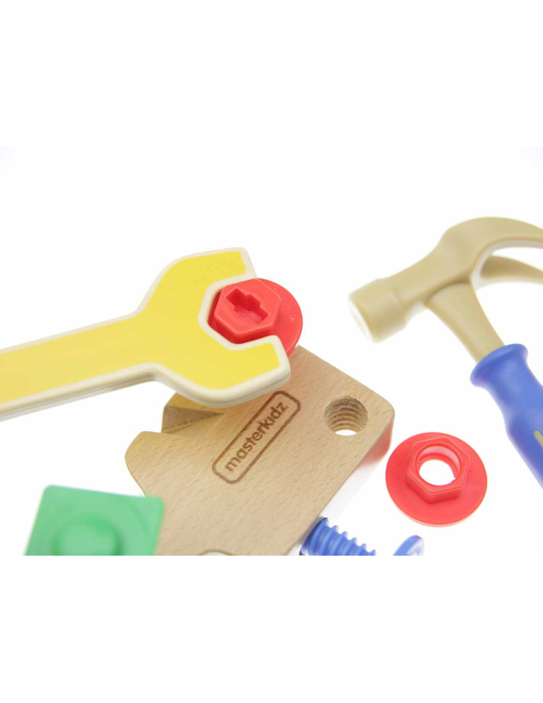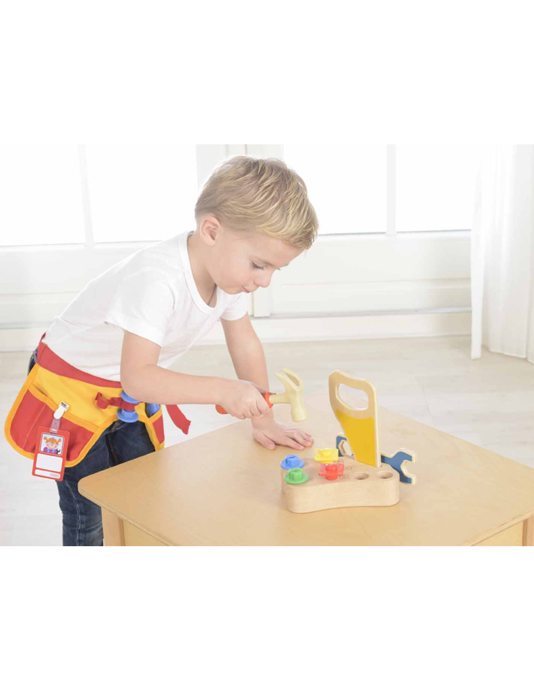 Materiałowy pas, oraz zestaw 12 narzędzi stolarskich. Komplet pozwala na wykonanie wszelkich prac stolarskich, a także zawiera identyfikator pracownika, na którym dziecko może zapisać swoje imię, oraz przykleić zdjęcie. Maluch poczuje się jak prawdziwy fachowiec, który potrafi naprawić każdą usterkę!