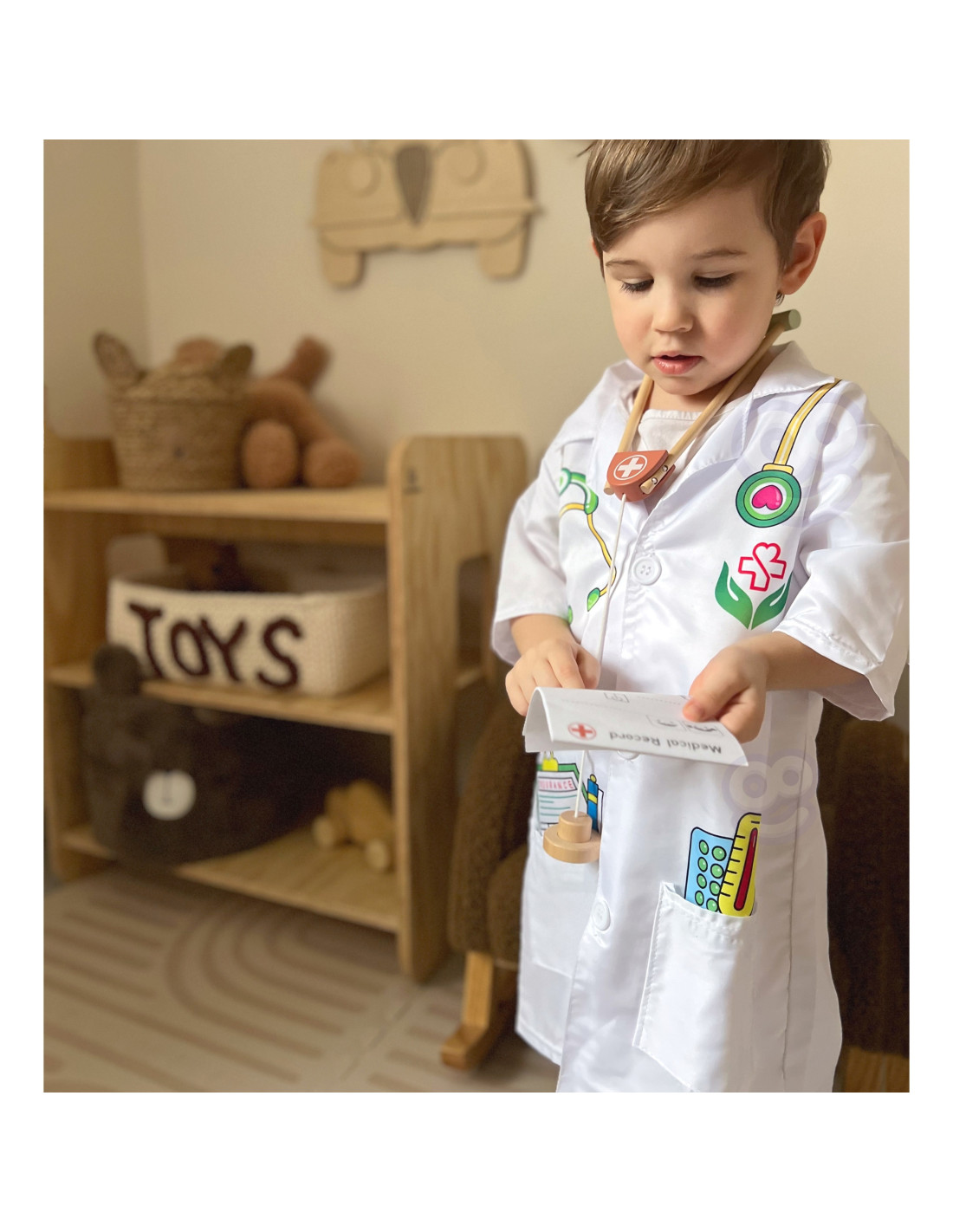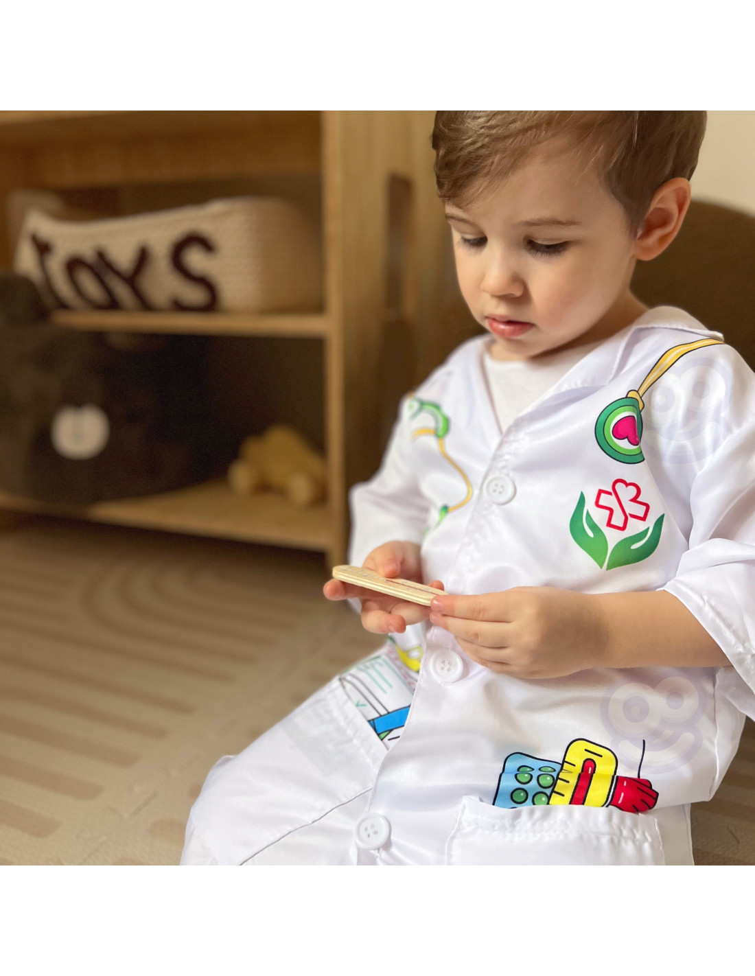 Strój Doktora dla dzieci marki Woopie pozwoli rozwinąć pasję Twojego dziecka do pomagania innym. Mnóstwo dzieci marzy o byciu lekarzem, a dzięki ubranku będą mogły się tak poczuć. Pamiętaj, że odgrywanie ról pobudza wyobraźnie i kreatywność twojego dziecka!