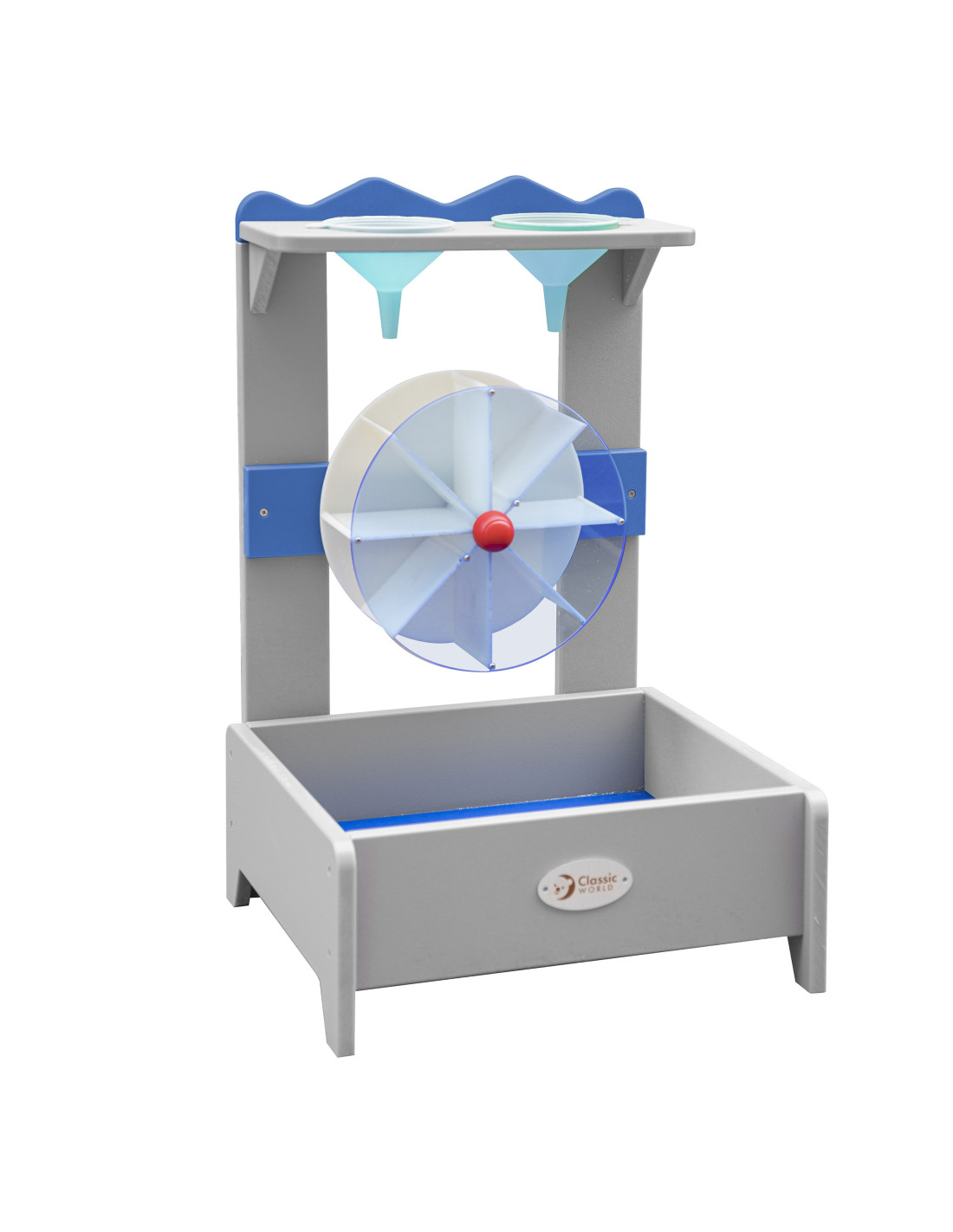 Zabawka Wodna dla dzieci od renomowanej marki Classic World to idealne dopełnienie twojej piaskownicy!, pomalowany nietoksycznym impregnatem, w pełni bezpiecznym dla dzieci. Po prostu napełnij lejki wodą i obserwuj jak spływa do kołowrotka powodując jego kręcenie. Wyposażony w dwa lejki na górze, przez które przepływa woda napędzająca obrót koła. Zabawka zachęca dzieci do kreatywności i odkrywania. Wybór lejków określa kierunek obrotu koła, zgodnie z ruchem wskazówek zegara lub przeciwnie do ruchu wskazówek zegara.