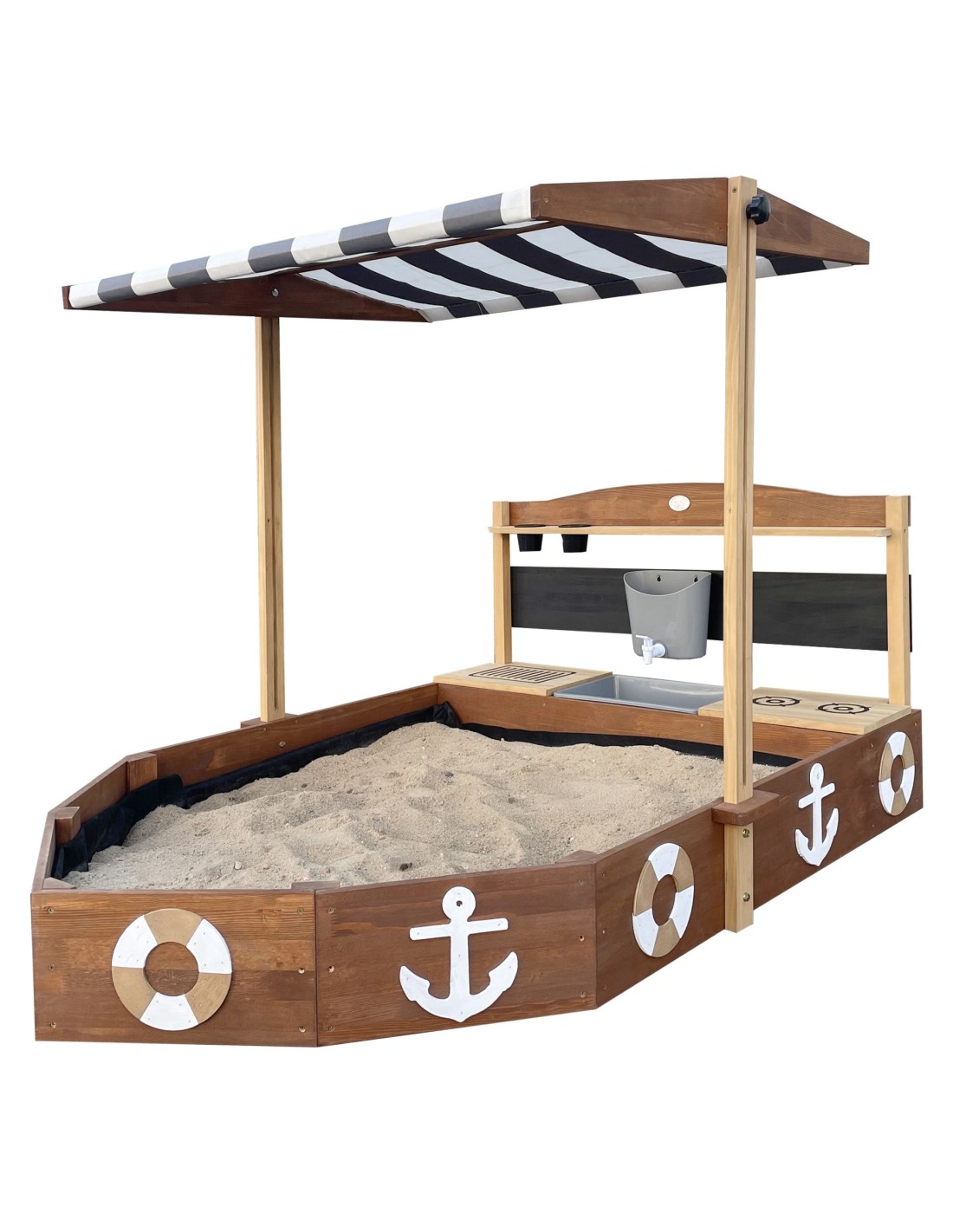 Wejdź na pokład drewnianej Piaskownicy-Statku od marki AXI! Z nią zabawa na świeżym powietrzu staje się ekscytującą morską przygodą. Na pokładzie znajduje się dodatkowo mała kuchnia ze zlewem, która jeszcze bardziej urozmaici zabawę. Piaskownica posiad również dach z materiału, który zapewni schronienie w słoneczne letnie dni, a po całkowitym opuszczeniu będzie pełnić funkcję pokrywy dla piaskownicy.