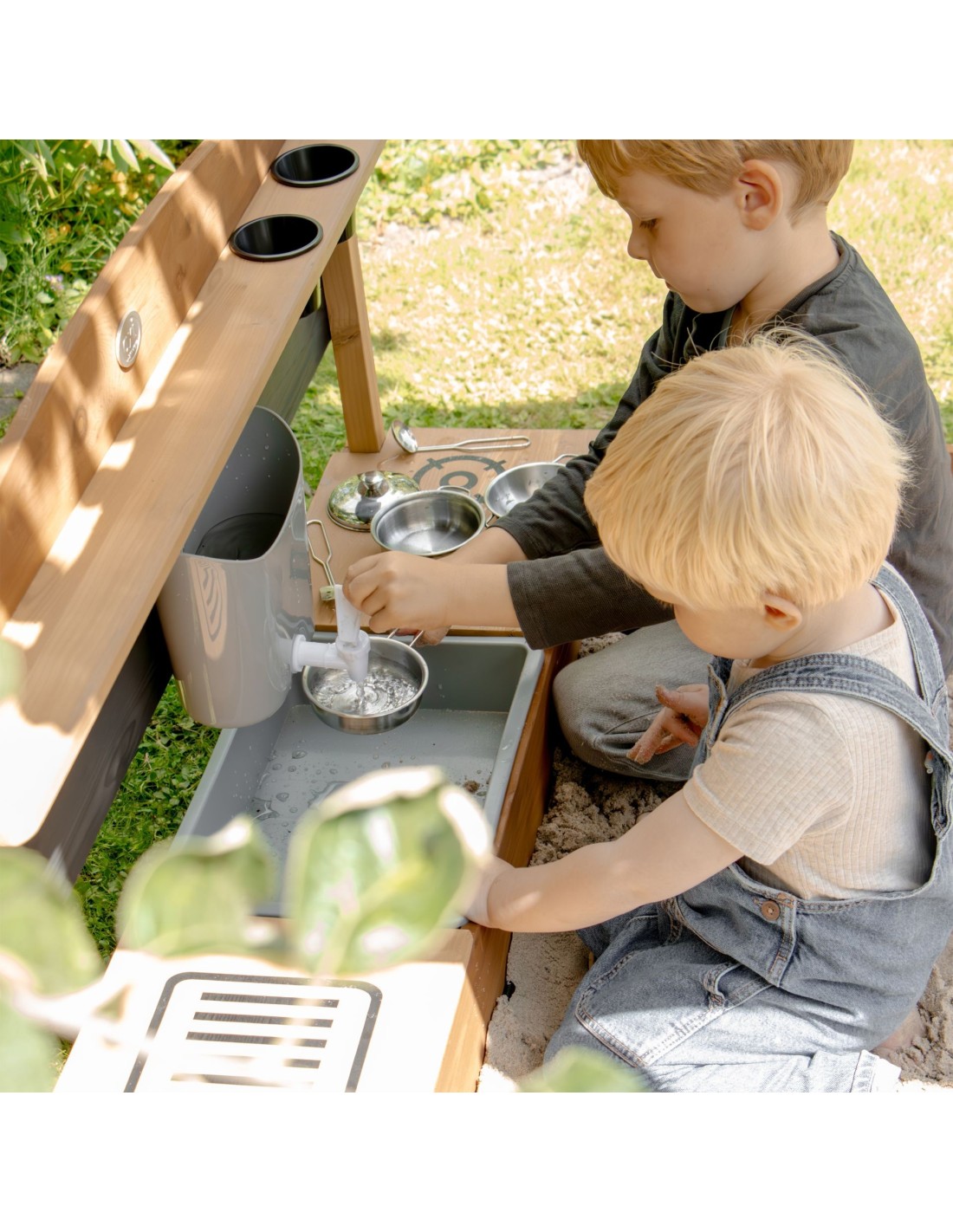 - Kuchnia z funkcjonalnym zlewem do zabaw z wodą, piaskiem i błotem. Pojemność zlewu 16l