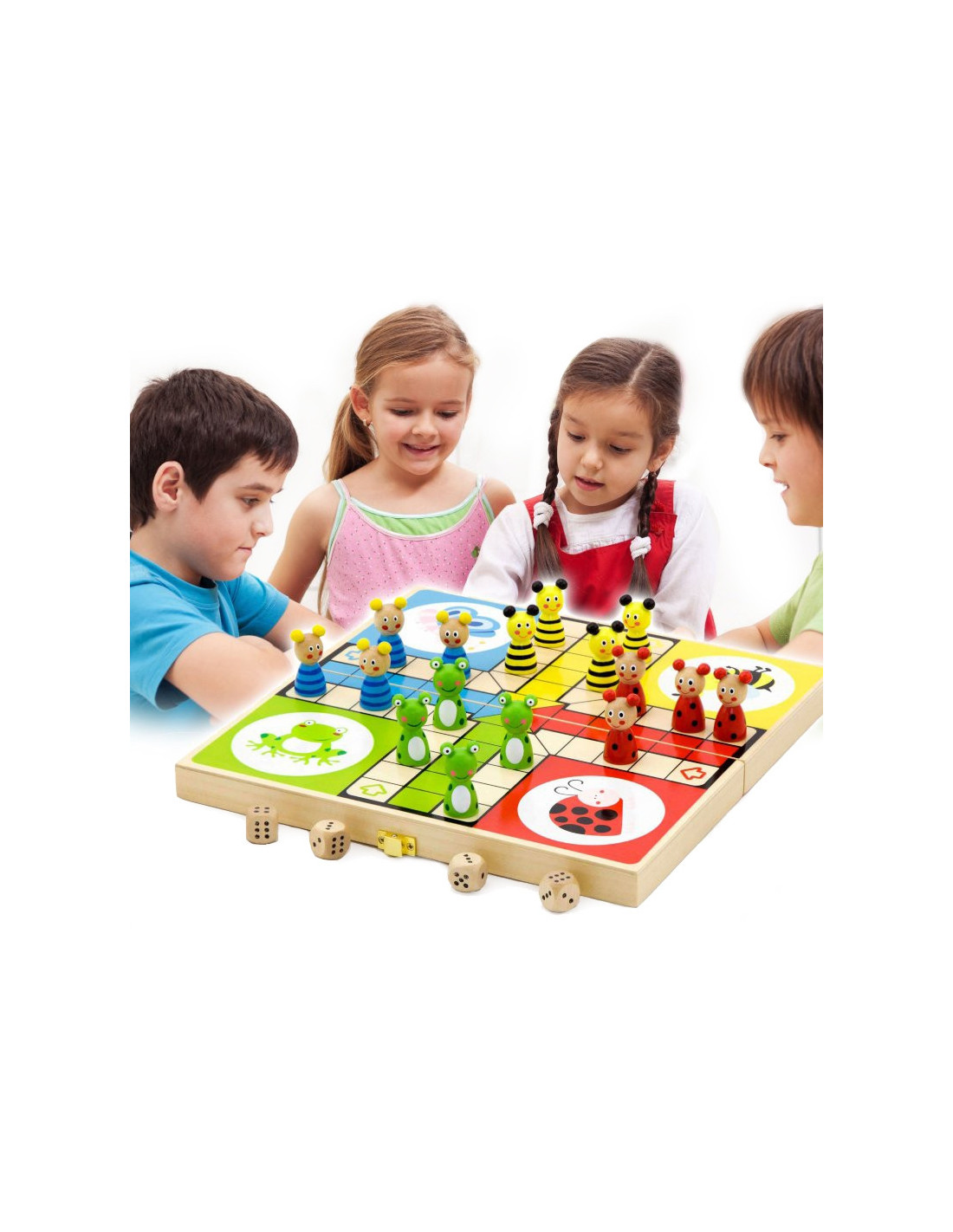 Gra planszowa Chińczyk jest dobrze znana dzieciom i dorosłym na całym świecie. Firma Viga przygotowała jej zupełnie nową odsłonę, która oczaruje malców. Zestaw zawiera cztery kostki, planszę-pudełko oraz szesnaście pięknie wykonanych figurek przedstawiających żabki, pszczółki, biedronki i motylki.