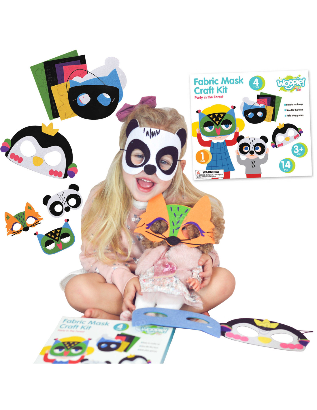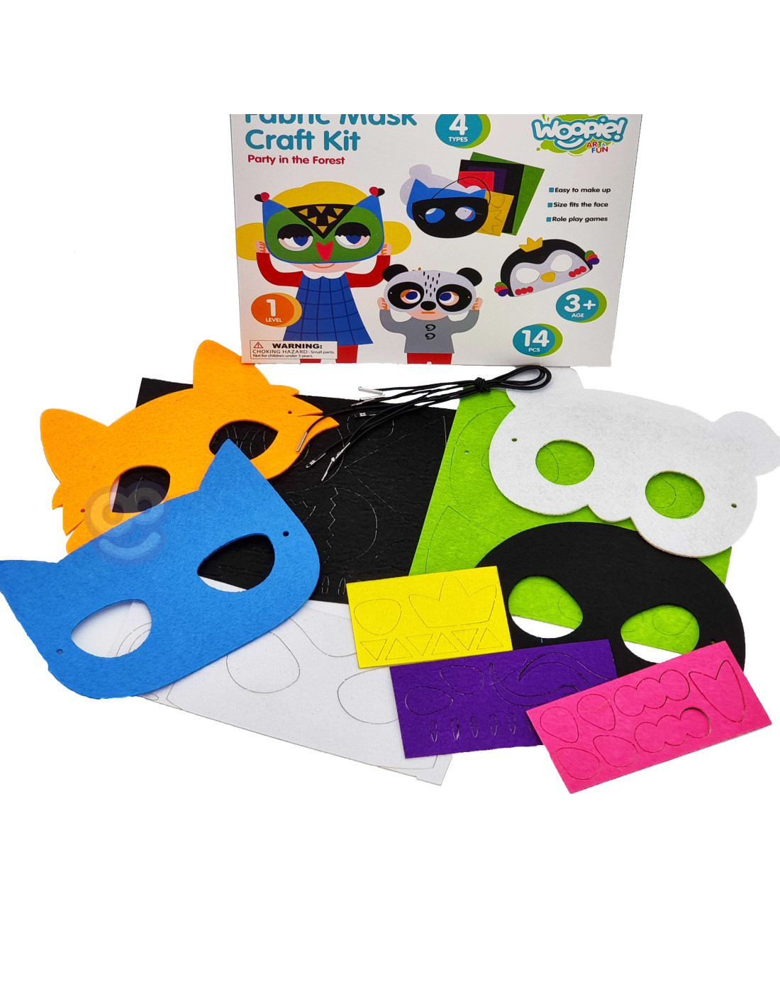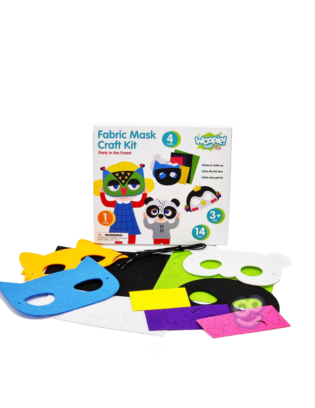 Zestaw Kreatywny Fabryka Masek Party w Lesie od marki WOOPIE z serii ART&FUN dostarczy kreatywnej zabawy samemu lub w gronie przyjaciół! Zestaw zapewnia ciekawą formę zabawy, która dostarczy wiele satysfakcji z tworzenia. Dziecko może stworzyć własną maskę zwierzęcia z lasu. Zestaw pozwala na stworzenie 4 różnych masek. Zestaw zawiera 14 el.: oprócz 4 podstaw masek, dołączone zostały 5 plansze z 75 elementami w 5 różnych kolorach do przystrojenia oraz 4 sznurki, które można łatwo regulować, aby dopasować maskę do głowy dziecka. Łatwe do wykonania - elementy z plansz można łatwo wydzielić oraz wystarczy oderwać papier ze samoprzylepnego spodu i nanieść elementy na maskę - nie wymaga kleju i nożyczek. Maski i elementy zostały wykonane z filcu. Można dowolnie łączyć ze sobą elementy - jedynym ograniczeniem jest wyobraźnia! Z tyłu opakowania zostały przedstawione przykłady wykonania masek. Po stworzeniu masek dziecko wraz z przyjaciółmi może odgrywać Zabawy plastyczne dodatkowo rozwijają zdolności manualne u dzieci tzw. "małą motorykę". Zestaw jest świetnym pomysłem na zabawę w gronie przyjaciół po stworzeniu masek dzieci mogą odgrywać i wcielać się w różne role!