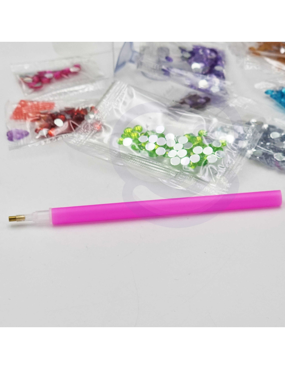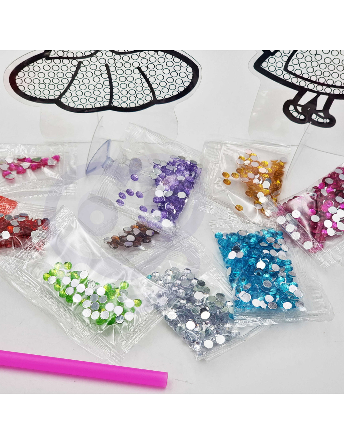 - - 12 naklejek w rozmiarach 6 - 7 cm na których nadrukowany jest wzór. Wzory pokryte są specjalną warstwą klejącą, która umożliwia klejenie diamencików,