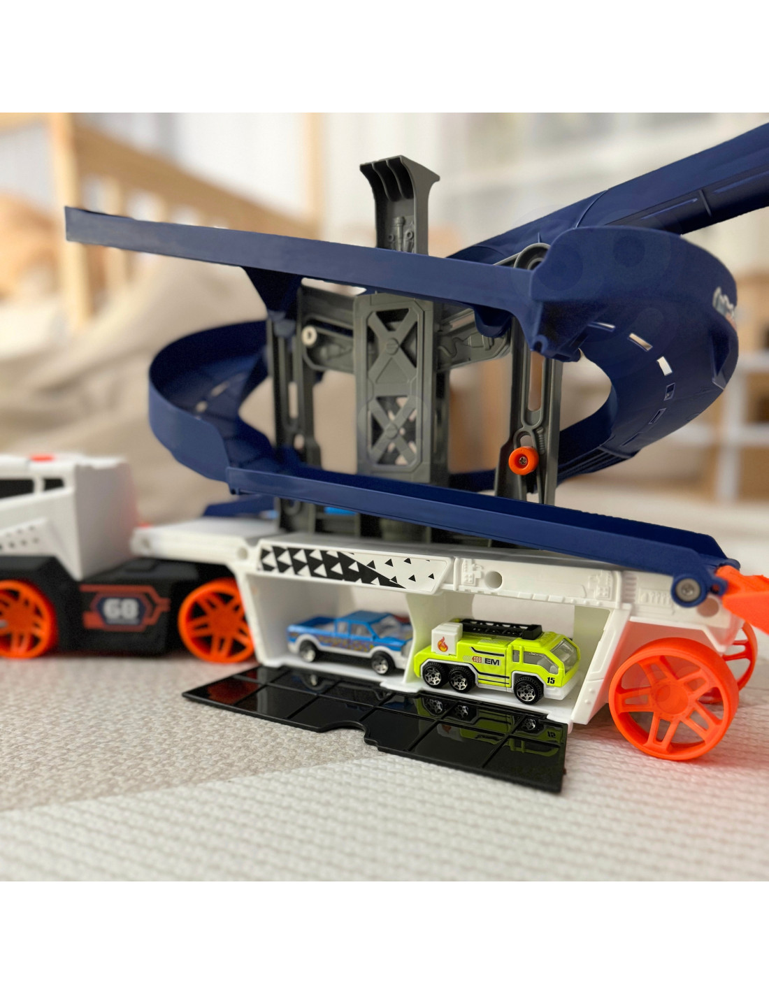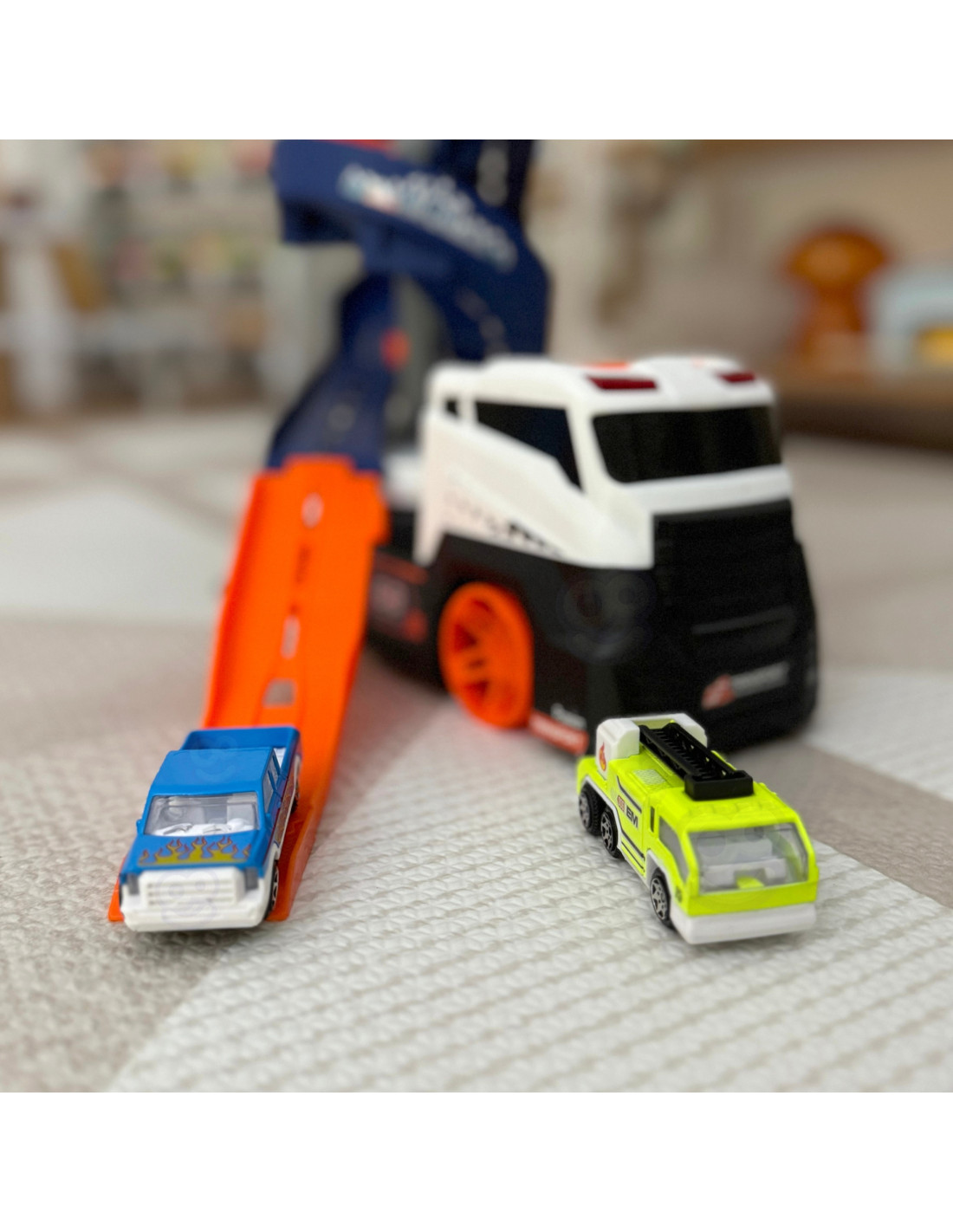 - - Zabawka posiada dodatkowy parking na górze naczepy, z którego dzieci mogą rozpędzać autka i wyskakiwać nimi, co wprowadza do zabawy element dynamiki i zręczności.