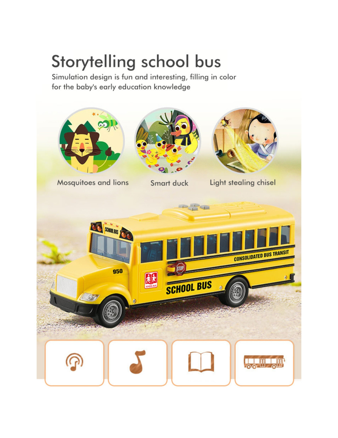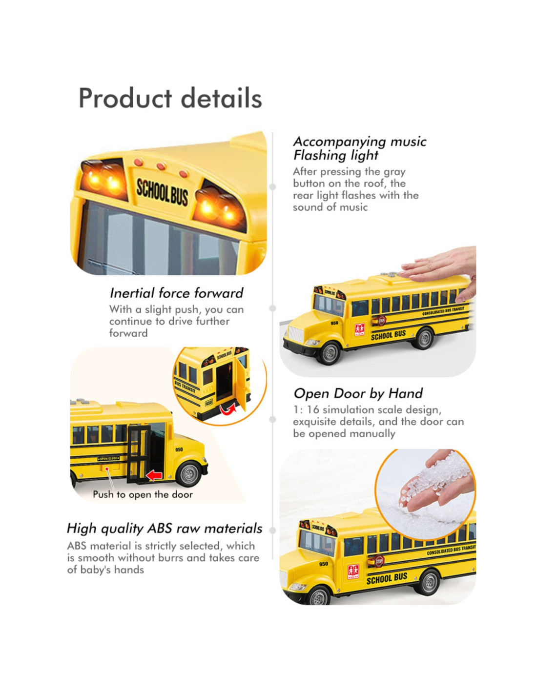 - - Efekty dźwiękowe – po naciśnięciu jednego z czterech przycisków na dachu pojazdu, autobus wydaje realistyczne odgłosy jazdy, odpalania silnika, cofania i klaksonu