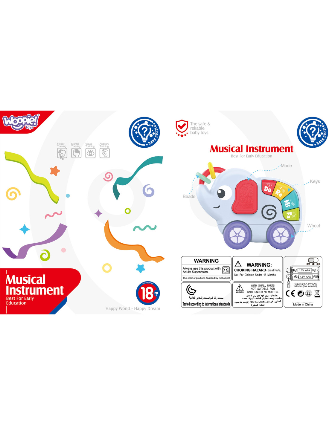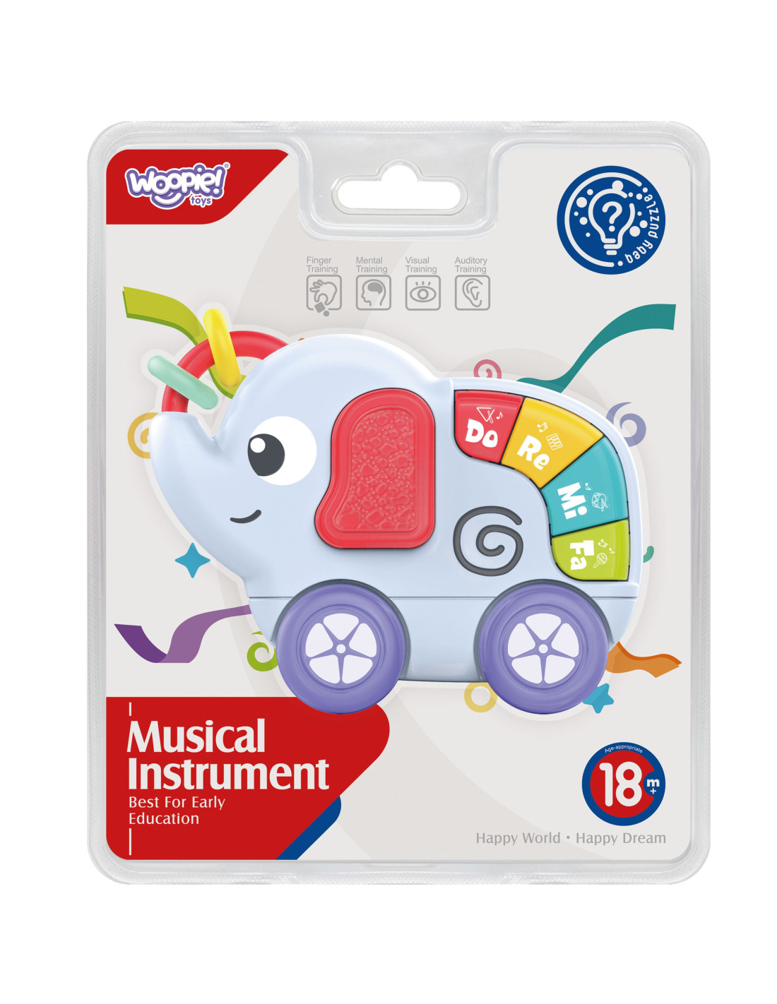 Interaktywny Słonik od marki Woopie do codziennej zabawy i rozwoju młodszych dzieci. Zabawka posiada 2 ruchome kółeczka, które dziecko może przesuwać, 4 kolorowe klawisze po naciśnięciu wydają dźwięki instrumentów muzycznych. Słonik posiada obrotowe kółeczka do pchania i ciągnięcia. Ucho słonika oraz trąba z kółeczkami wykonane są z miękkiego plastiku dzięki czemu zabawka może służyć jako gryzaczek. Maluch poprzez przesuwanie, naciskanie ćwiczy zręczność i koordynację ruchową. Efekty dźwiękowe przykują uwagę każdego dziecka.