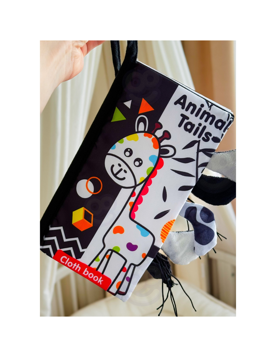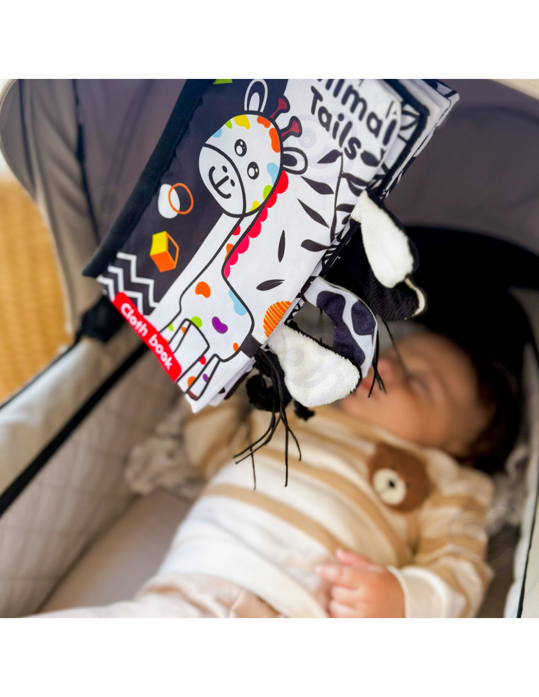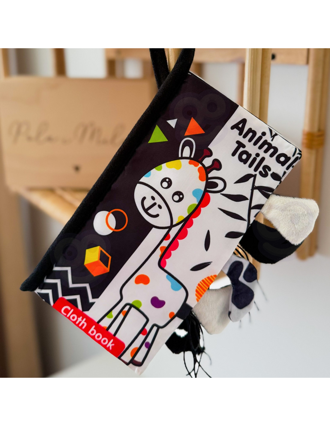 Książeczka kontrastowa od marki Woopie stworzona specjalnie dla maluchów. Szeleszczące i bardzo miękkie w dotyku strony rozwijają zmysły maluszka pełniąc funkcję sensoryczną. Czarno-białe ilustracje trenują wzrok i spostrzegawczość. W każdej ze stron wystają ogonki różnych zwierzątek, łapiąc za nię maluszek ćwiczy koordynację wzrokowo-ruchową. Książeczka może służyć jako zawieszka do wózka lub łóżeczka, mocowana na rzep.