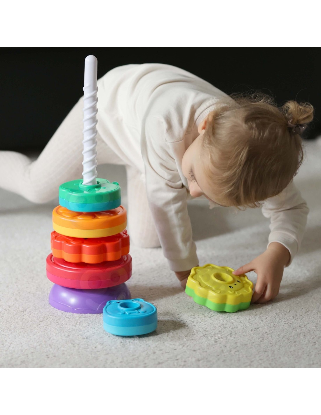 - Zestaw zawiera sześć krążków w różnych kształtach, które można układać na sobie, tworząc kolorową i kręcącą się piramidę