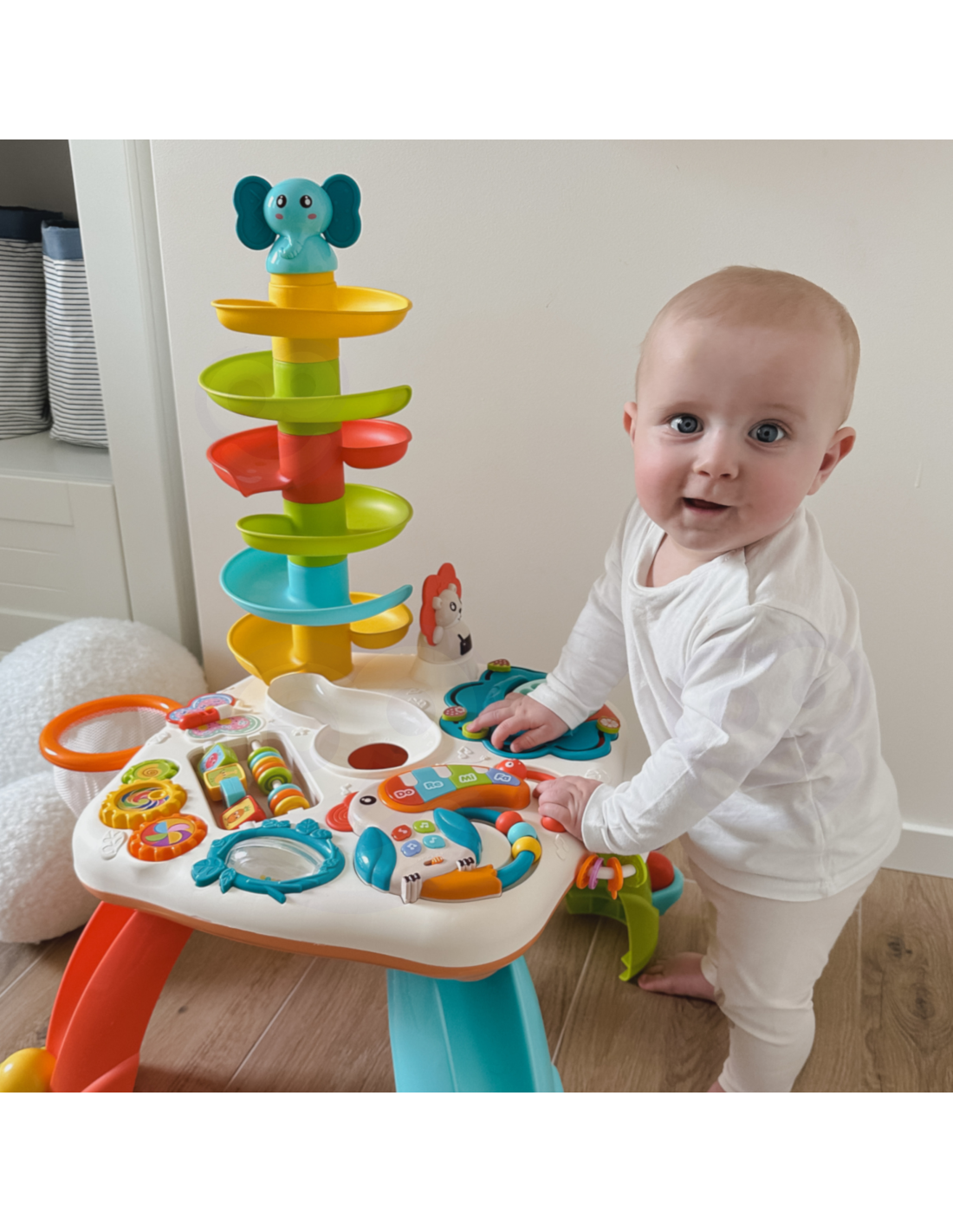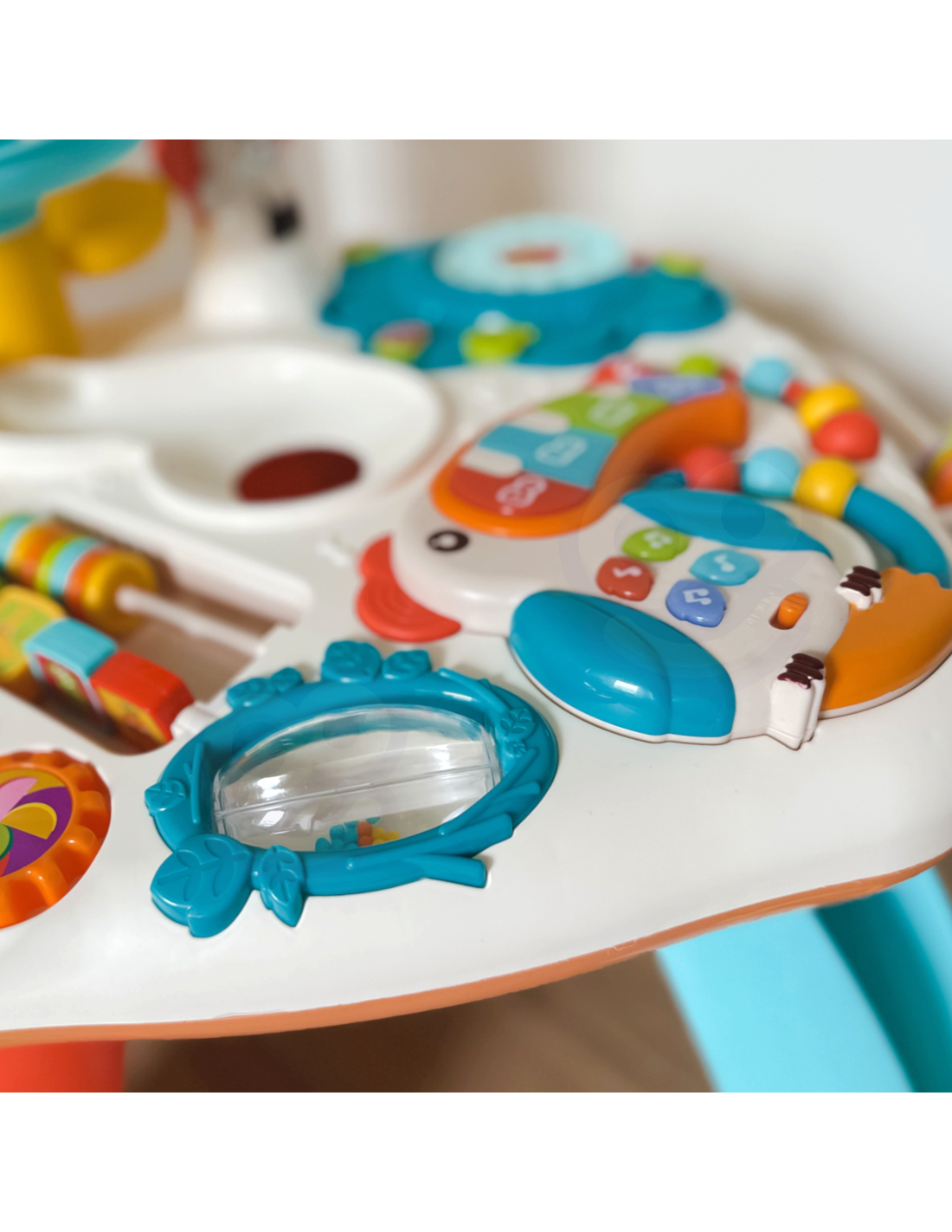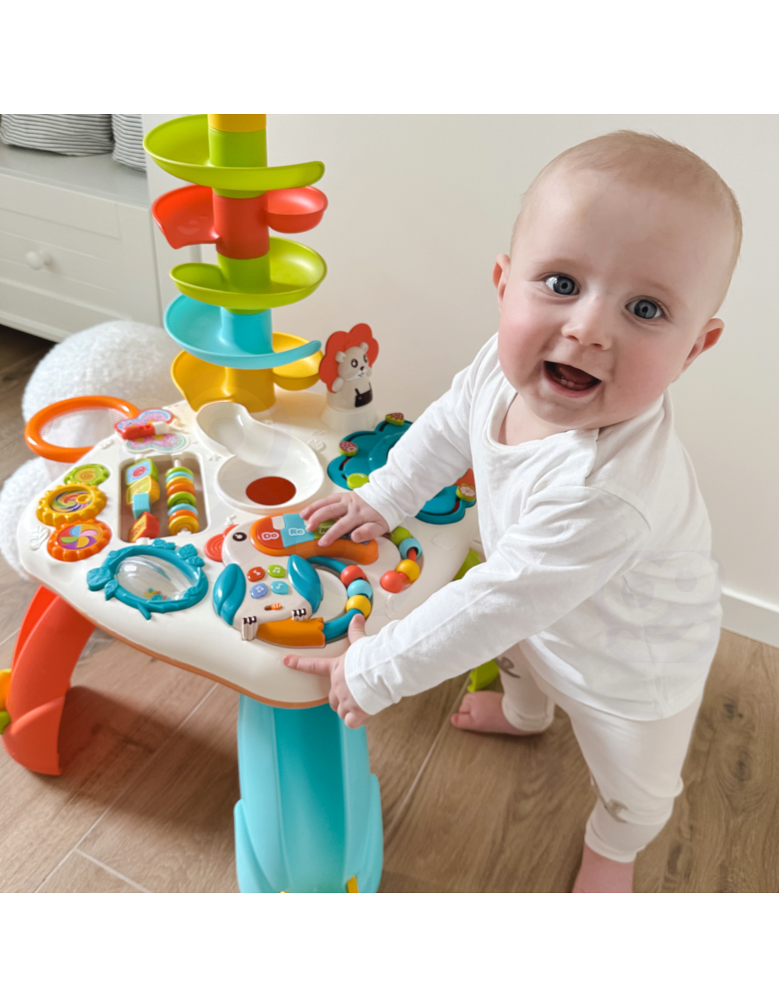 Stolik Edukacyjny Active Table od marki WOOPIE to zabawny i edukacyjny stolik dla maluchów, który zapewnia im godziny kreatywnej zabawy. Dzieci mogą bawić się kolorowymi kulkami i obserwować, jak kuleczki spadają po torze. Mogą też naciskać różne przyciski, które aktywują dźwięki i światła, i odkrywać nowe kształty, kolory i zwierzęta. Stolik ma również zabawki sensoryczne, takie jak grzechotka, lusterko i gryzak, które pobudzają zmysły dziecka. Active Table to idealny prezent dla dzieci, które lubią się uczyć przez zabawę.