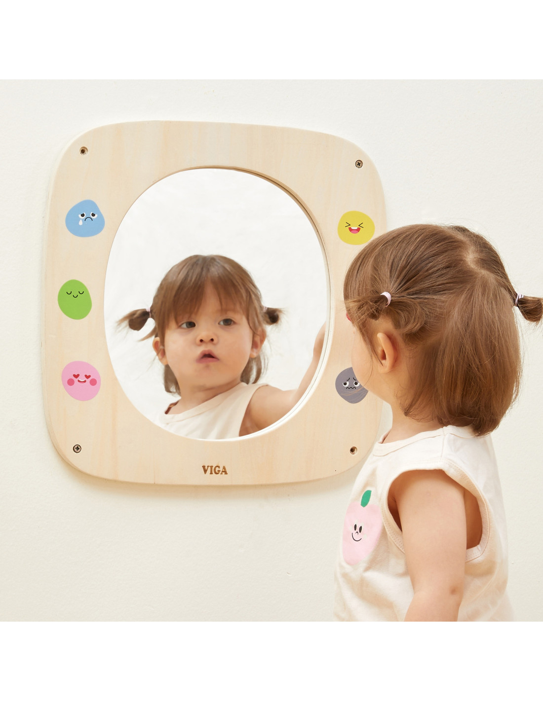 Ta drewniana tablica od marki Viga to idealne narzędzie do nauki poprzez zabawę, stworzone z myślą o małych dzieciach. Produkt pomaga w rozwoju emocjonalnym i motorycznym, pozwalając maluchom na odkrywanie świata emocji w interaktywny i angażujący sposób.W centrum tablicy znajduje się bezpieczne lusterko, otoczone sześcioma barwnymi, wyrazistymi twarzami, które przedstawiają różne emocje, takie jak radość, smutek, złość czy spokój. Dziecko może obserwować swoje odbicie i naśladować miny, co wspiera świadomość emocjonalną i pomaga w koordynacji mięśni twarzy. Tablica jest łatwa w montażu na ścianie, a jej solidna drewniana konstrukcja zapewnia trwałość i bezpieczeństwo podczas zabawy.