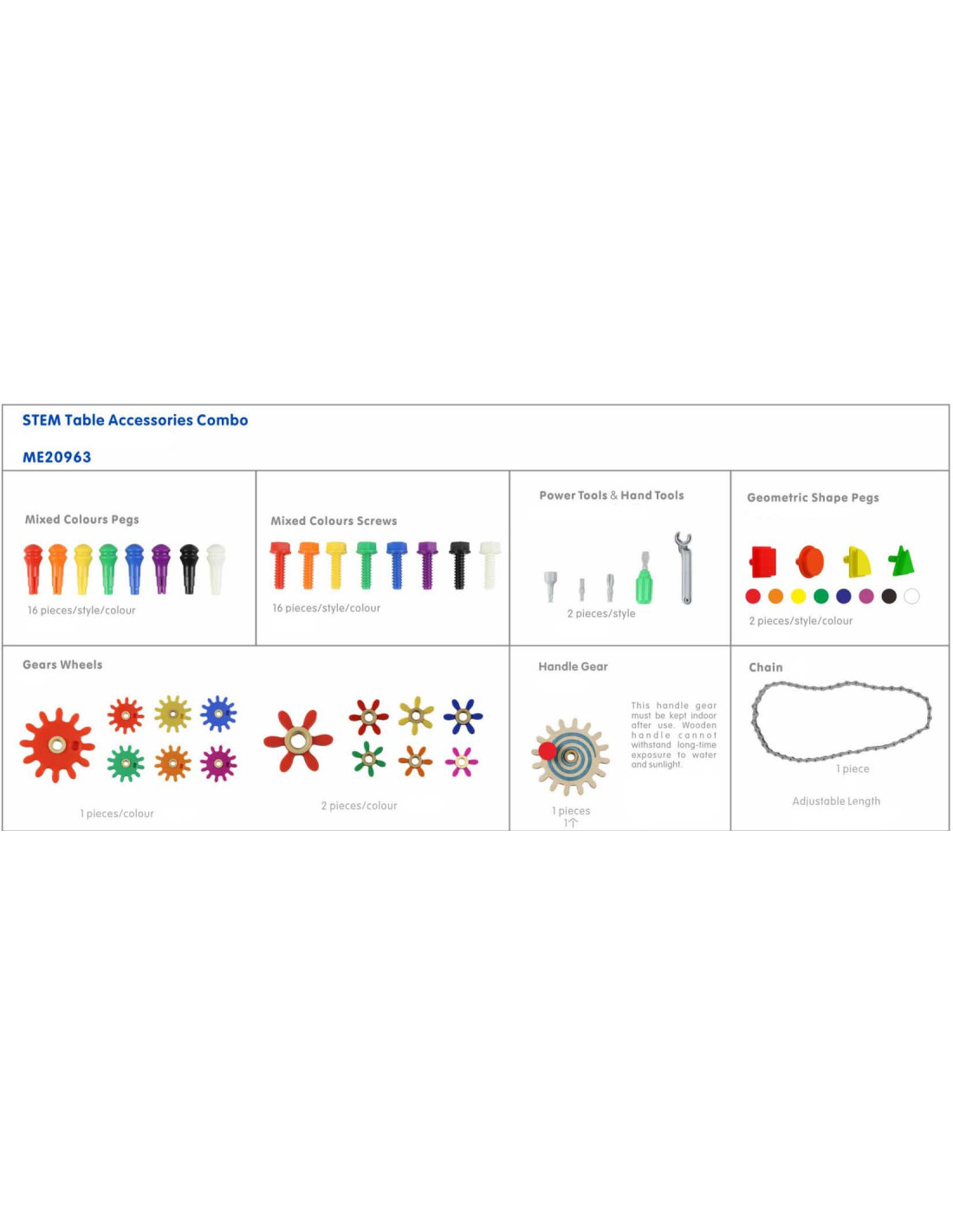 Stolik Edukacyjny STEM Masterkidz + Akcesoria pozwalają na kreatywną zabawę oraz poznawania świata nauki. Panel o wymiarach 63 x 63 (cm) posiada otwory, w które wkładając kolorowe i geometryczne kołeczki, śrubki, koła zębate można tworzyć przepiękne wzory.