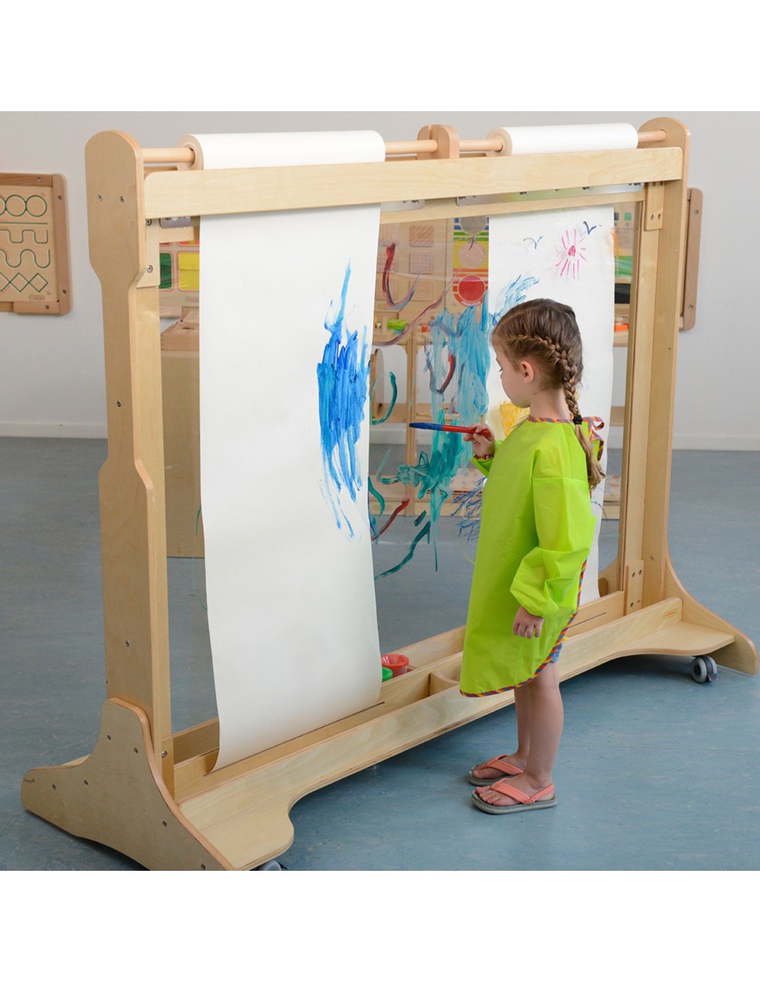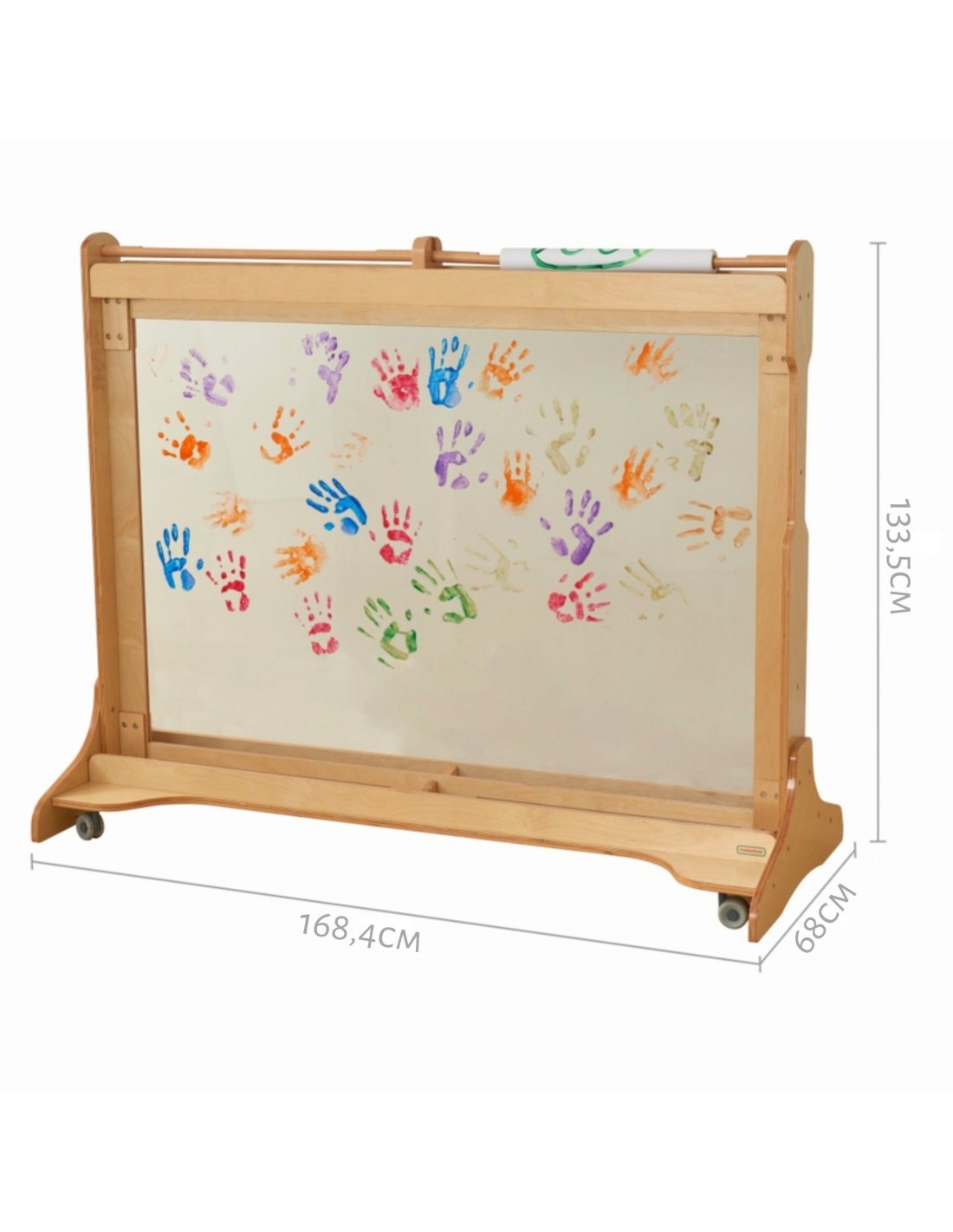 Okienko akrylowe umieszczone na specjalnym, wytrzymałym statywie z drewna. Dzieci mogą malować okienko z obu stron - zarówno pisakami, jak i farbami wodnymi. Po ukończonej zabawie, lub gdy chcemy zacząć malowanie od początku, czyszczenie jest dziecinnie proste. Okienko posiada również uchwyt na rolki z papierem - można malować na szkle, lub na papierze!