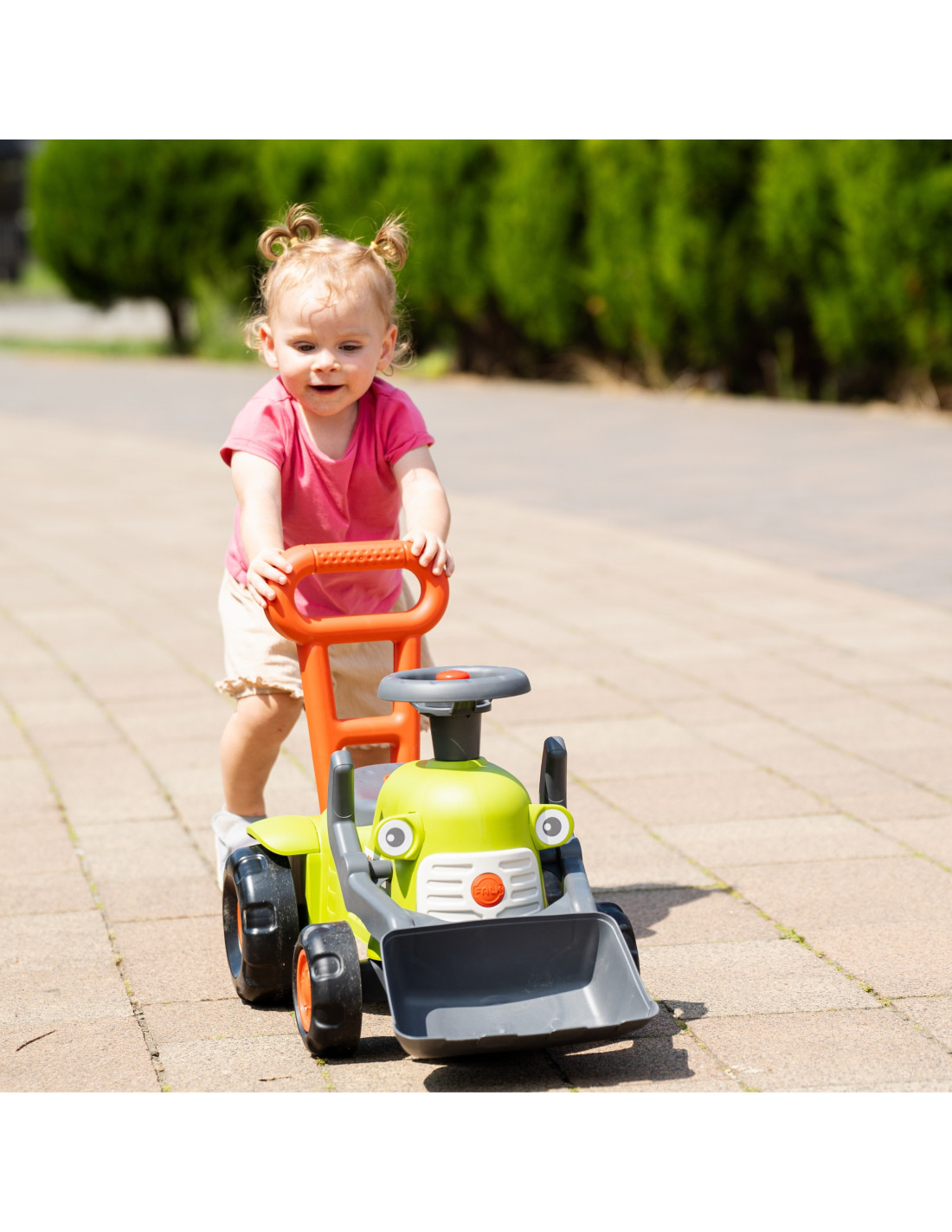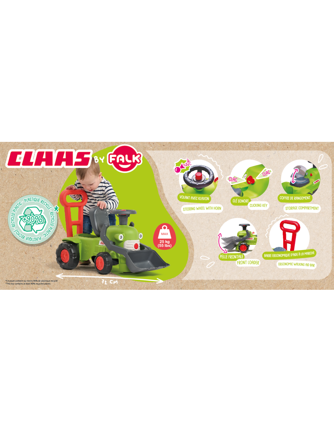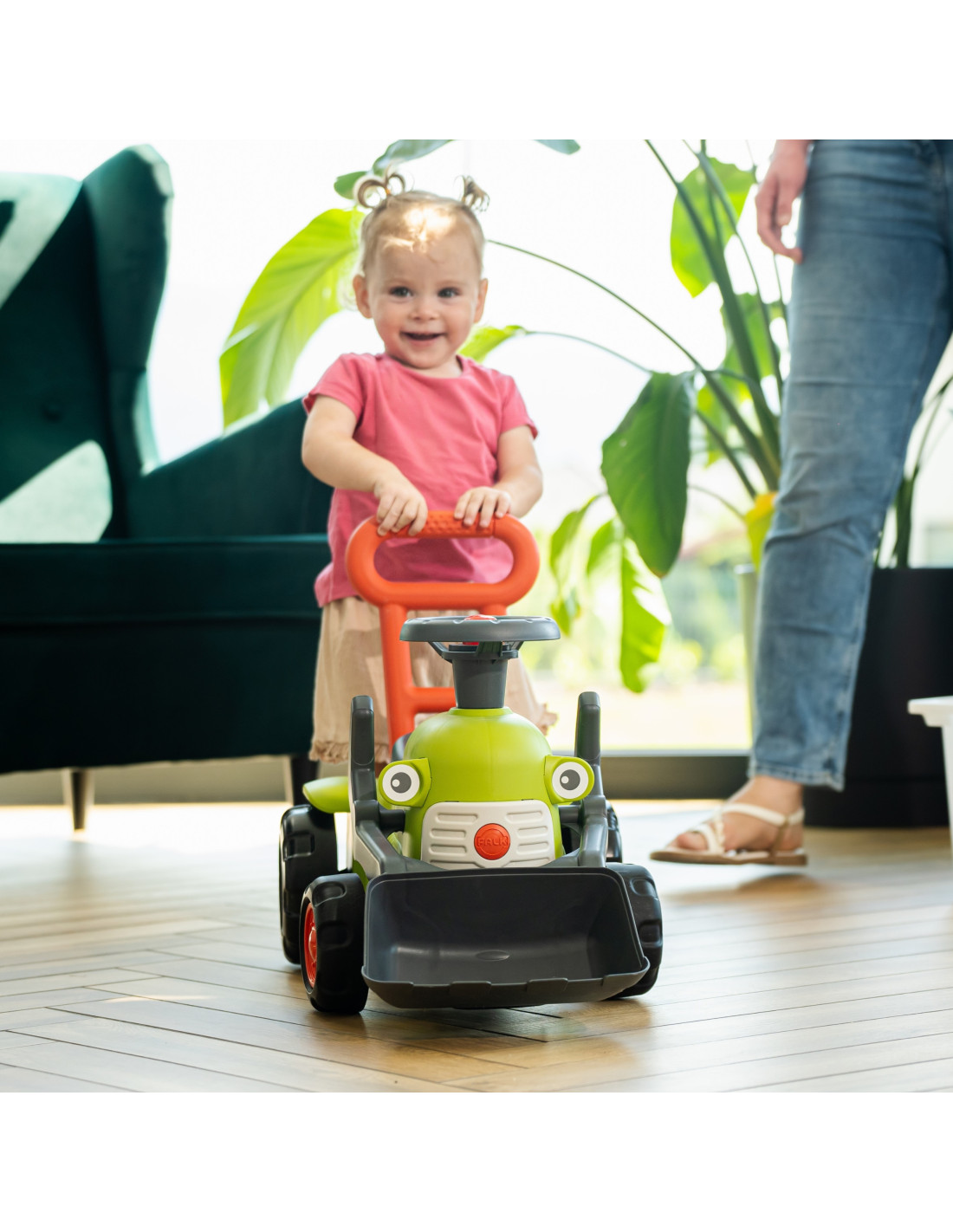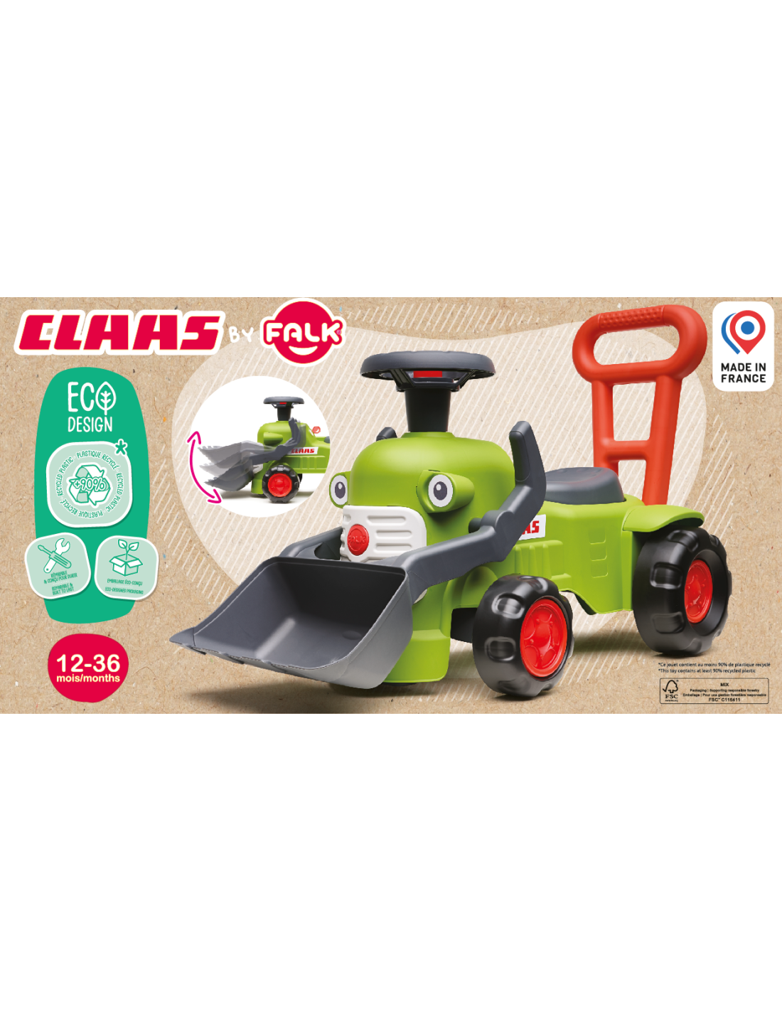 Traktor Claas Vintage Baby od marki Falk to uroczy i sprytny jeździk z ładowaczem, który doskonale sprawdzi się jako pomoc w stawianiu pierwszych kroków dla najmłodszych miłośników maszyn rolniczych. Ten mały jeździk towarzyszy dziecku już od 12 miesiąca życia, wspierając jego rozwój ruchowy. Wyposażony jest w ergonomiczną rączkę do pchania, pełniącą funkcję chodzika. Posiada w pełni funkcjonalny ruchomy ładowacz czołowy, który zwiększa atrakcyjność zabawy, pozwalając na załadunek i rozładunek. Ponadto, kierownica z wbudowanym klaksonem i mały dźwiękowy klawisz stanowią fantastyczne źródło stymulacji. Produkt jest w 100% wyprodukowany we Francji i wykonany w co najmniej 90% z plastiku z recyklingu, co czyni go wyborem przyjaznym dla środowiska.