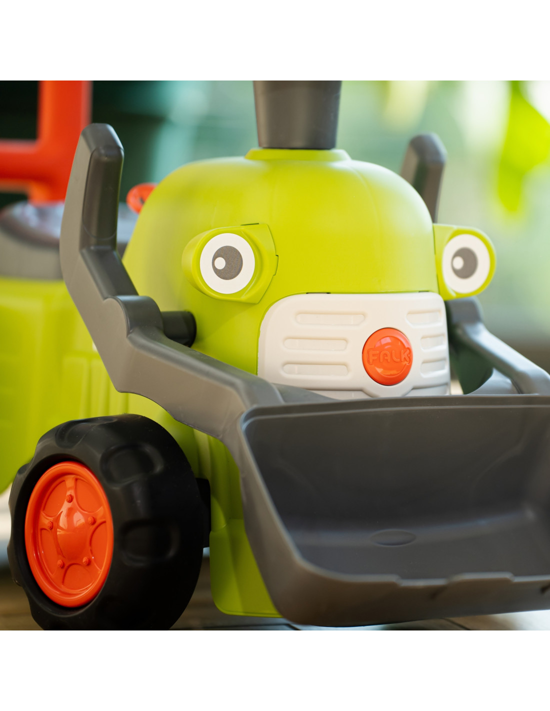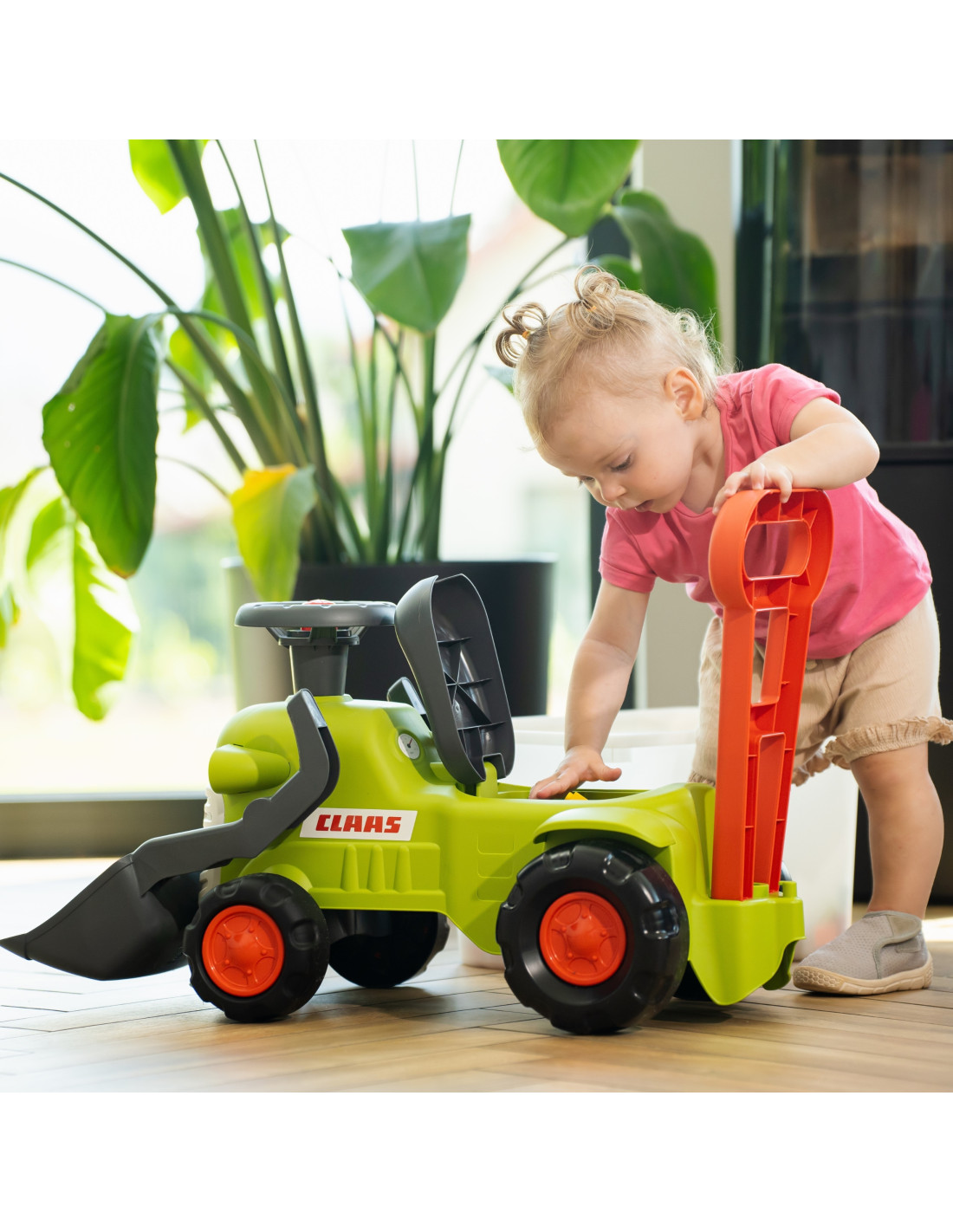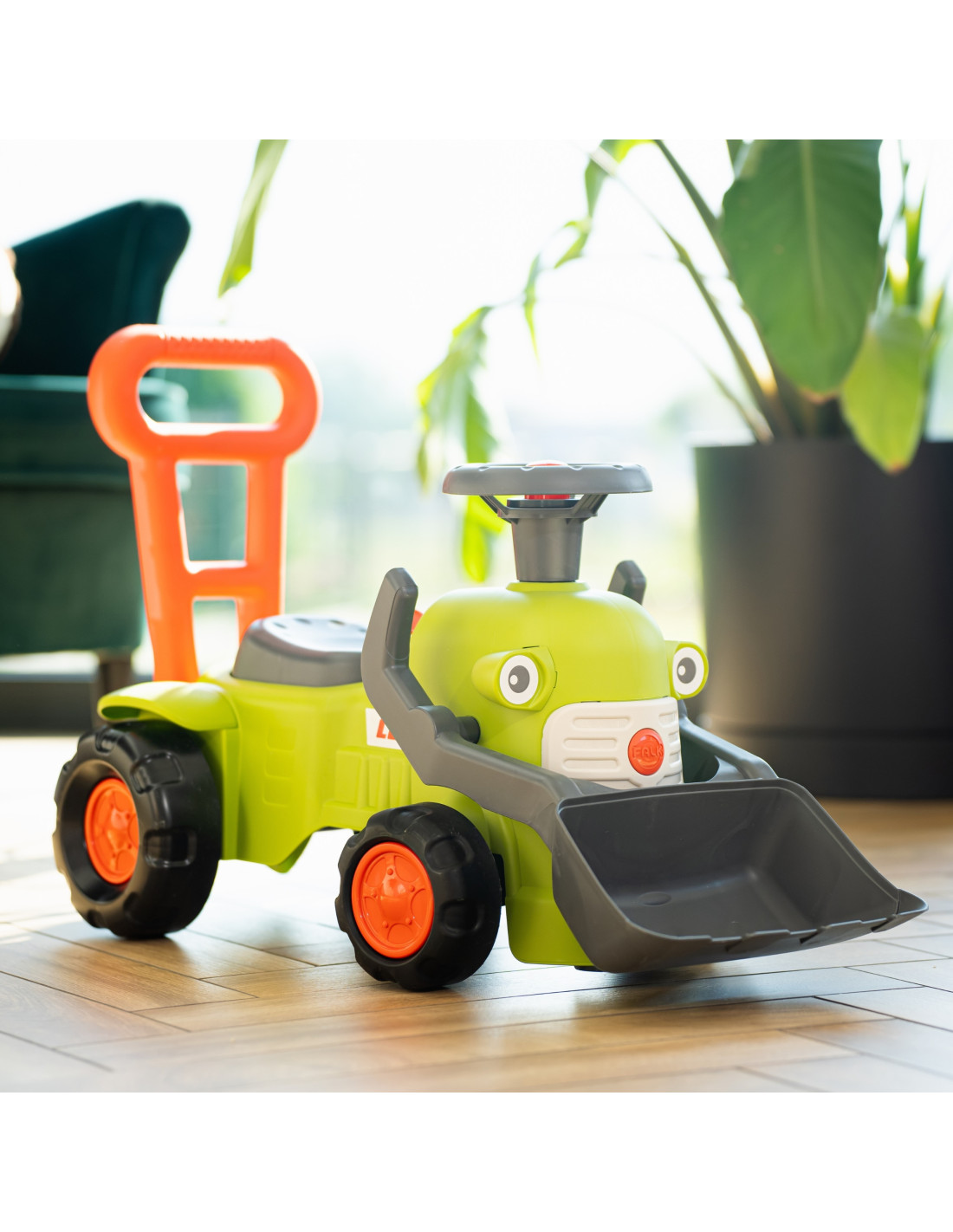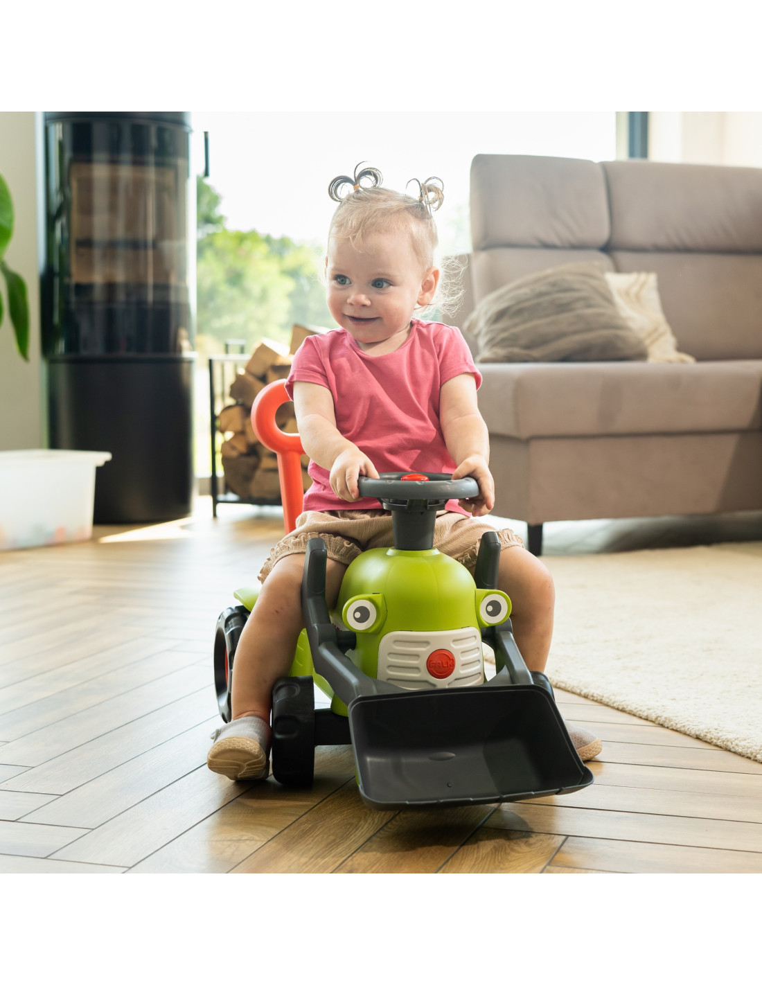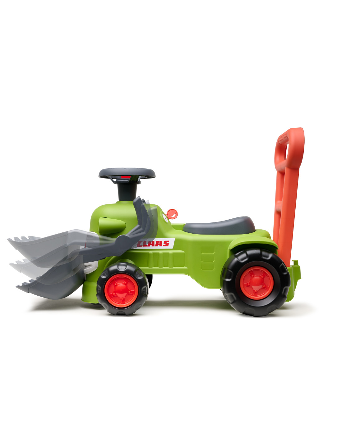 Traktor Claas Vintage Baby od marki Falk to uroczy i sprytny jeździk z ładowaczem, który doskonale sprawdzi się jako pomoc w stawianiu pierwszych kroków dla najmłodszych miłośników maszyn rolniczych. Ten mały jeździk towarzyszy dziecku już od 12 miesiąca życia, wspierając jego rozwój ruchowy. Wyposażony jest w ergonomiczną rączkę do pchania, pełniącą funkcję chodzika. Posiada w pełni funkcjonalny ruchomy ładowacz czołowy, który zwiększa atrakcyjność zabawy, pozwalając na załadunek i rozładunek. Ponadto, kierownica z wbudowanym klaksonem i mały dźwiękowy klawisz stanowią fantastyczne źródło stymulacji. Produkt jest w 100% wyprodukowany we Francji i wykonany w co najmniej 90% z plastiku z recyklingu, co czyni go wyborem przyjaznym dla środowiska.