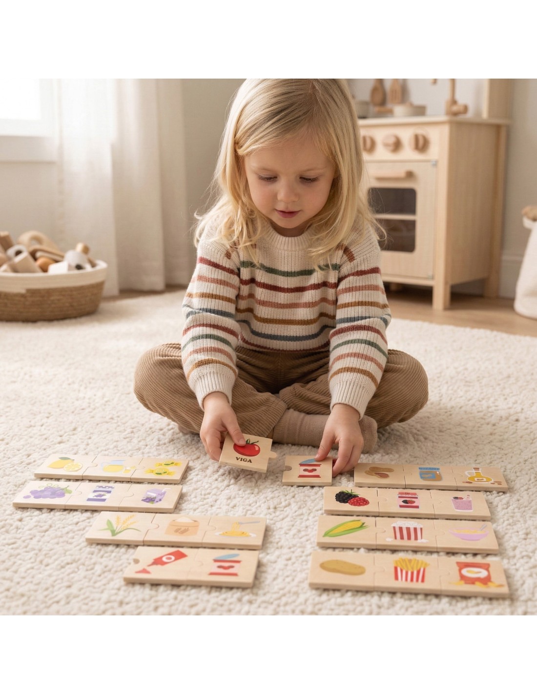 VIGA Zestaw Puzzli Odkrywaj Związki Między Naturą a Jedzeniem uczy dzieci w zabawny sposób, jak produkty roślinne są przetwarzane na pyszne produkty spożywcze. Dopasowując rośliny i zbiory do produktów, takich jak popcorn, płatki zbożowe, masło orzechowe czy makaron, maluchy odkrywają, skąd pochodzą te codzienne przysmaki. Tego rodzaju zabawa rozwija zrozumienie procesów związanych z produkcją żywności i zachęca do poznawania etapów przetwarzania plonów.