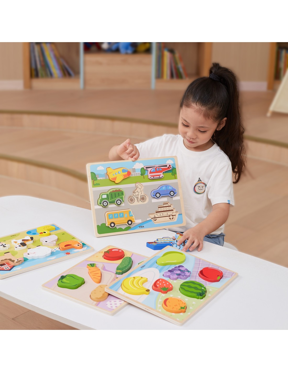 Drewniane Puzzle od marki VIGA w motywie warzyw. W zestawie znajduje się kolorowa plansza oraz 7 elementów. Zabawa polega na dopasowaniu kafelków warzyw do odpowiednich miejsc na kolorowej podstawce, na której dla ułatwienia znajdziemy rysunki brakujących elementów. Taka zabawa pomoże kształtować precyzję ruchów rączek, oraz poprawić koordynację wzrokowo-ruchową, a także ćwiczyć pamięć, logiczne myślenie i koncentrację. Dzięki grubości elementów, puzzle mogą być wykorzystywane do innych zabaw jako figurki.