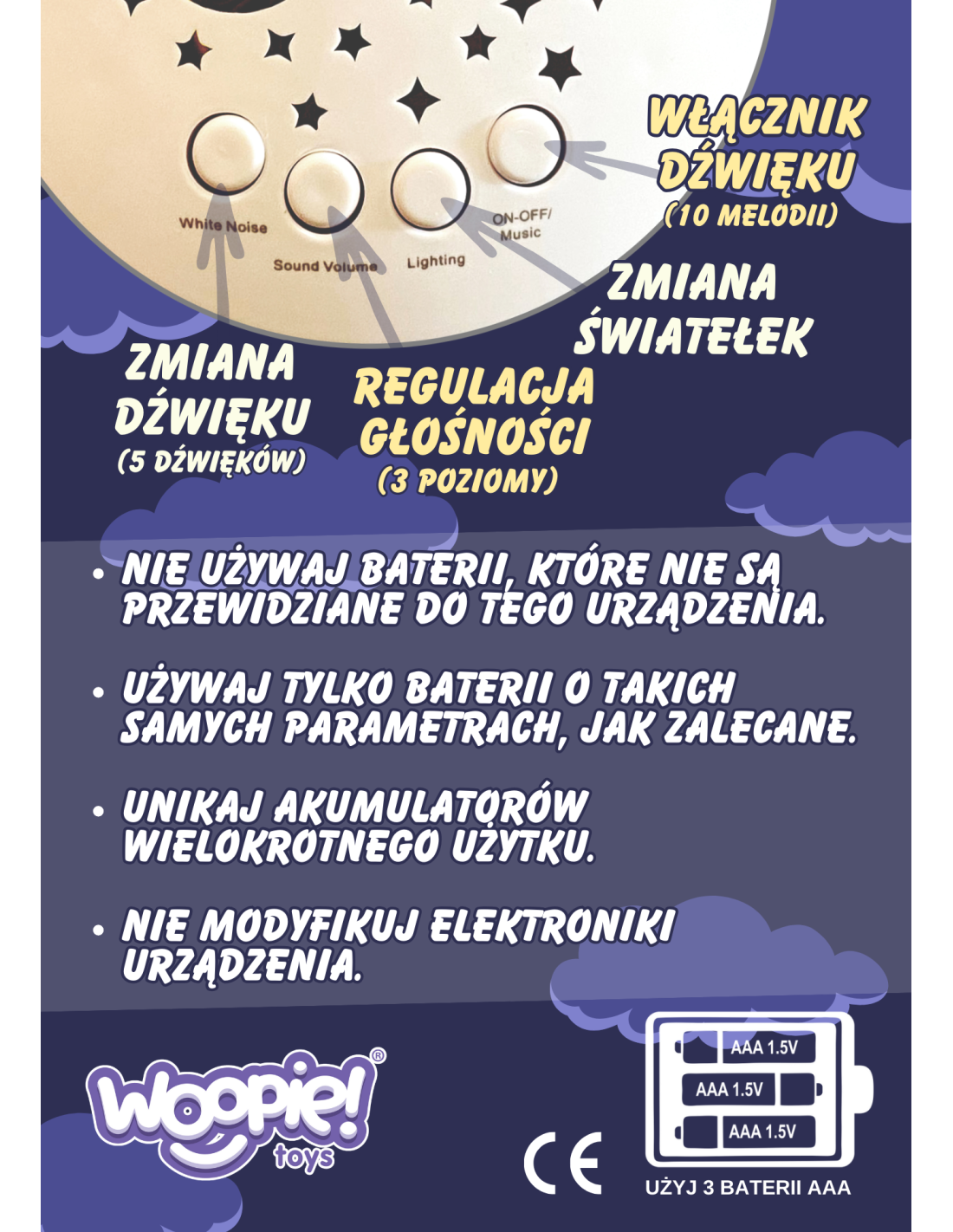 - - efekty świetlne i dźwiękowe - melodie/kołysanki pomagające zasnąć + projektor zmieniający kolory,