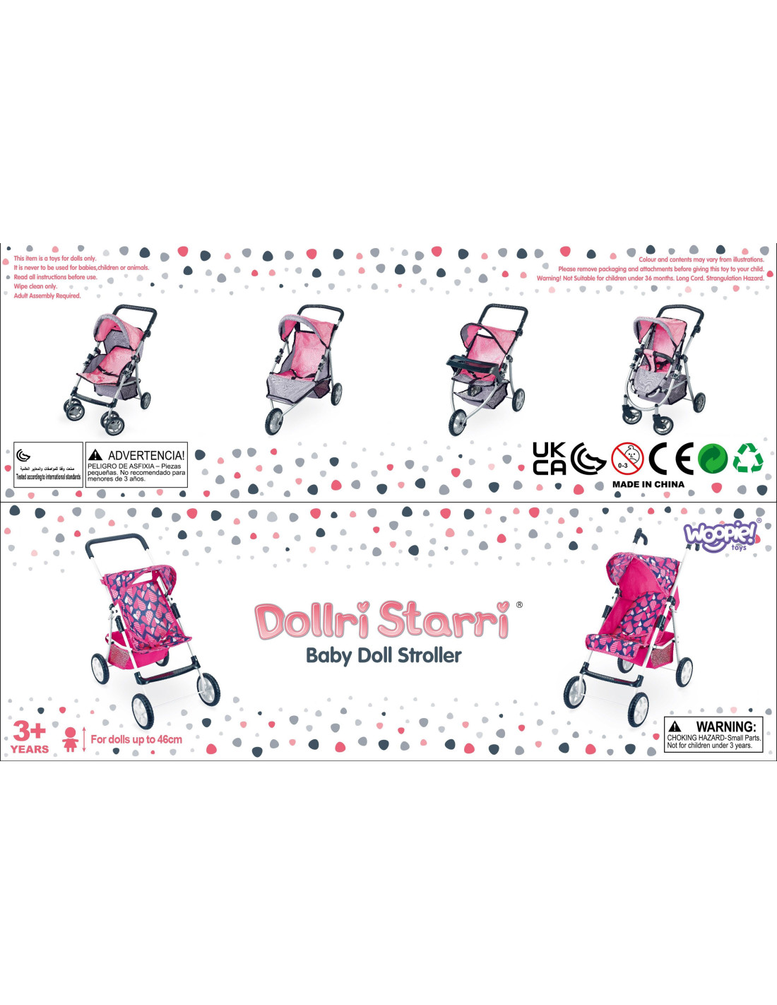 Stylowy i funkcjonalny wózek dla lalek od marki WOOPIE to wymarzony prezent każdej małej miłośniczki zabawy lalkami. Dzięki regulowanemu siedzisku można go łatwo dostosować do różnych potrzeb zabawy, umożliwiając przewożenie ulubionych lalek. Obracające się przednie koła gwarantują płynność prowadzenia, a solidna konstrukcja zapewnia stabilność podczas spacerów. Wózek wyposażono w miękką, wygodną rączkę i pojemny koszyk na akcesoria, który pomieści wszystkie drobiazgi niezbędne podczas zabawy. Składany daszek chroni lalki przed "słońcem", a kompaktowa konstrukcja sprawia, że wózek łatwo przechowywać, gdy zabawa dobiegnie końca.