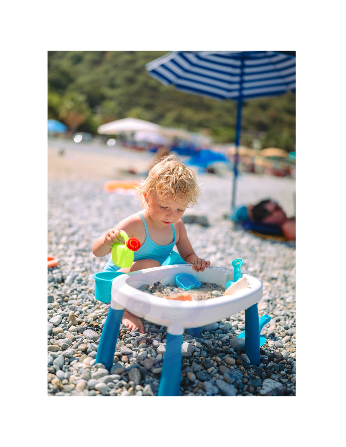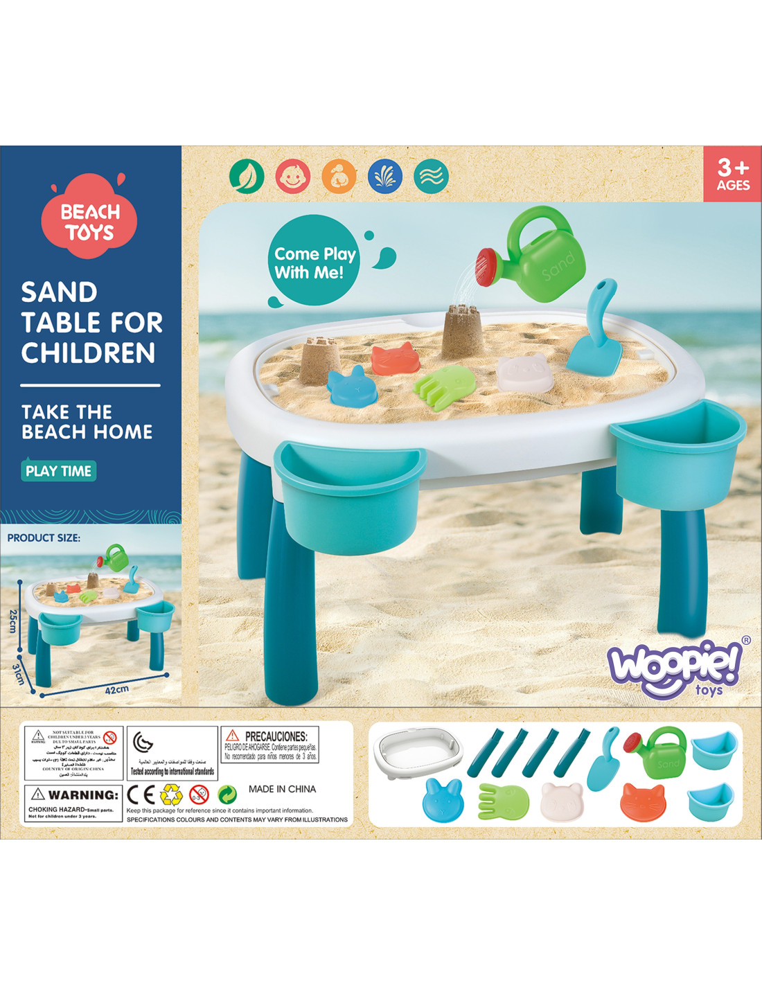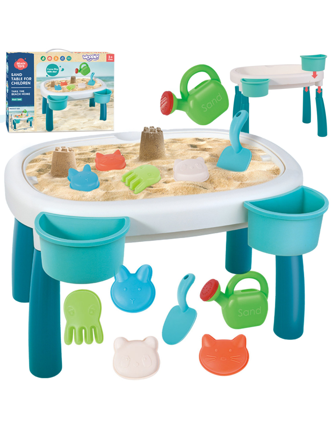 Stół Do Piasku od marki WOOPIE jest idealną zabawka do zabawy z wodą i piaskiem. Zestaw zawiera 7 el: stolik z wyciąganymi nóżkami i 2 pojemnikami, 4 foremki (ośmiornicę, kotka, pandę i króliczka), konewkę i łopatkę. Zestaw jest przeznaczony do zabawy w domu i na plaży lub piaskownicy.