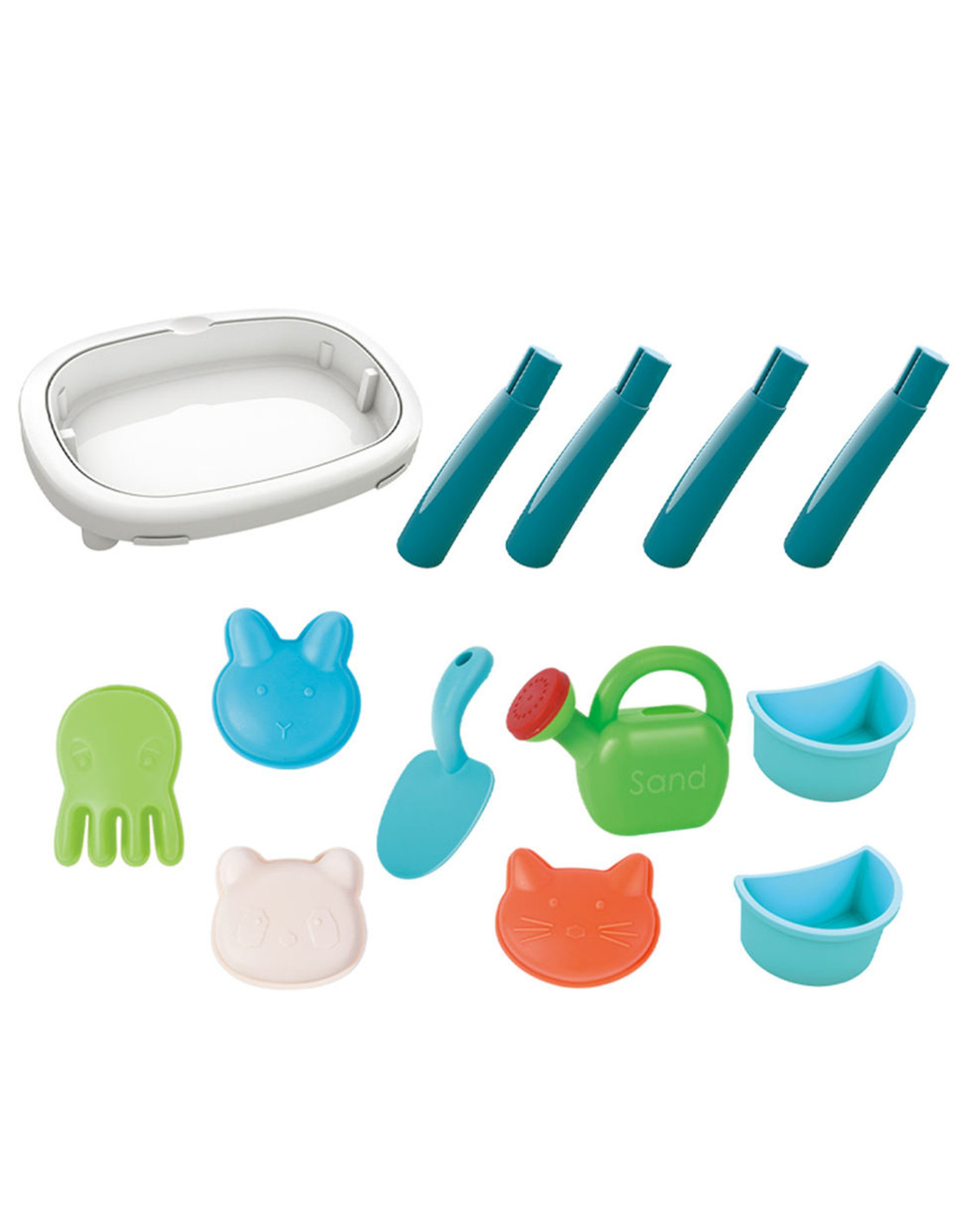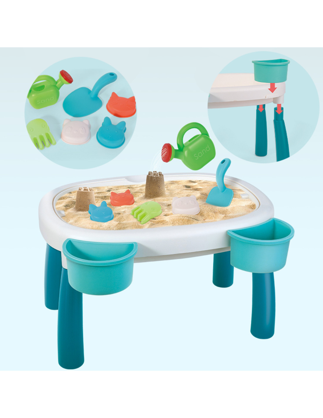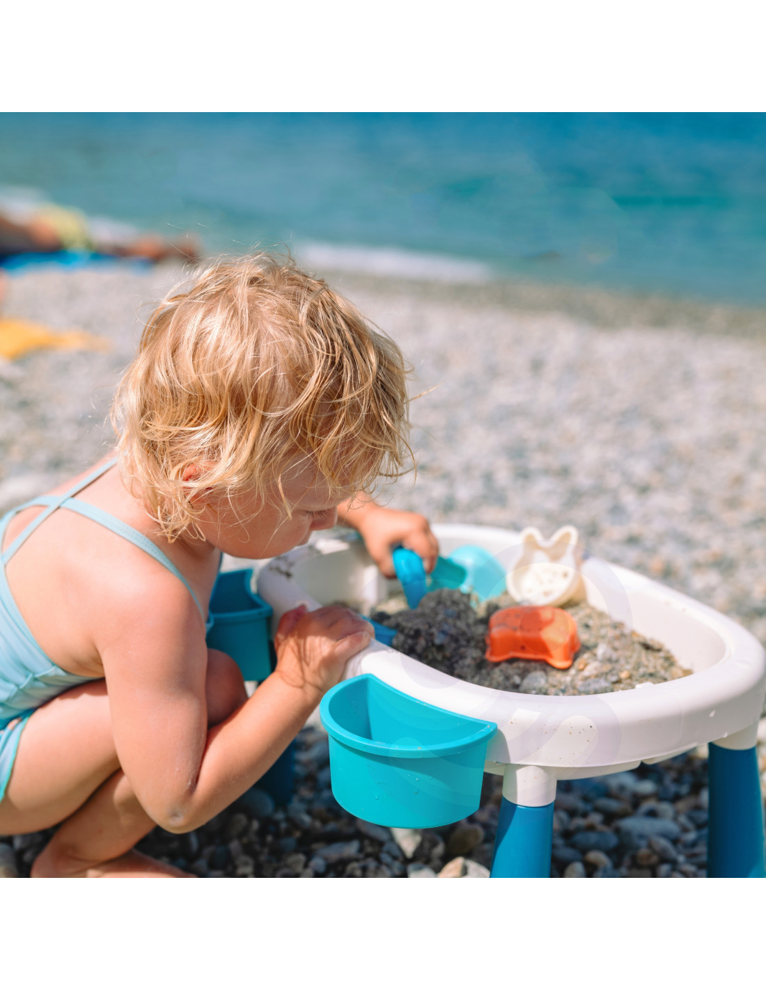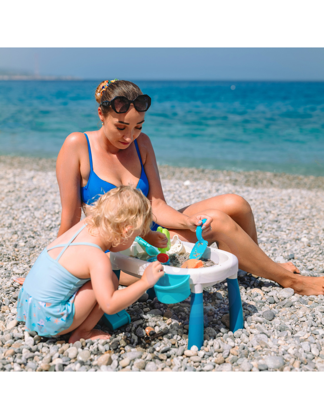 Stół Do Piasku od marki WOOPIE jest idealną zabawka do zabawy z wodą i piaskiem. Zestaw zawiera 7 el: stolik z wyciąganymi nóżkami i 2 pojemnikami, 4 foremki (ośmiornicę, kotka, pandę i króliczka), konewkę i łopatkę. Zestaw jest przeznaczony do zabawy w domu i na plaży lub piaskownicy.