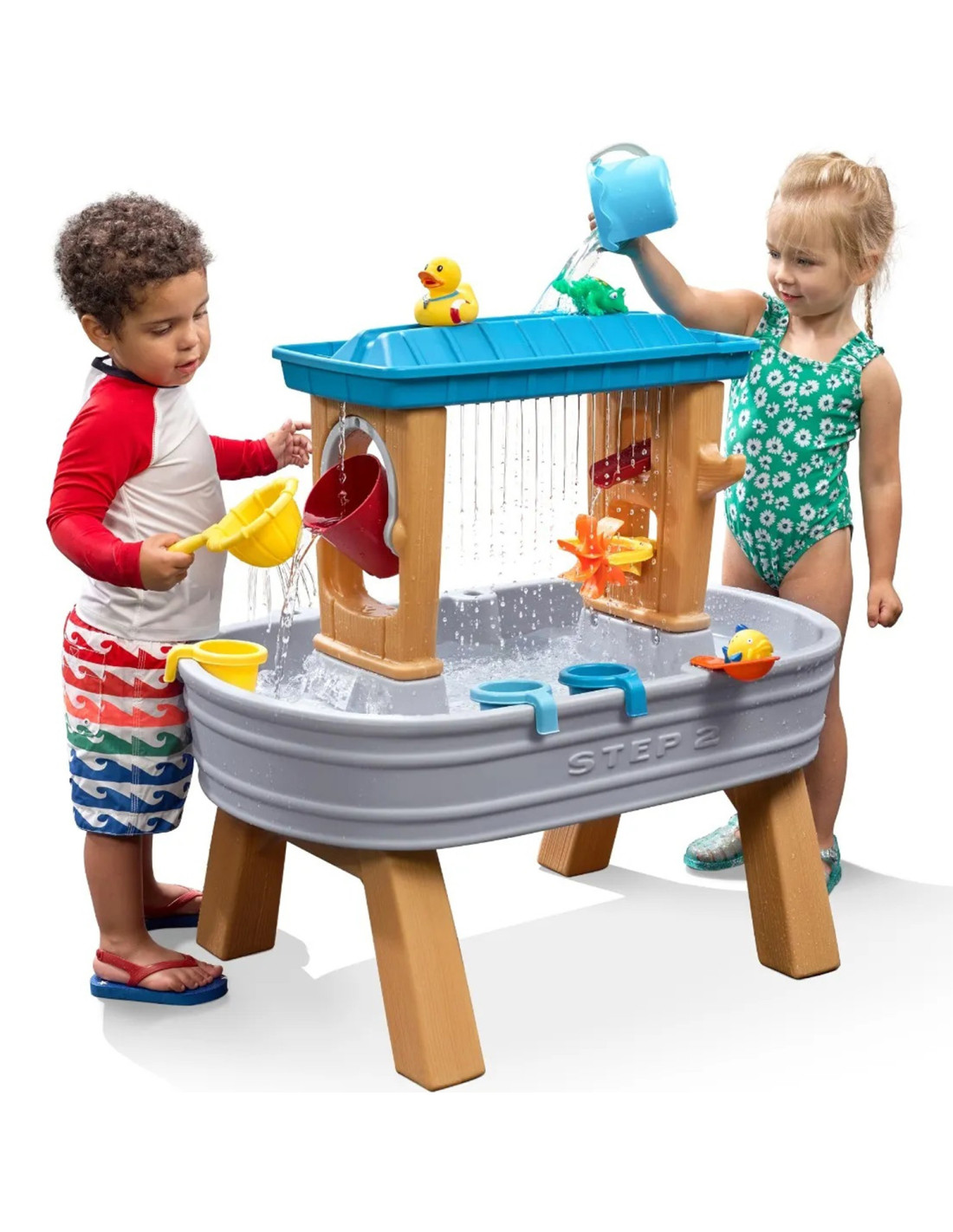 Wszechstronna zabawa w wodzie zaczyna się od uroczego dziecięcego stołu wodnego. Spraw sobie przyjemność dzięki zabawie w wodzie. Dwustronna taca tworzy realistyczny efekt deszczu – wystarczy wlać wodę, aby zabawa się zaczęła! Woda z tacy umieszczona na górze tworzy realistyczny efekt deszczu. Z jednej strony przelewa się także ona do wiadra które po napełnieniu się obraca i wylewa wodę, zaś z drugiej strony jest rynienka która kieruje wodę wprost na wirujący wiatraczek. Zestaw posiada także wyskocznie dla zwierzątek, uchwyt na wiaderko oraz sitko. Całość ląduje w brodziku na samym dole.
