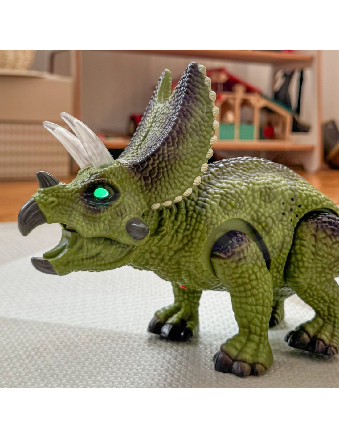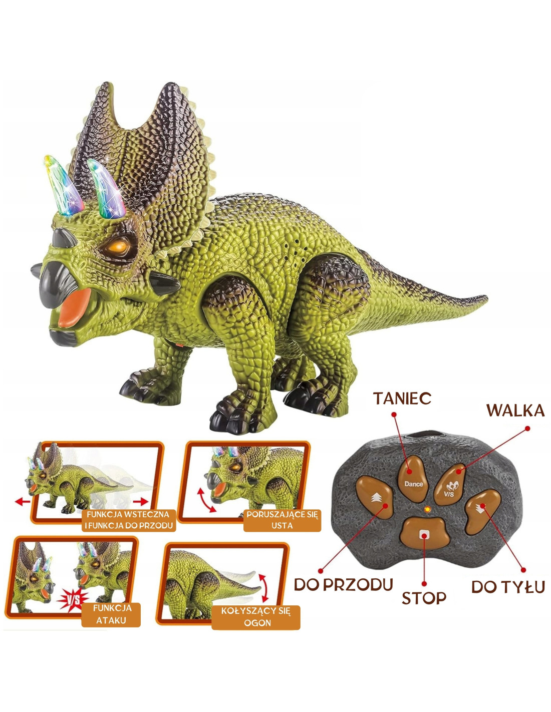 - - efekty świetlne: kolorowe, świecące rogi oraz świecące oczy dinozaura