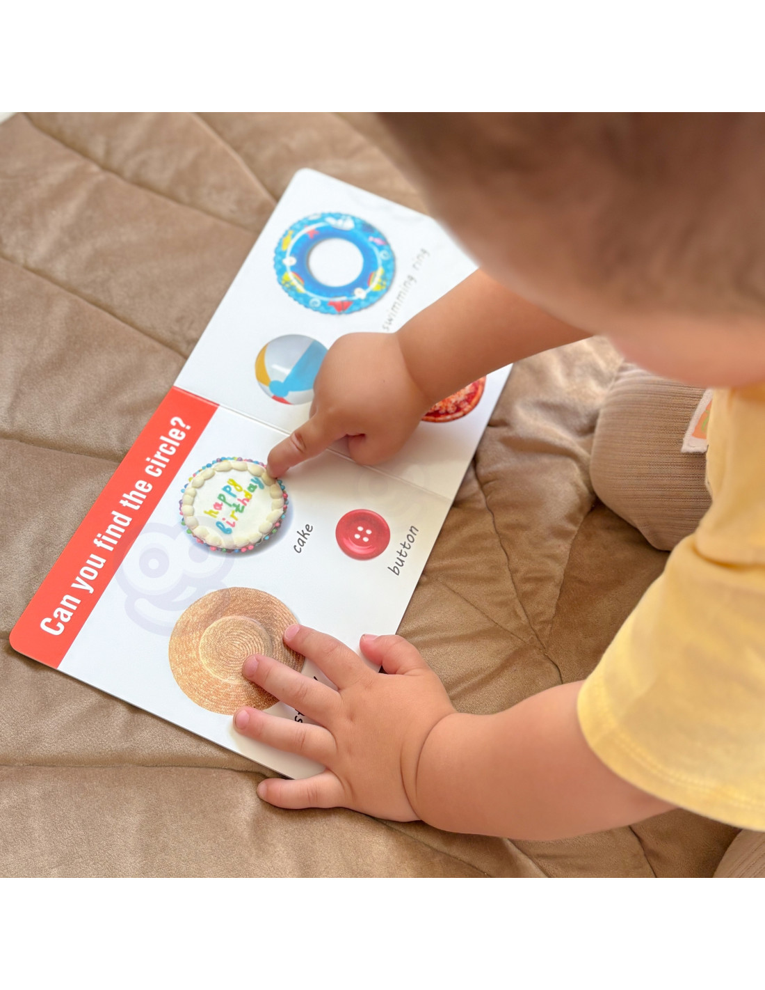 Kolorowa książeczka z ilustracjami i podpisami kształtów geometrycznych oraz przedmiotów codziennego użytku, rozwijająca słownictwo i spostrzegawczość.