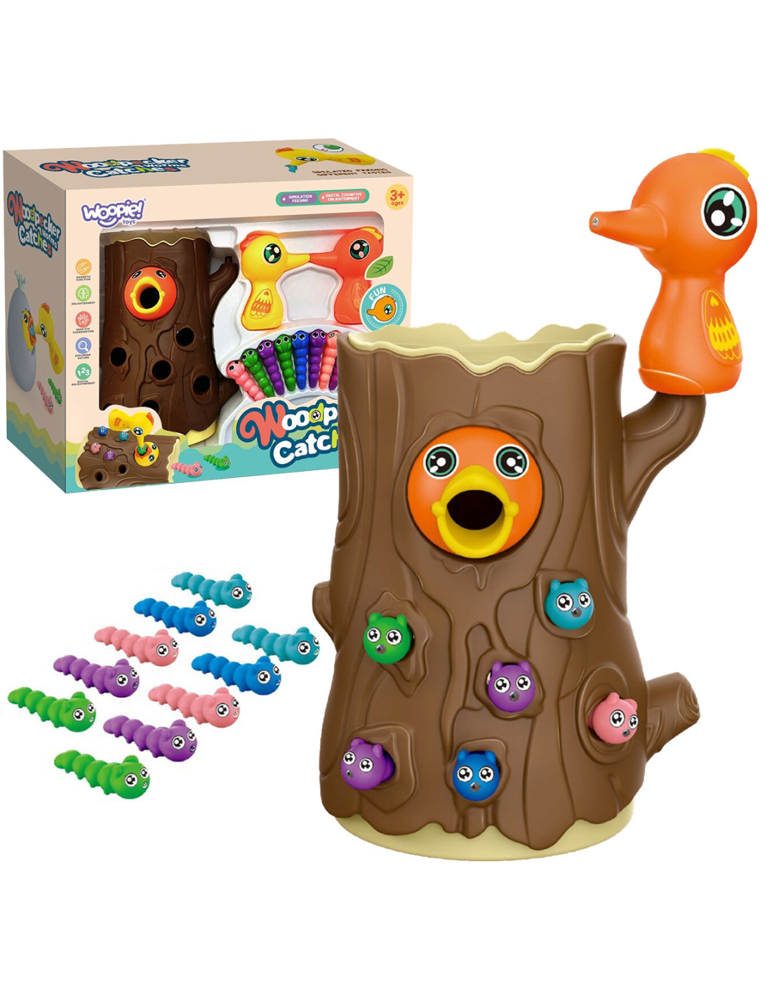Gra Zręcznościowa Złap Robaczka od marki WOOPIE to doskonały sposób na wspólne spędzanie czasu z dzieckiem. Proste zasady oraz intuicyjna obsługa sprawiają, że zagrać w nią może praktycznie każdy. Zabawa polega na chwytaniu dzięciołem zakończonym magnesem robaczków ukrytych w otworkach znajdujących się w drzewie, a następnie na ich ponownym wkładaniu w dziób ptaszka. W zestawie: 2 dzięcioły do karmienia pisklaka, kłoda z pisklakiem i 10 robaków. Zestawem może się bawić jednocześnie dwoje dzieci. Gra uczy przez zabawę - pomoże rozwinąć m. in. umiejętności motoryczne (ruchowe) oraz wzrokowe. Zabawka jest sporym wyzwaniem dla malucha, wymaga skupienia uwagi oraz sprawności manualnej, ale przez to niezwykle zaciekawi dziecko.