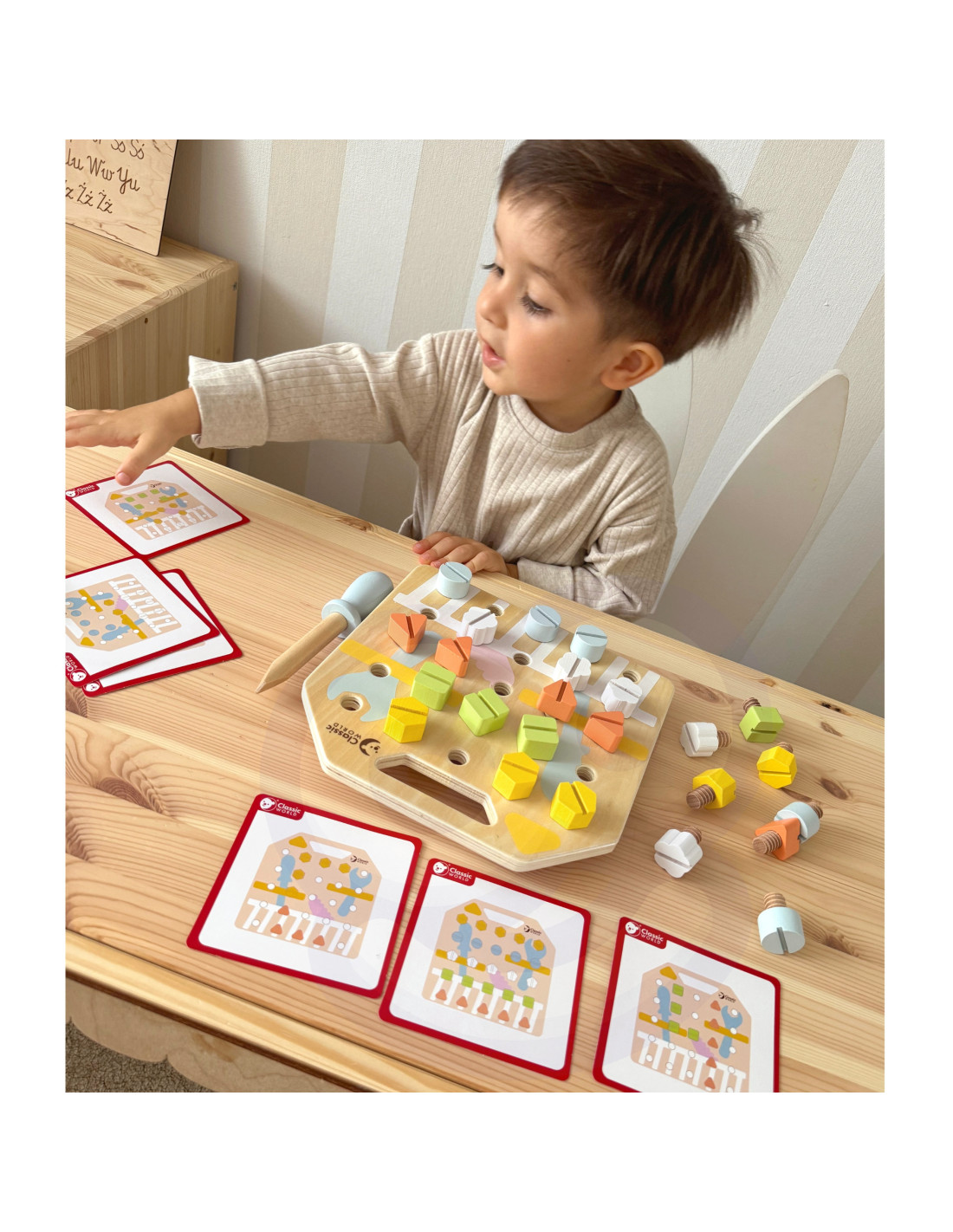Drewniana tablica ze śrubkami od marki CLASSIC WORLD jest zabawką stworzoną z myślą o rozwoju dziecka poprzez dobrą zabawę. Gra polega na wkręcaniu śrubek do tablicy tworząc z nich różne kształty. Zestaw zawiera m.in. karty ze wzorami, które dziecko może wykonać w zabawie np. "na pamięć" razem z rodzicem.